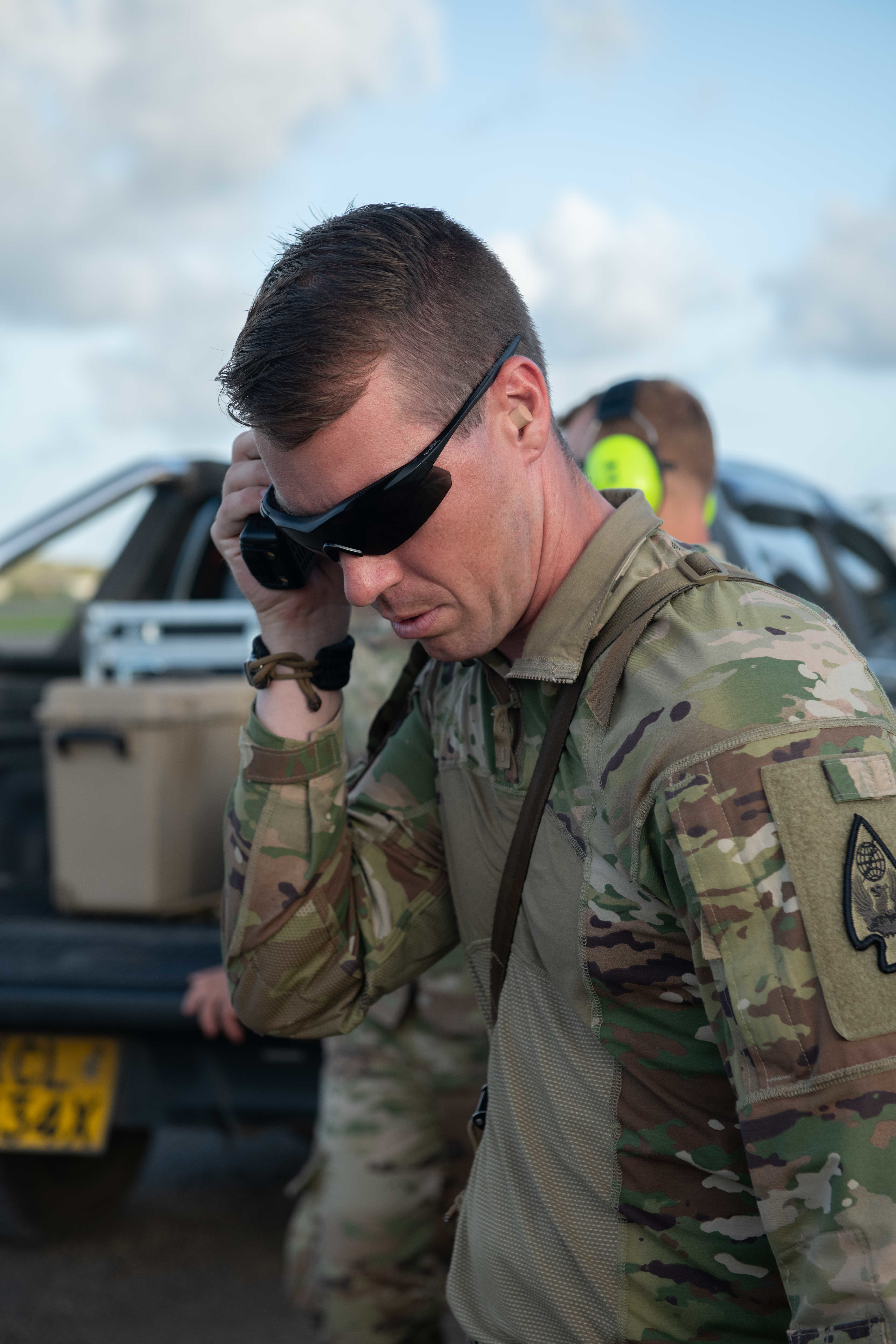 U.S. Army Sgt. Kevin Kirkley, an aviation operations sergeant with the 2-111 Airfield Operations Battalion (AOB), in support of Combined Joint Task Force - Horn of Africa (CJTF-HOA), listens to air traffic controllers on a hand radio at Manda Bay Airstrip, Kenya, June 3, 2021. The 2-111 AOB has been working diligently to establish safe airfield operations at the Manda Bay Airstrip. (U.S. Air Force photo by Senior Airman Morgan L. Brown)
