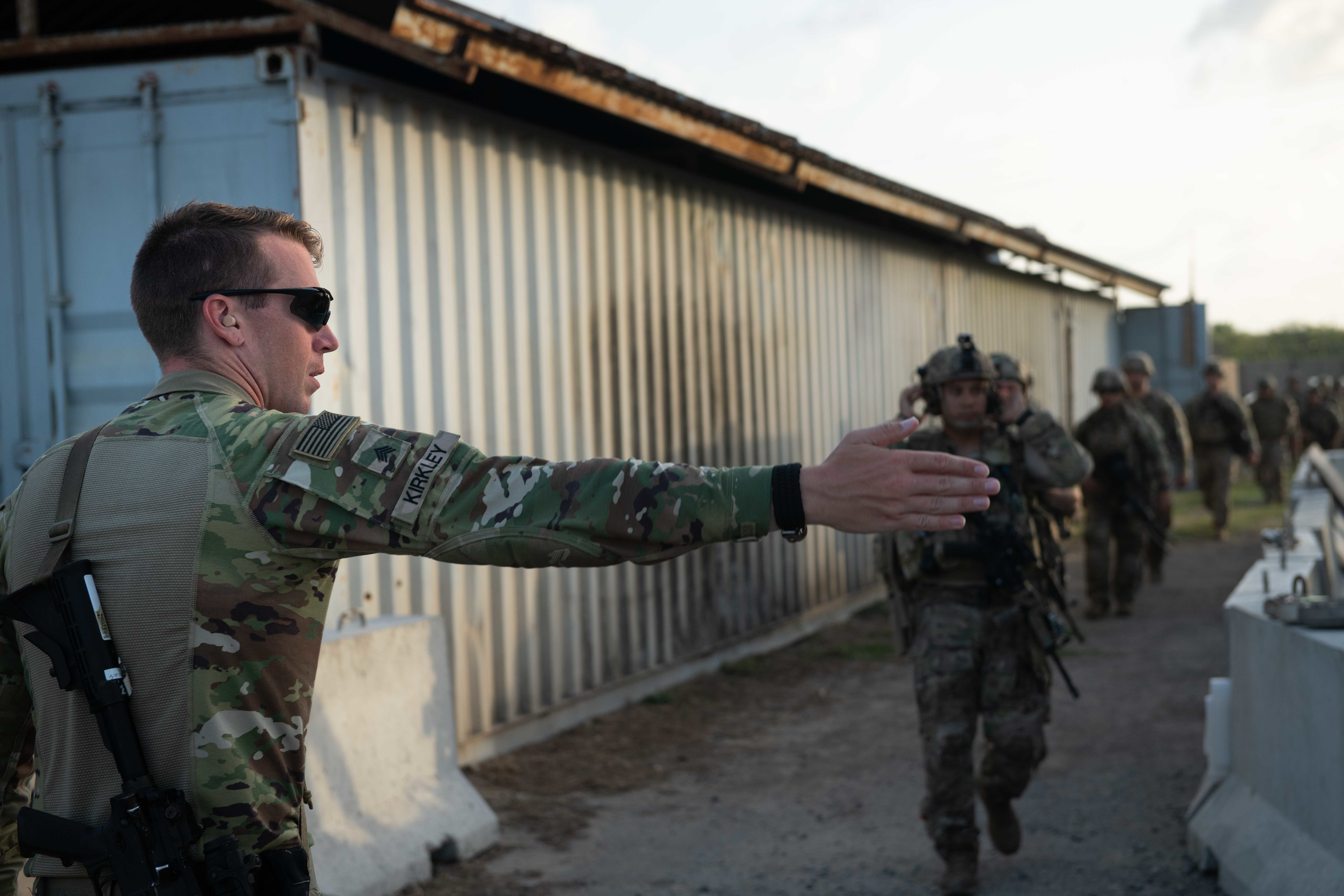 U.S. Army Sgt. Kevin Kirkley, an aviation operations sergeant with the 2-111 Airfield Operations Battalion (AOB), in support of Combined Joint Task Force - Horn of Africa (CJTF-HOA), directs soldiers to the C-130 Hercules at Manda Bay Airstrip, Kenya, June 3, 2021. The 2-111 AOB has been working diligently to establish safe airfield operations at the Manda Bay Airstrip. (U.S. Air Force photo by Senior Airman Morgan L. Brown)