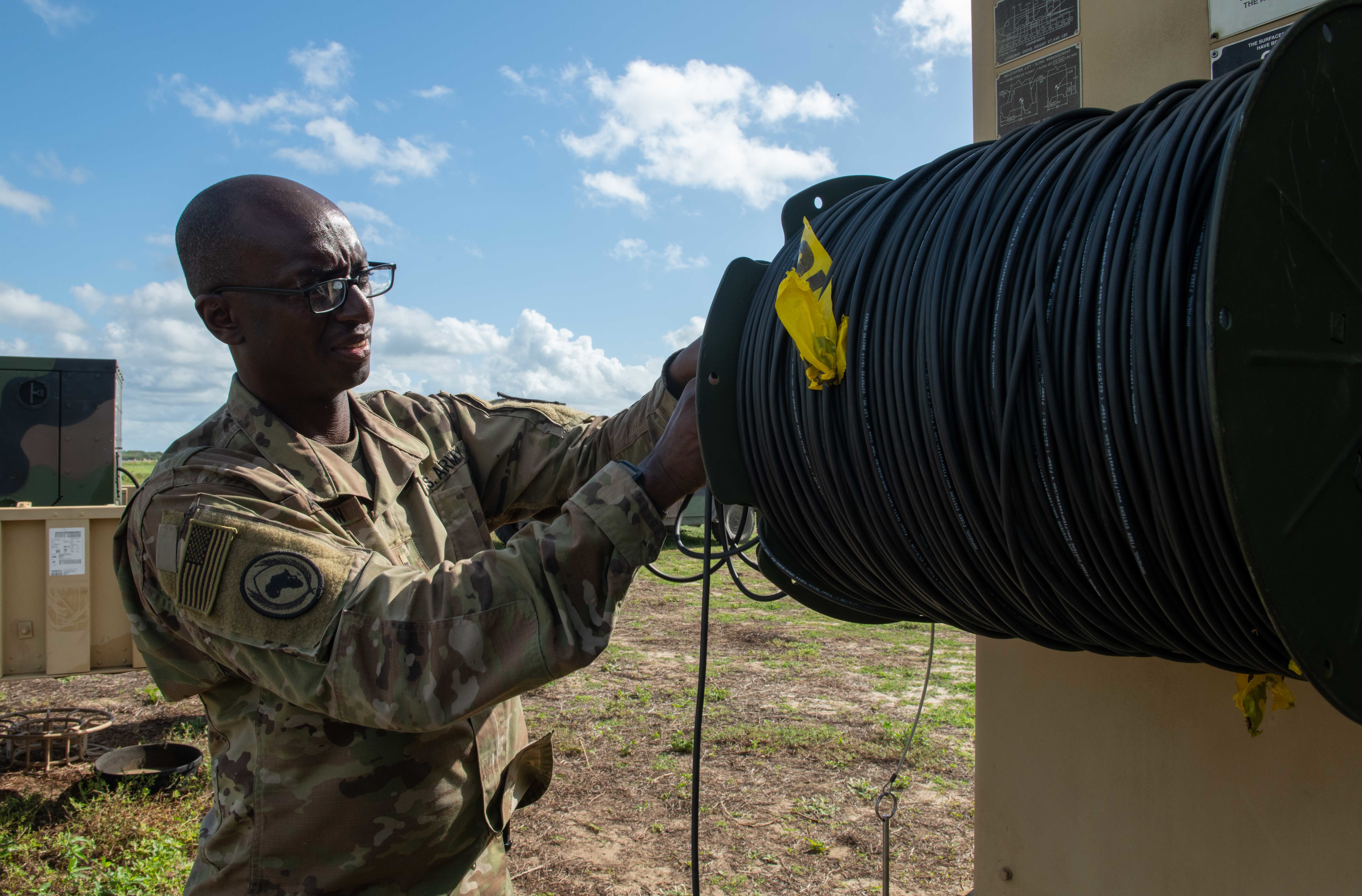 U.S. Army Warrant Officer Paul Anderson, an air traffic control equipment repair specialist with the 2-111 Airfield Operations Battalion (AOB), in support of Combined Joint Task Force - Horn of Africa (CJTF-HOA), unrolls a fiber wire for the airport surveillance radar (ASR) system at Manda Bay Airstrip, Kenya, June 5, 2021. Anderson runs routine tests on the radar system to ensure it remains fully functioning during contingency operations. (U.S. Air Force photo by Senior Airman Morgan L. Brown)