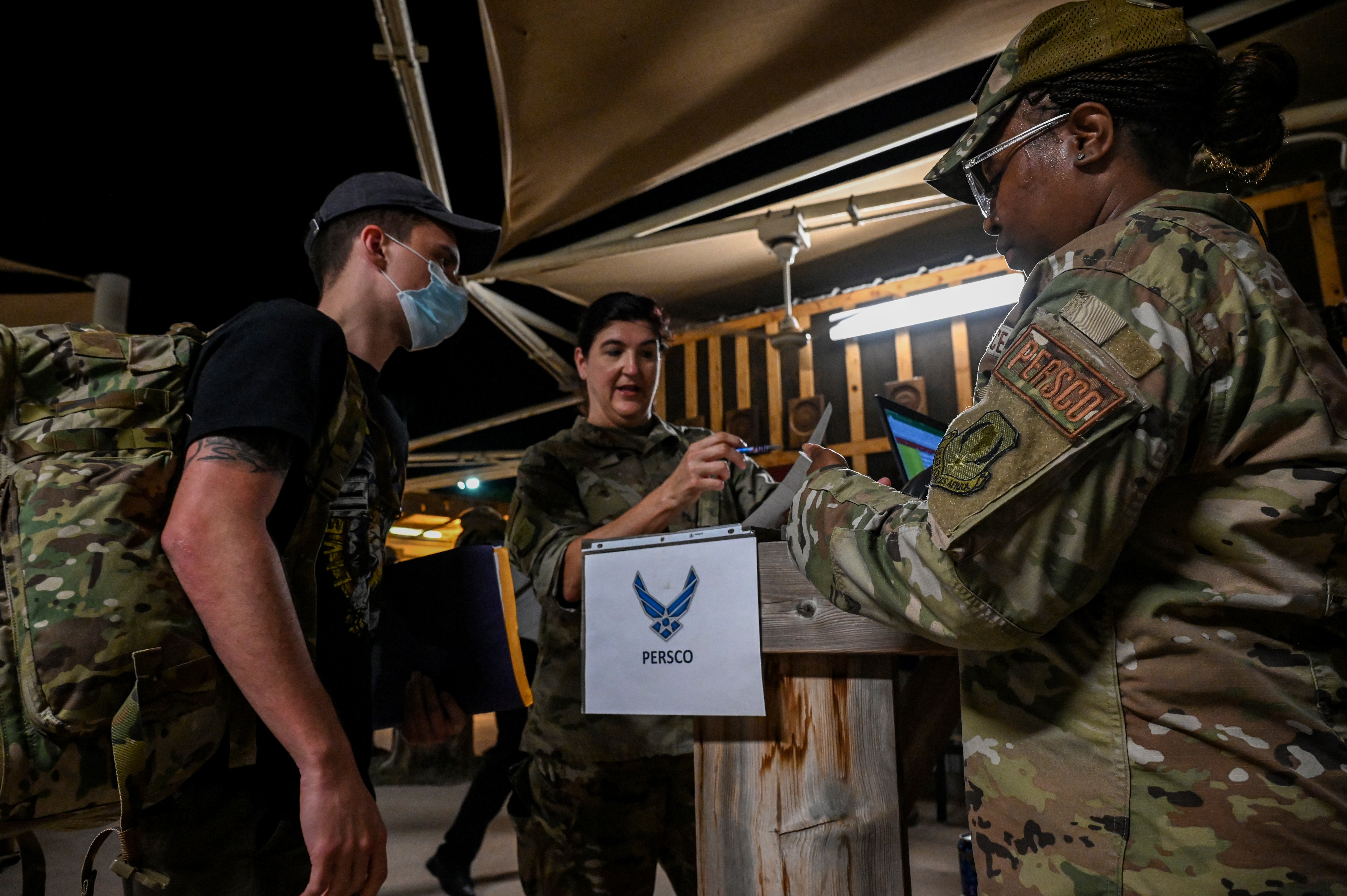 ‘’Our number one priority is to maintain total force accountability,” said U.S. Air Force Tech. Sgt. Shatoria Davis, the PERSCO team chief with the 449th AEG. “COVID changed the way people arrive, so not only did we flex with the change in our schedule, we had additional jobs we don’t usually do.”