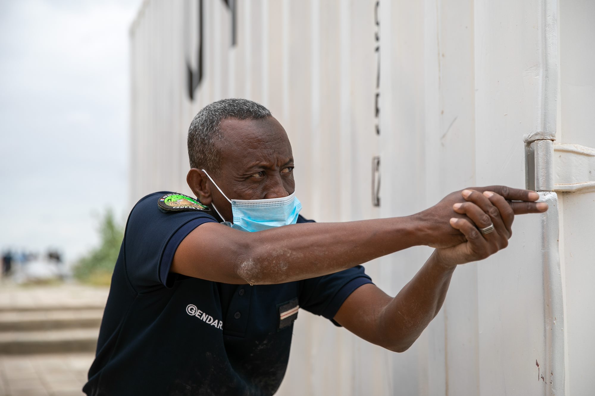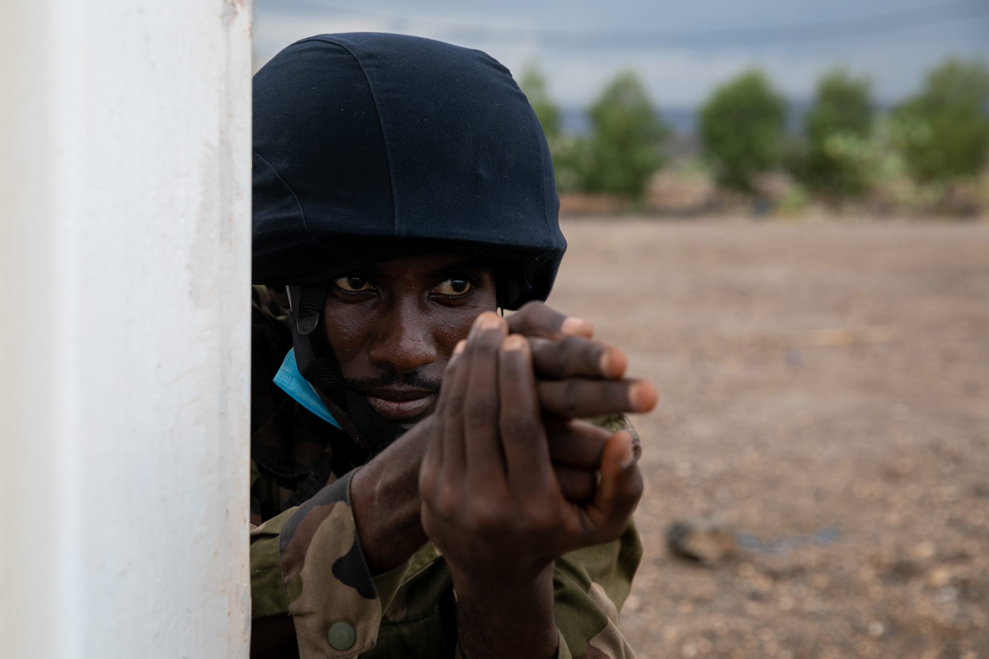 A member of the Djiboutian Gendarmerie provides simulated security during a training lane at a medical knowledge exchange at the Gendarmerie compound in Djibouti City, Djibouti, Jan. 17, 2022. Civil Affairs Soldiers from Combined Joint Task Force – Horn of Africa partnered with the Gendarmerie at their mobile unit for a four-day event which allowed both parties to share their medical practices and tactics through educational comparisons and hands-on practical application. CJTF-HOA, operating from Camp Lemonnier, Djibouti, regularly trains with and works alongside allied and partner nations, coalition forces and interagency/intergovernmental organizations to achieve a unified effort in East Africa. (U.S. Army National Guard photo by Spc. Gauret Stearns)