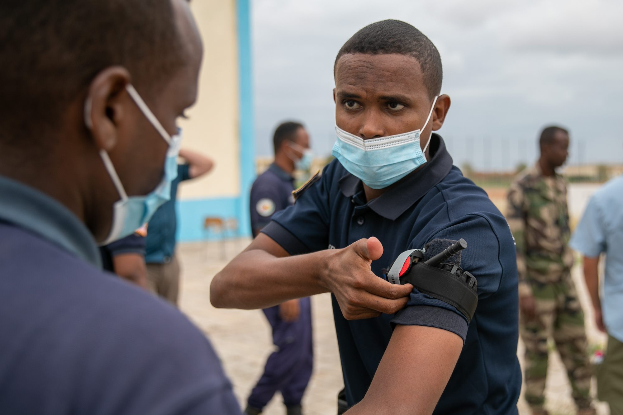 A member of the Djiboutian Gendarmerie self-applies a tourniquet during a medical knowledge exchange at the Gendarmerie compound in Djibouti City, Djibouti, Jan. 17, 2022. Civil Affairs Soldiers from Combined Joint Task Force – Horn of Africa partnered with the Gendarmerie at their mobile unit for a four-day event which allowed both parties to share their medical practices and tactics through educational comparisons and hands-on practical application. CJTF-HOA, operating from Camp Lemonnier, Djibouti, regularly trains with and works alongside allied and partner nations, coalition forces and interagency/intergovernmental organizations to achieve a unified effort in East Africa. (U.S. Army National Guard photo by Spc. Gauret Stearns)