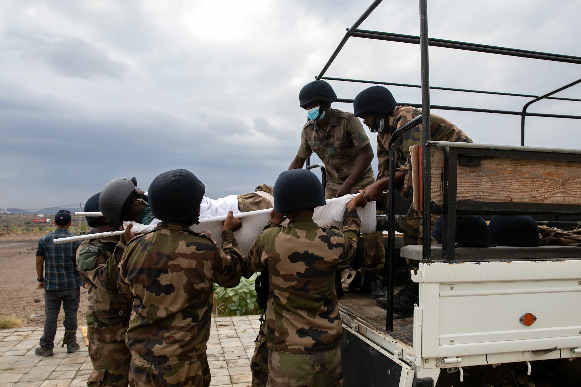 Members of the Djiboutian Gendarmerie load a simulated casualty onto a truck during a medical knowledge exchange at the Gendarmerie compound in Djibouti City, Djibouti, Jan. 17, 2022. Civil Affairs Soldiers from Combined Joint Task Force – Horn of Africa partnered with the Gendarmerie at their mobile unit for a four-day event which allowed both parties to share their medical practices and tactics through educational comparisons and hands-on practical application. CJTF-HOA, operating from Camp Lemonnier, Djibouti, regularly trains with and works alongside allied and partner nations, coalition forces and interagency/intergovernmental organizations to achieve a unified effort in East Africa. (U.S. Army National Guard photo by Spc. Gauret Stearns)