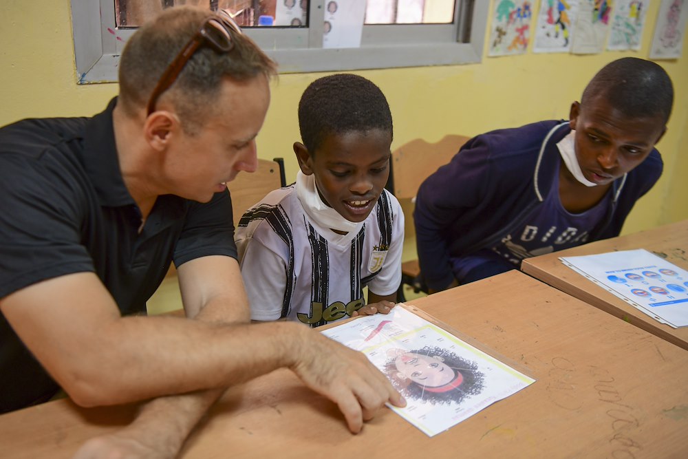 U.S. Army Staff Sgt. Ben Montreuil, a 403rd Civil Affairs Battalion (Airborne) civil affairs specialist, teaches children oral hygiene basics at Caritas Orphanage, Djibouti, March 7, 2022. The oral hygiene course consisted of brushing and flossing teeth, identifying cephalic body parts and learning basic oral hygiene practices. Members with the 403rd CAB support Combined Joint Task Force – Horn of Africa by specializing in strengthening partnerships throughout East Africa. The 403rd CAB offers the oral hygiene class weekly and helps between 60-185 children per class. (U.S. Air Force photo by Senior Airman Blake Wiles)
