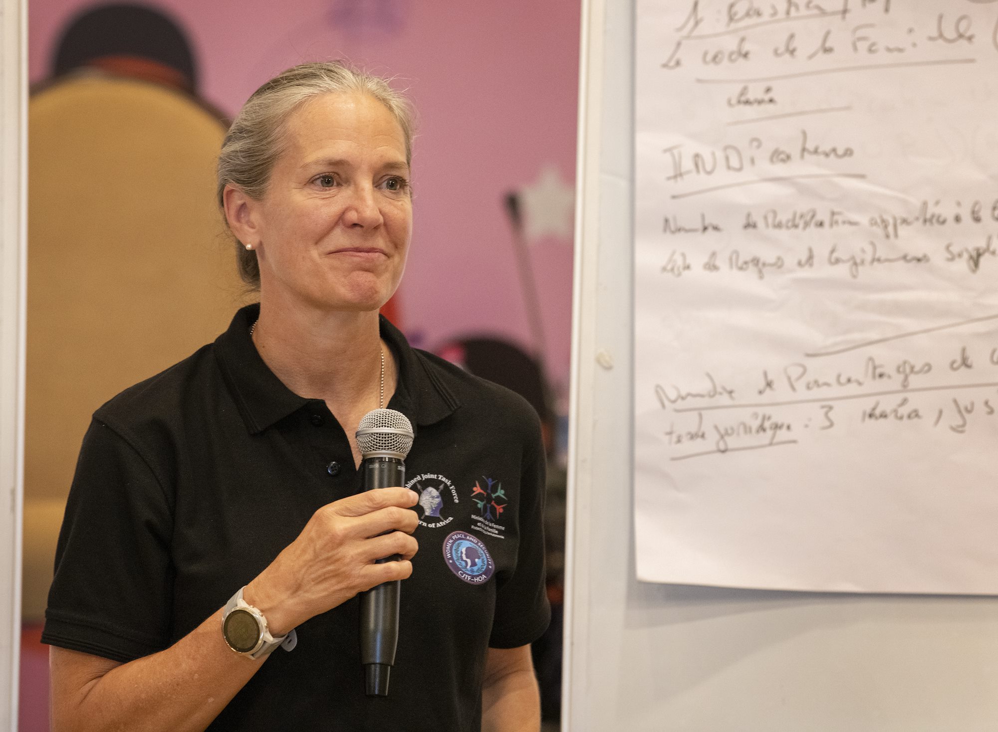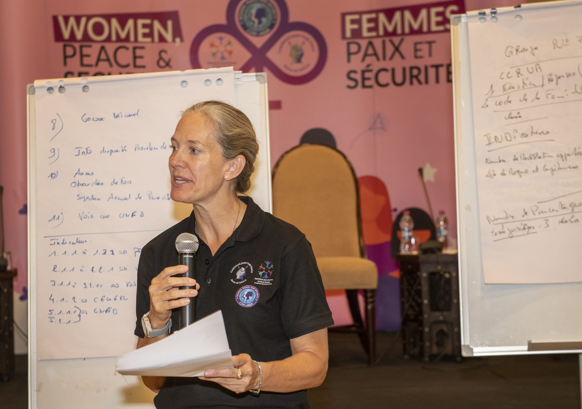 U.S. Army Maj. Gen. Jami Shawley, incoming commander of the Combined Joint Task Force – Horn of Africa (CJTF-HOA), participates in group work during a Women, Peace and Security (WPS) workshop at the Palace Kempinski, Djibouti, May 8, 2022. The workshop focused on collaboration between the U.S. Department of Defense, U.S. Department of State and the Ministry of Women and Family to update Djibouti's WPS National Action Plan (NAP). WPS is an integral component of U.S. Africa Command’s effort enhancing African partner capability and enabling U.S. security cooperation to better advance contributions by both men and women. (U.S. Air Force photo by Tech. Sgt. Lynette M. Rolen)