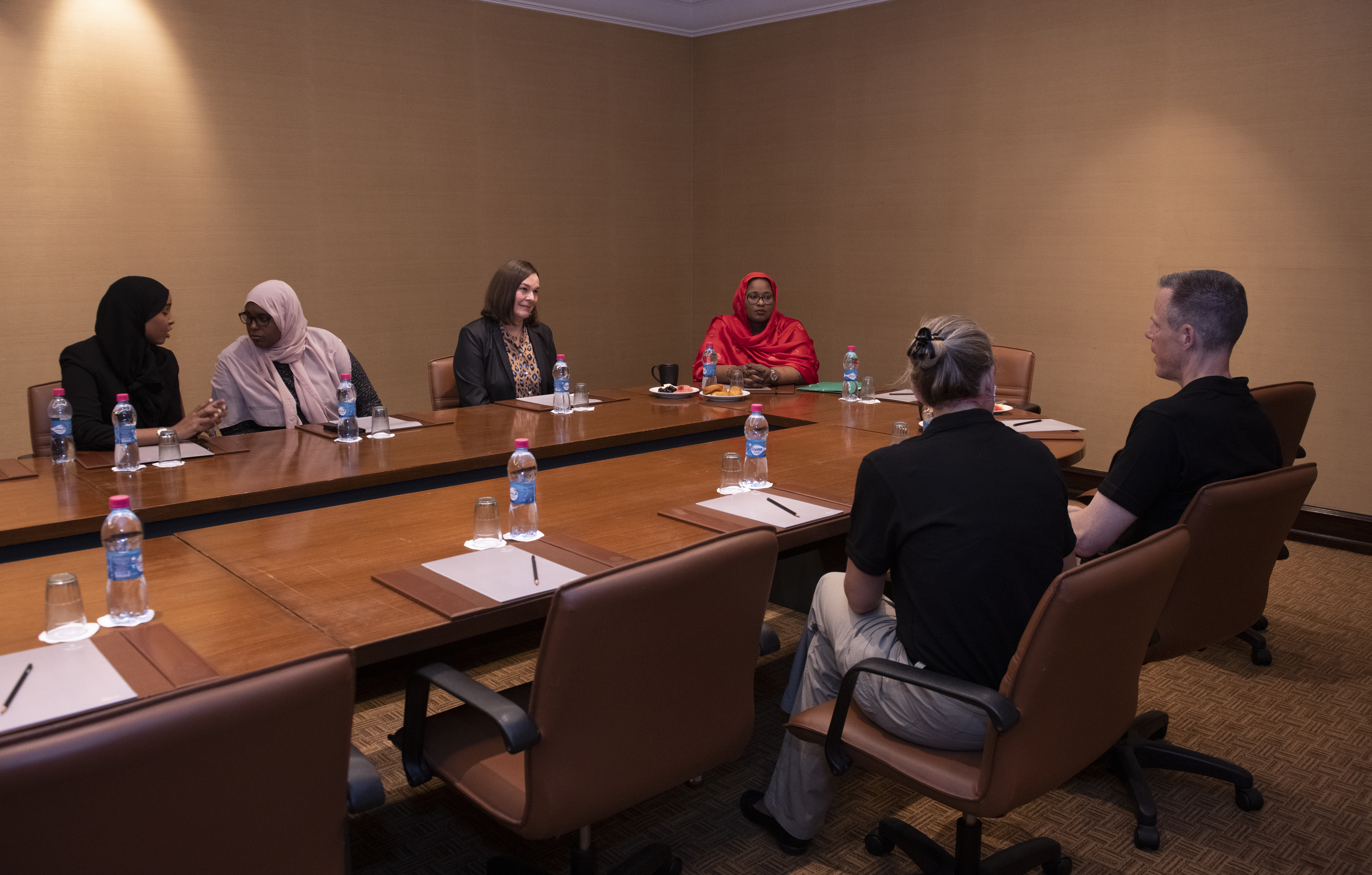 U.S. Army Maj. Gen. William Zana, outgoing commander of the Combined Joint Task Force - Horn of Africa (CJTF-HOA), and U.S. Army Maj. Gen. Jami Shawley, incoming commander of CJTF-HOA, meet with Mouna Osman Aden, the Minister of Women and Family in Djibouti, during a Women, Peace and Security (WPS) workshop at the Palace Kempinski, Djibouti, May 8, 2022. The workshop focused on collaboration between the U.S. Department of Defense, U.S. Department of State and the Ministry of Women and Family to update Djibouti's WPS National Action Plan (NAP). WPS is an integral component of U.S. Africa Command’s effort enhancing African partner capability and enabling U.S. security cooperation to better advance contributions by both men and women. (U.S. Air Force photo by Tech. Sgt. Lynette M. Rolen)