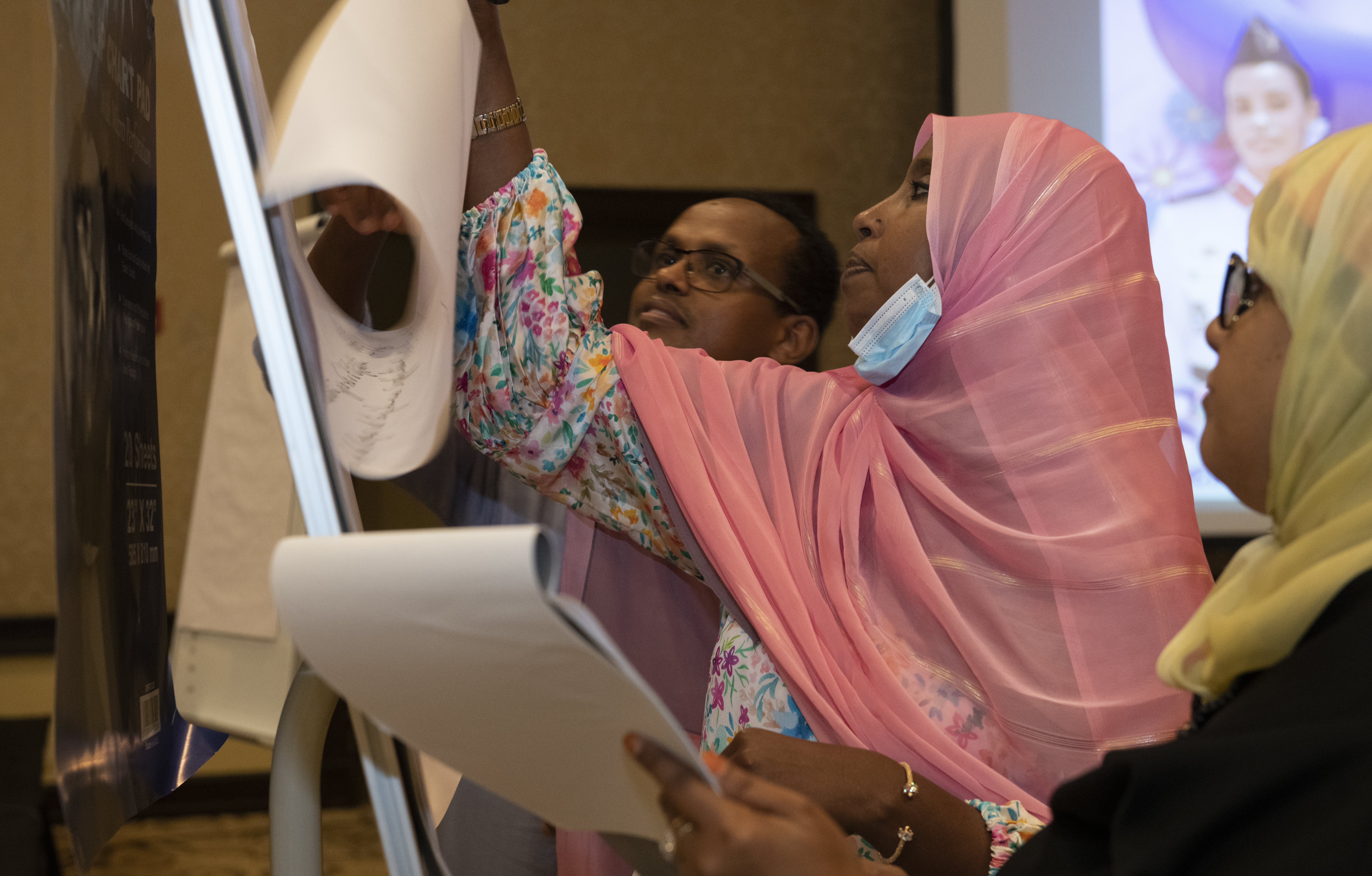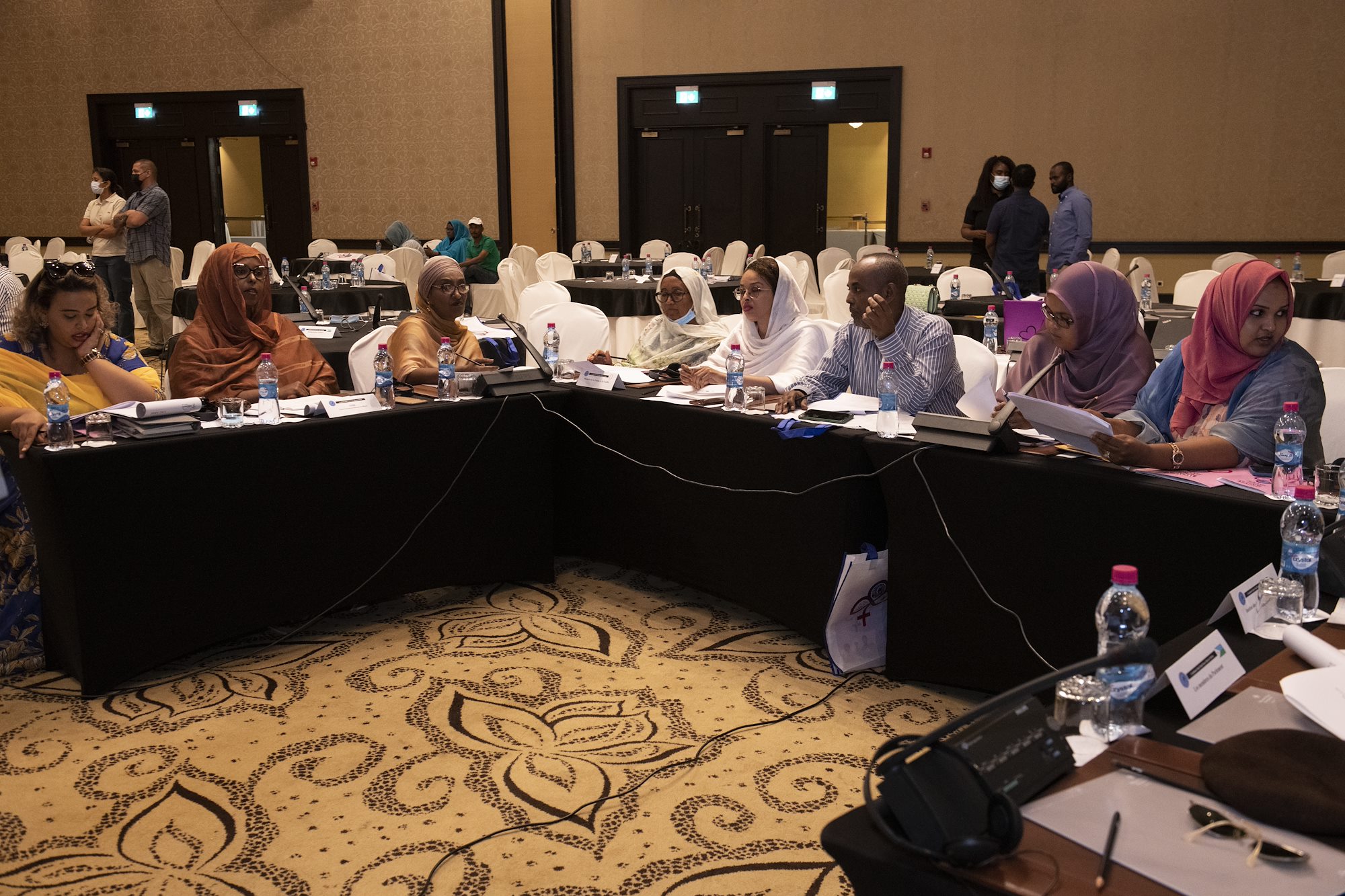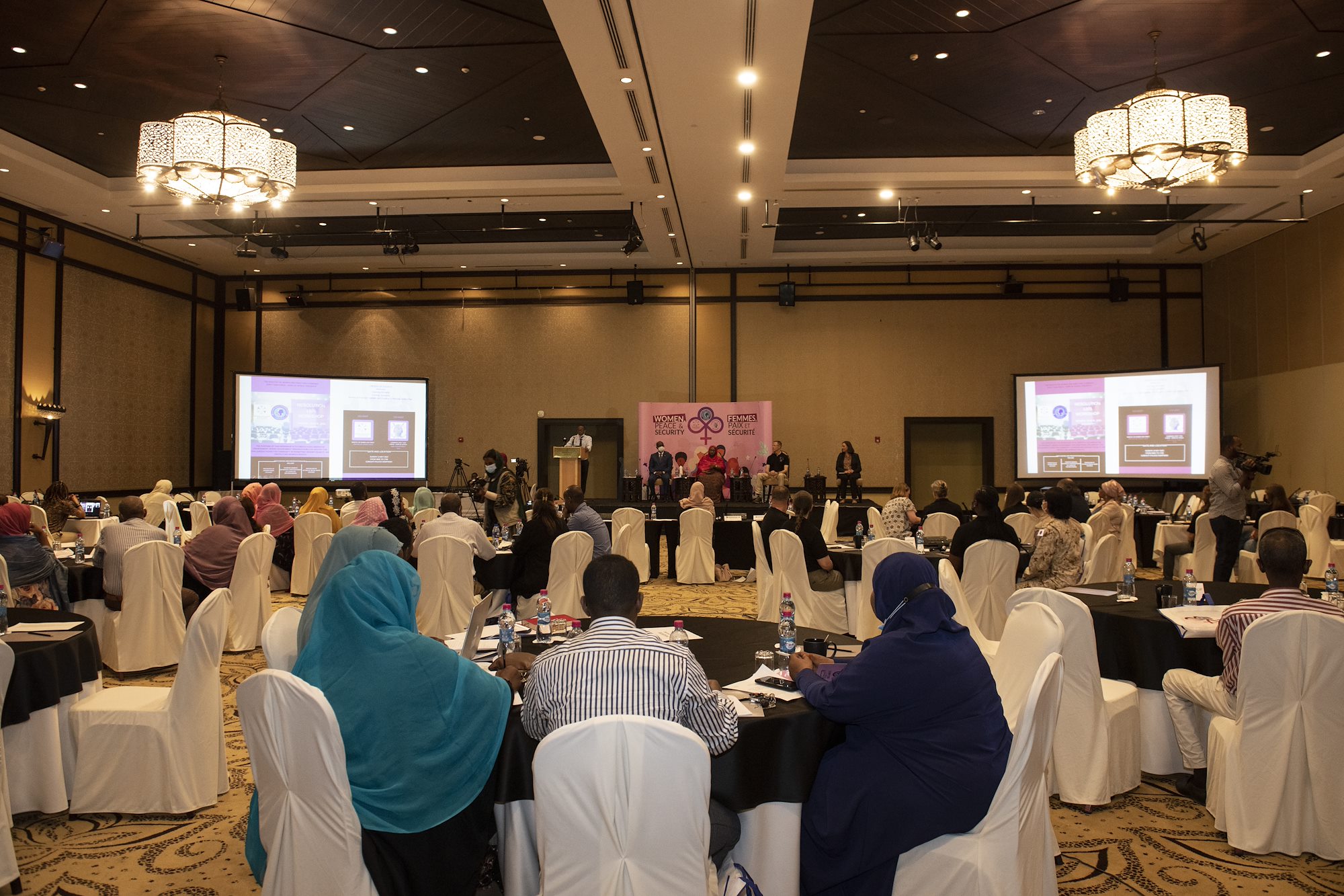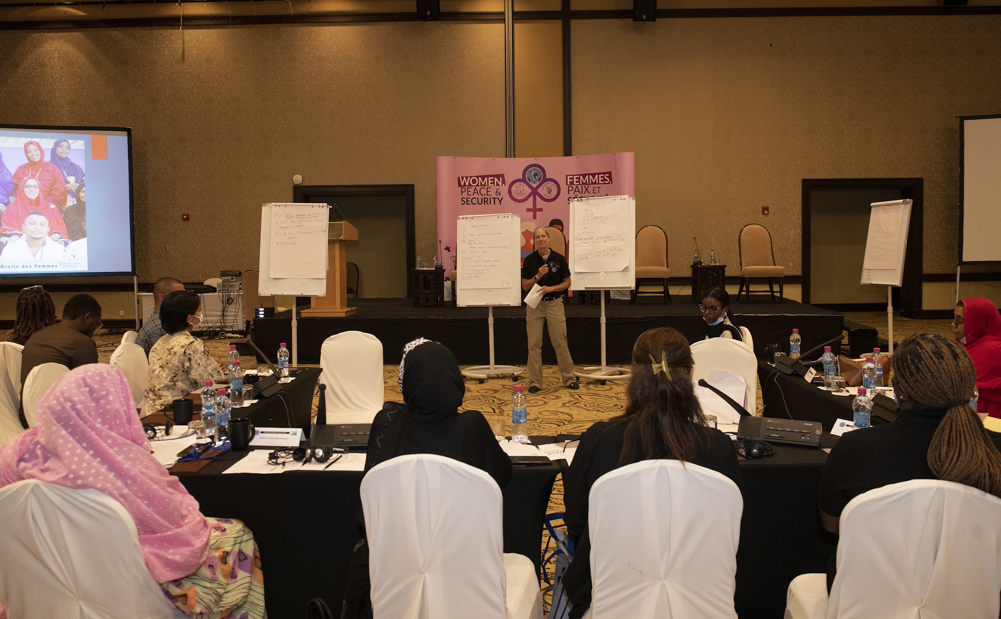Participants of a Women, Peace and Security (WPS) workshop observe a presentation at the Palace Kempinski, Djibouti, May 8, 2022. The workshop focused on collaboration between the U.S. Department of Defense, U.S. Department of State and the Ministry of Women and Family to update Djibouti's WPS National Action Plan (NAP). WPS is an integral component of U.S. Africa Command’s effort enhancing African partner capability and enabling U.S. security cooperation to better advance contributions by both men and women. (U.S. Air Force photo by Tech. Sgt. Lynette M. Rolen)