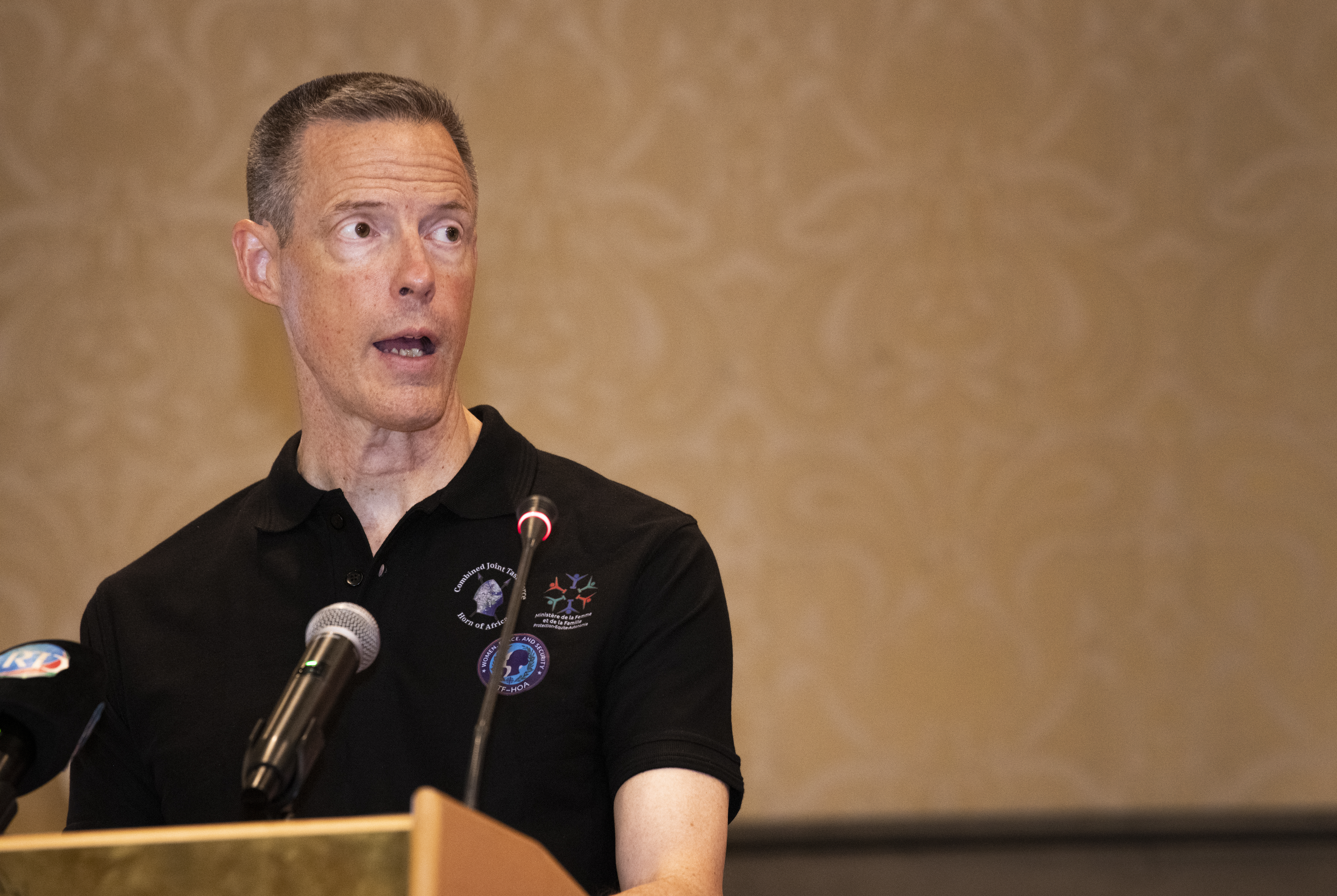 U.S. Army Maj. Gen. William Zana, outgoing commander of the Combined Joint Task Force – Horn of Africa, discusses the partnership of Djiboutian leaders, U.S. military, and the U.S. Embassy during a Women, Peace and Security workshop at the Palace Kempinski, Djibouti, May 8, 2022. The workshop focused on collaboration between the U.S. Department of Defense, U.S. Department of State and the Ministry of Women and Family to update Djibouti's WPS National Action Plan (NAP). WPS is an integral component of U.S. Africa Command’s effort enhancing African partner capability and enabling U.S. security cooperation to better advance contributions by both men and women. (U.S. Air Force photo by Tech. Sgt. Lynette M. Rolen)