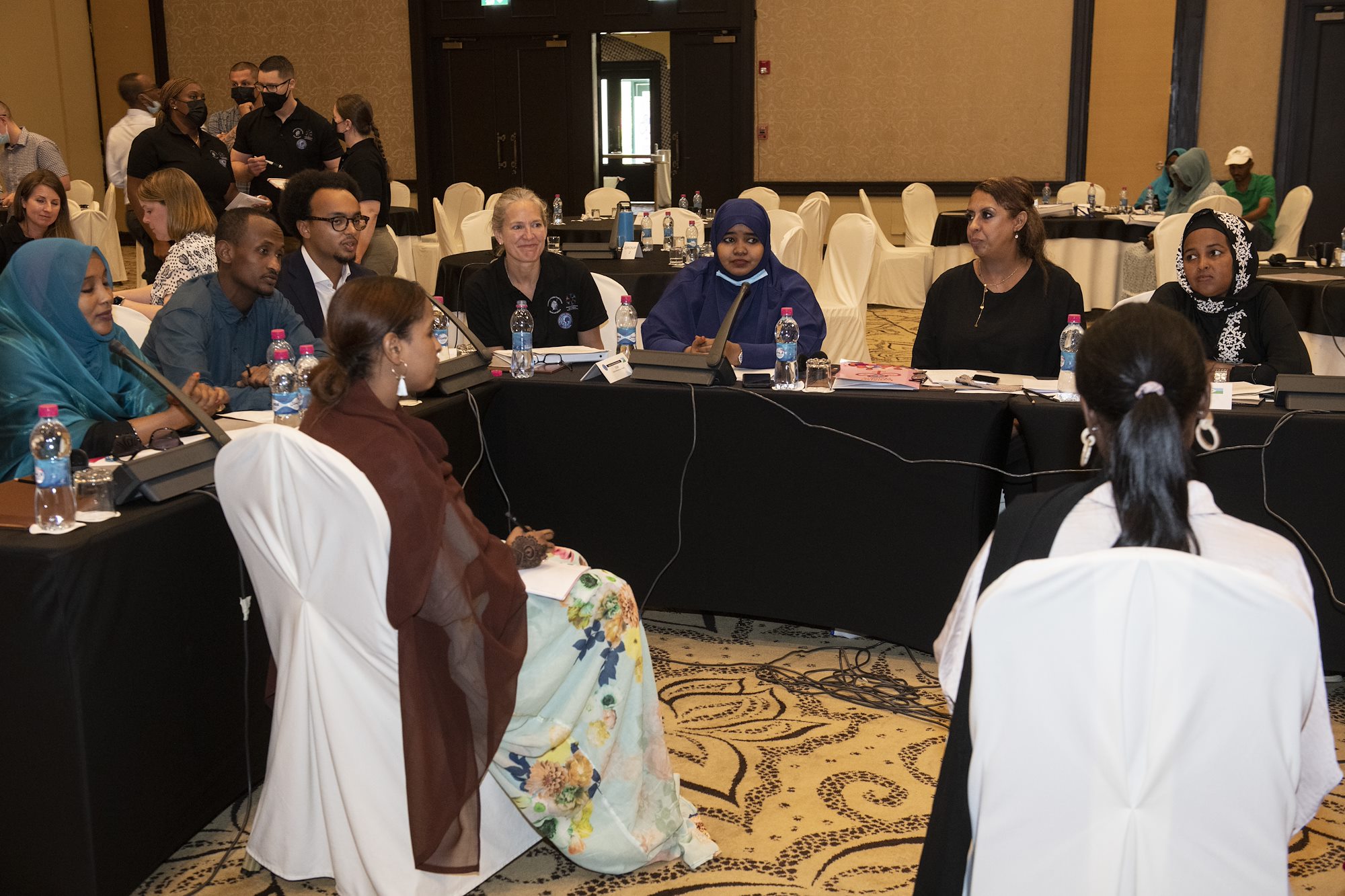 Participants of a Women, Peace and Security (WPS) workshop engage in group discussion at the Palace Kempinski, Djibouti, May 8, 2022. The workshop focused on collaboration between the U.S. Department of Defense, U.S. Department of State and the Ministry of Women and Family to update Djibouti's WPS National Action Plan (NAP). WPS is an integral component of U.S. Africa Command’s effort enhancing African partner capability and enabling U.S. security cooperation to better advance contributions by both men and women. (U.S. Air Force photo by Tech. Sgt. Lynette M. Rolen)