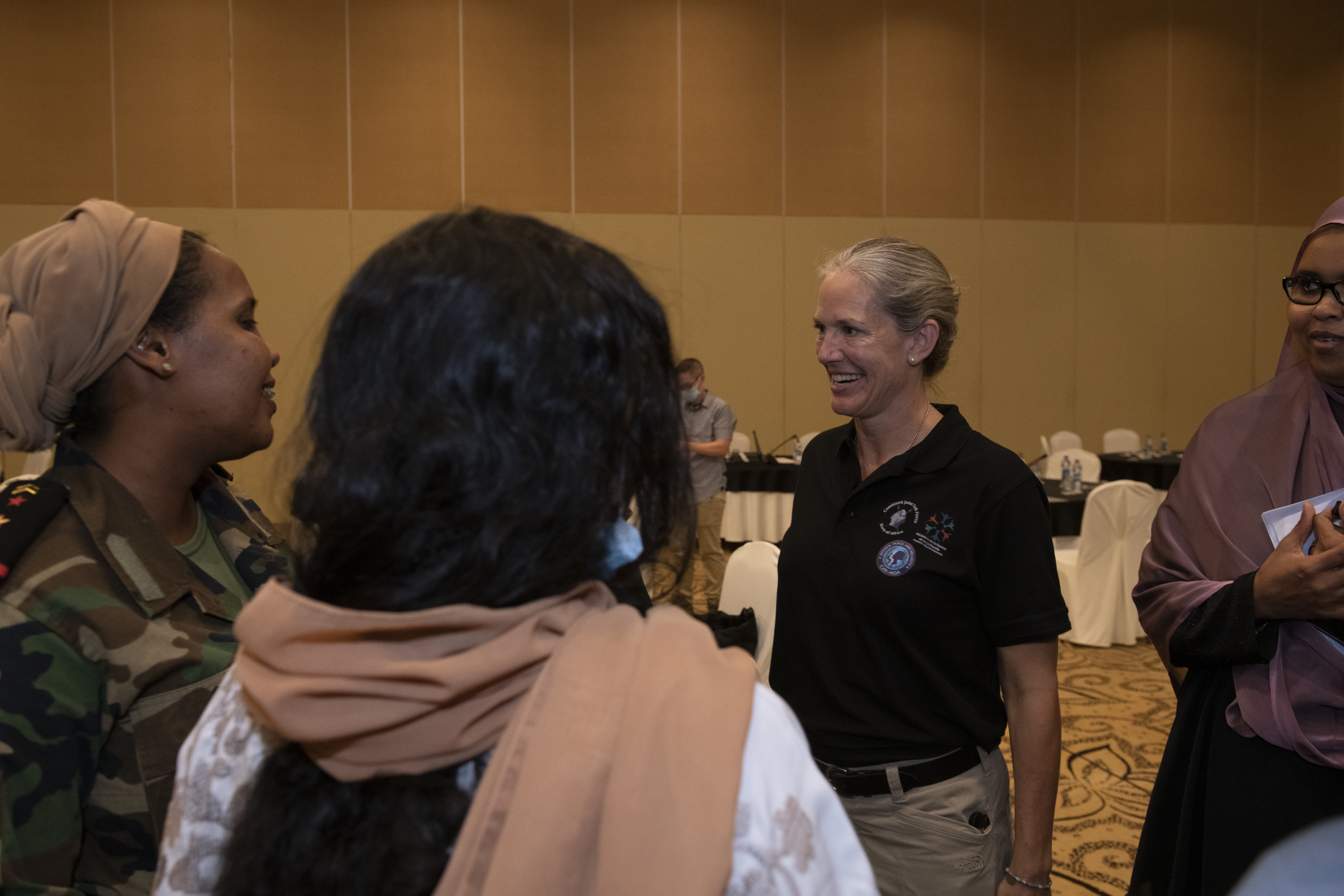 U.S. Army Maj. Gen. Jami Shawley, incoming commander of the Combined Joint Task Force – Horn of Africa (CJTF-HOA), speaks with participants of a Women, Peace and Security (WPS) workshop at the Palace Kempinski, Djibouti, May 8, 2022. The workshop focused on collaboration between the U.S. Department of Defense, U.S. Department of State and the Ministry of Women and Family to update Djibouti's WPS National Action Plan (NAP). WPS is an integral component of U.S. Africa Command’s effort enhancing African partner capability and enabling U.S. security cooperation to better advance contributions by both men and women. (U.S. Air Force photo by Tech. Sgt. Lynette M. Rolen)