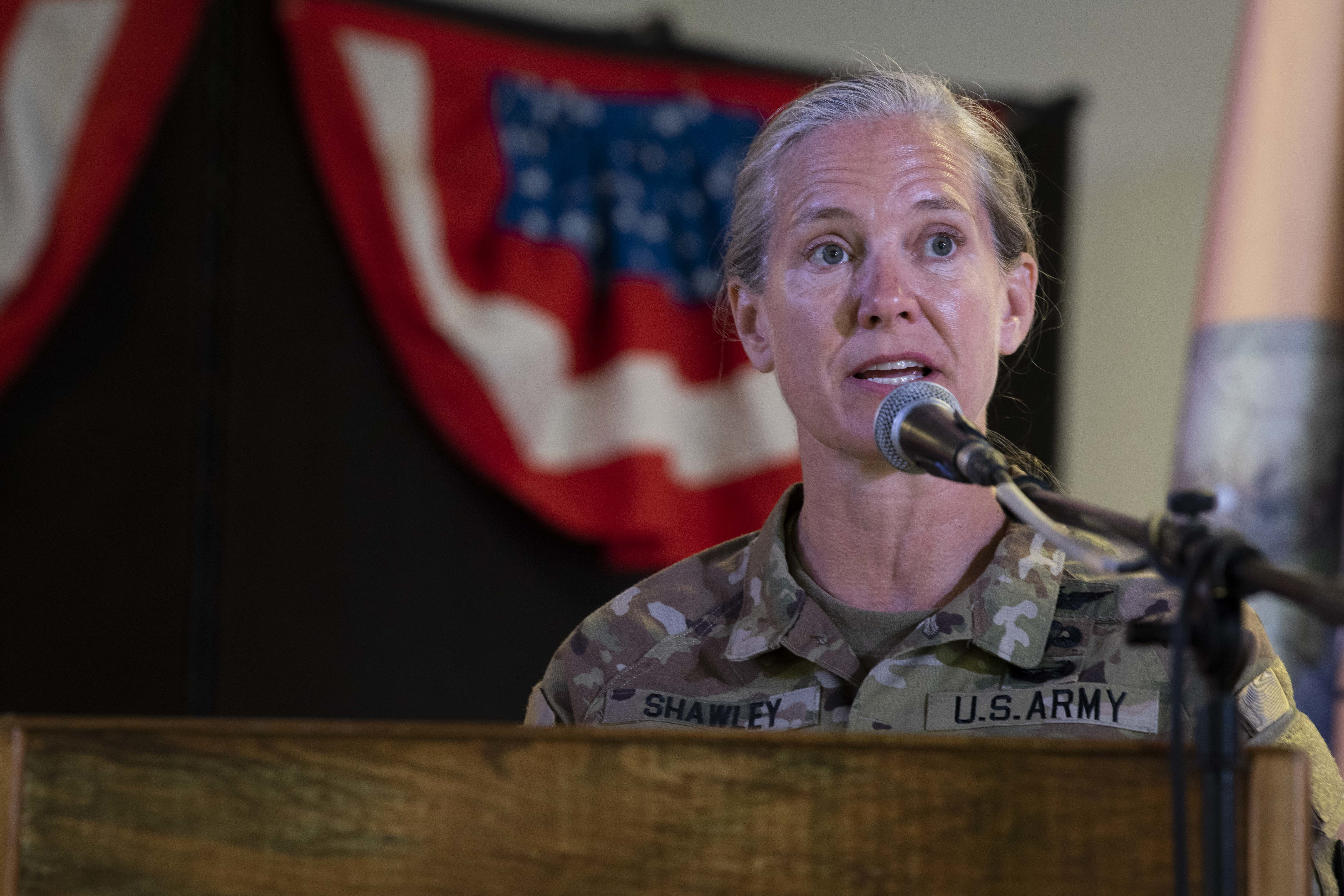 U.S. Army Maj. Gen. Jami Shawley, commander of the Combined Joint Task Force – Horn of Africa, delivers comments during a change of command ceremony at Camp Lemonnier, Djibouti, May 14, 2022. As a dynamic, joint and multinational operational headquarters, CJTF-HOA ensures a strategic partnership with Djibouti, responds to crises, supports operations, protects U.S. lives and enables the countering of violent extremist organizations throughout East Africa in order to enhance stability and prosperity. (U.S. Air Force photo by Tech. Sgt. Lynette M. Rolen)