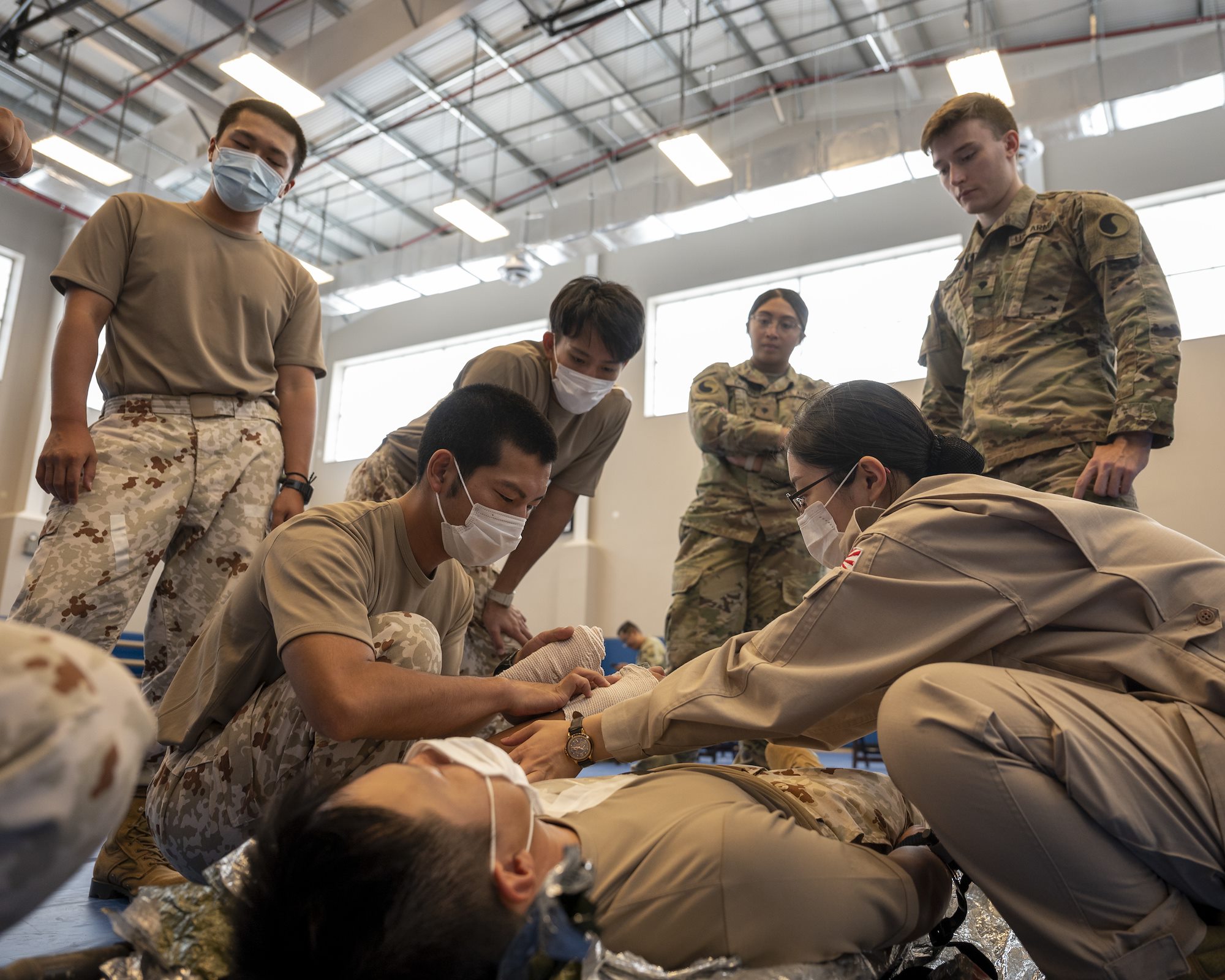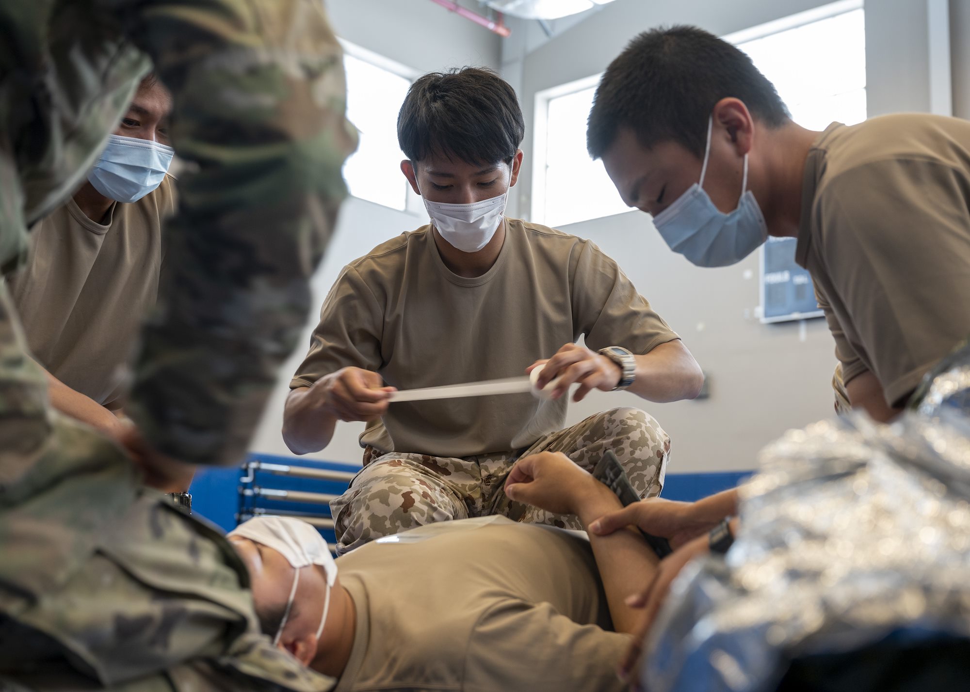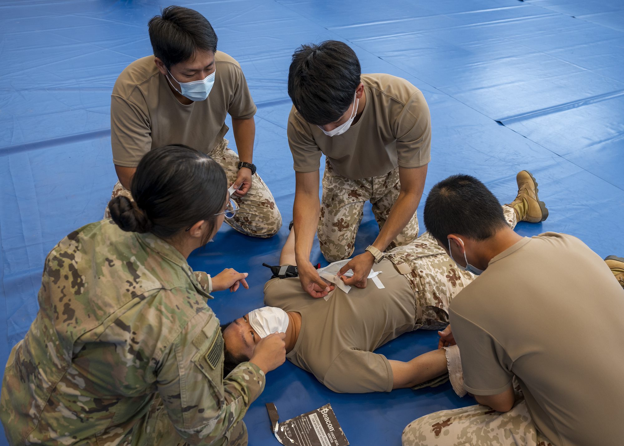 A Japan Ground Self-Defense Force (JGSDF) soldier practices Tactical Combat Casualty Care (TC3) during an information exchange with U.S. medics from Task Force Red Dragon, Combined Joint Task Force - Horn of Africa (CJTF-HOA) at Camp Lemonnier, Djibouti, May 27, 2022. The event allowed U.S. and Japanese forces to exchange information on life-saving combat care and improved overall interoperability between the forces. (U.S. Air Force photo by Senior Airman Mario Calabro).