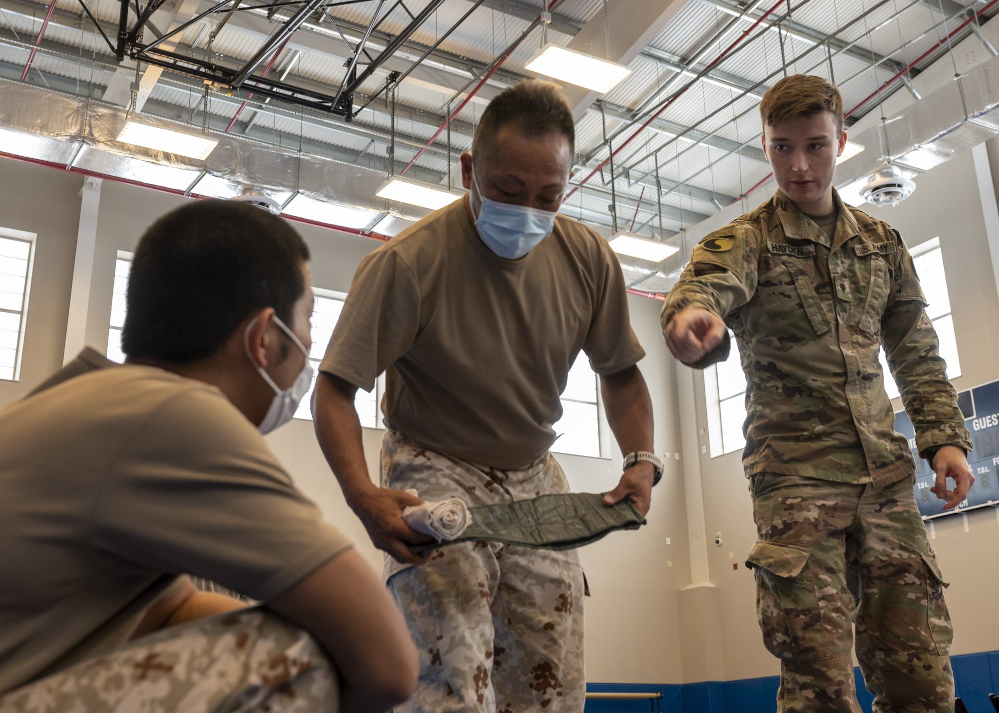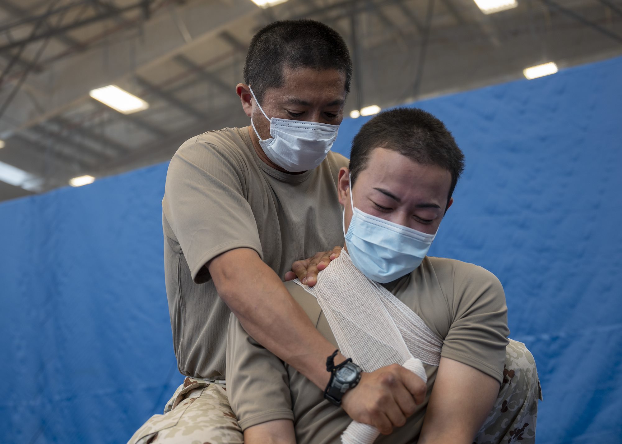 U.S. Army Virginia National Guard Specialist Andrew Hayden with Task Force Red Dragon, Combined Joint Task Force - Horn of Africa, assists a Japan Ground Self-Defense Force (JGSDF) soldier with applying an arm brace during a Tactical Combat Casualty Care (TC3) information exchange at Camp Lemonnier, Djibouti, May 27, 2022. The event allowed U.S. and Japanese forces to exchange information on life-saving combat care and improved overall interoperability between the forces. (U.S. Air Force photo by Senior Airman Mario Calabro).