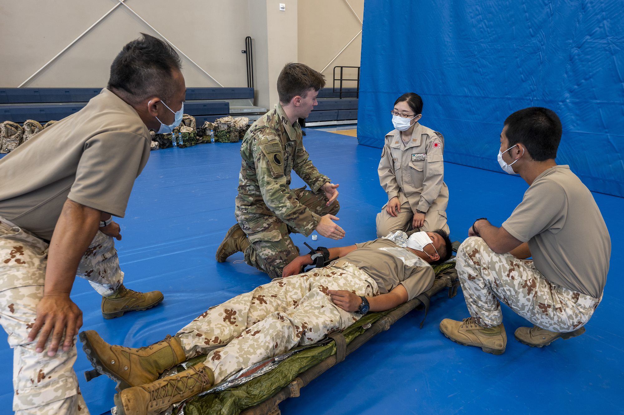 A U.S. Army Soldier with Task Force Red Dragon, Combined Joint Task Force - Horn of Africa, participates in an information exchange on Tactical Combat Casualty Care (TC3) with Japan Ground Self-Defense Force (JGSDF) personnel, who also exchanged their best medical practices at Camp Lemonnier, Djibouti, May 27, 2022. The event allowed U.S. and Japanese forces to exchange information on life-saving combat care and improved overall interoperability between the forces. (U.S. Air Force photo by Senior Airman Mario Calabro).