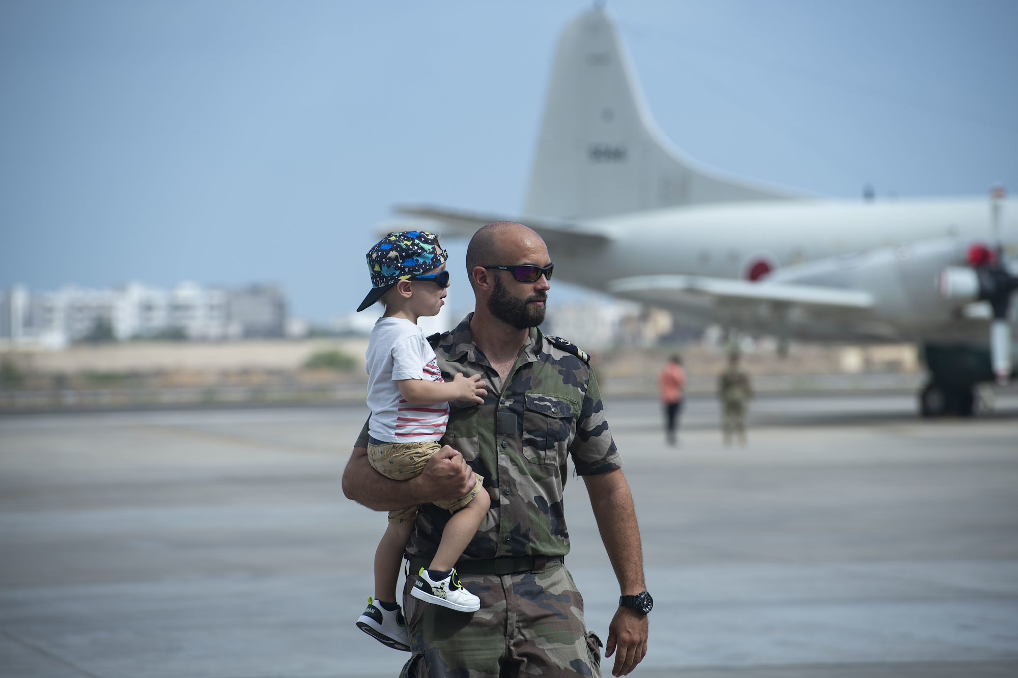 A French military member assigned to the French Forces in Djibouti carries his child during the Combined Joint Task Force - Horn of Africa (CJTF-HOA) Partner Appreciation Day 2022 event at Camp Lemonnier, Djibouti, Nov. 10, 2022. Military members, allies, partners, and the members of the U.S. State Department attended the event to celebrate the enduring partnerships in Africa and learn about the combined military capabilities of CJTF-HOA. (Department of Defense photo by U.S. Senior Airman Destani K. Matheny)