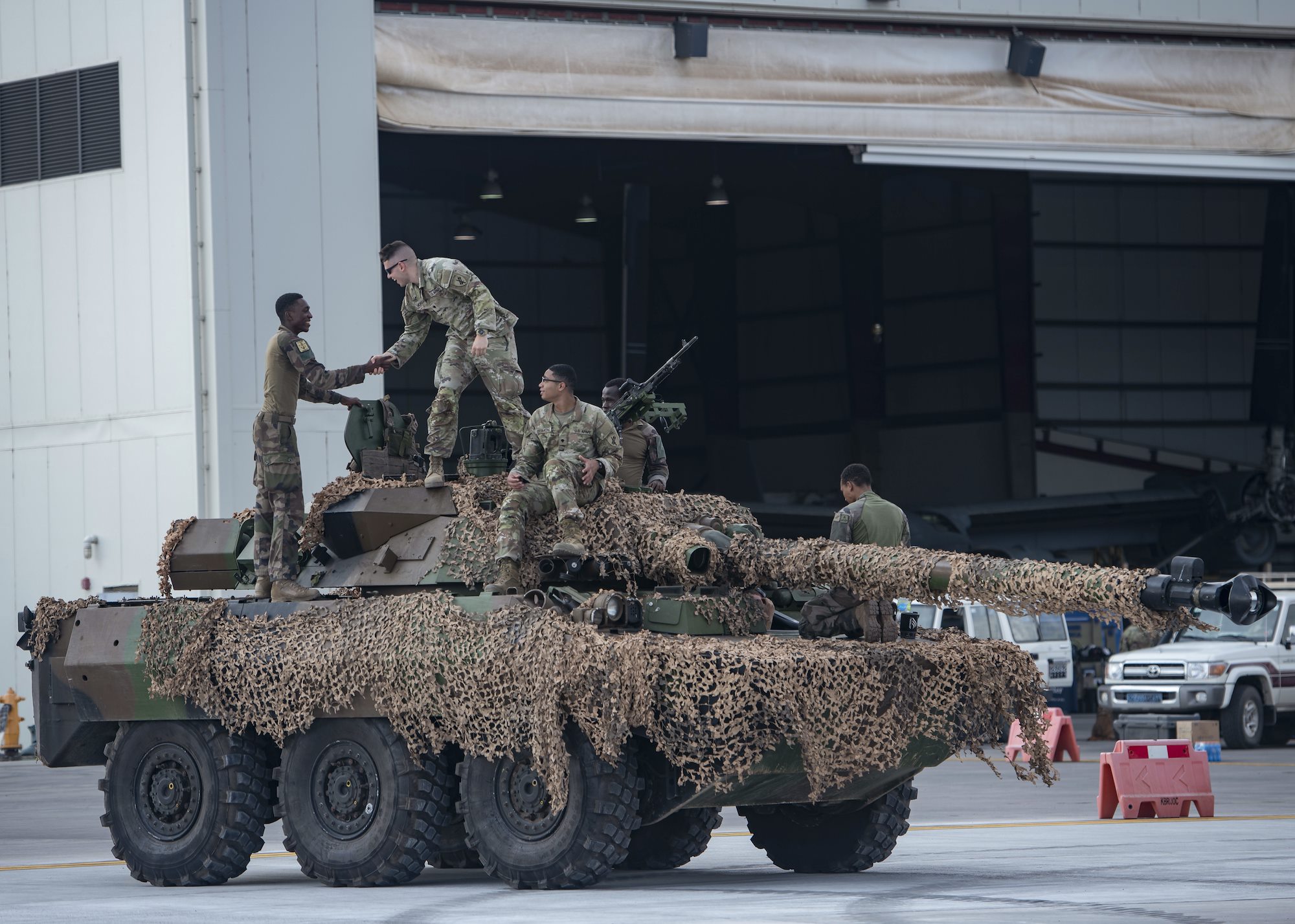 U.S. Soldiers assigned to Combined Joint Task Force - Horn of Africa (CJTF-HOA), receive a capabilities brief from a French Forces in Djibouti service member about the AMX-10 RC wheeled tank during the CJTF-HOA Partner Appreciation Day 2022 celebration at Camp Lemonnier, Djibouti, Nov. 10, 2022. Task force allies and partners set up static and interactive displays to showcase their combined military capabilities. (Department of Defense photo by U.S. Air Force Senior Airman Destani K. Matheny)