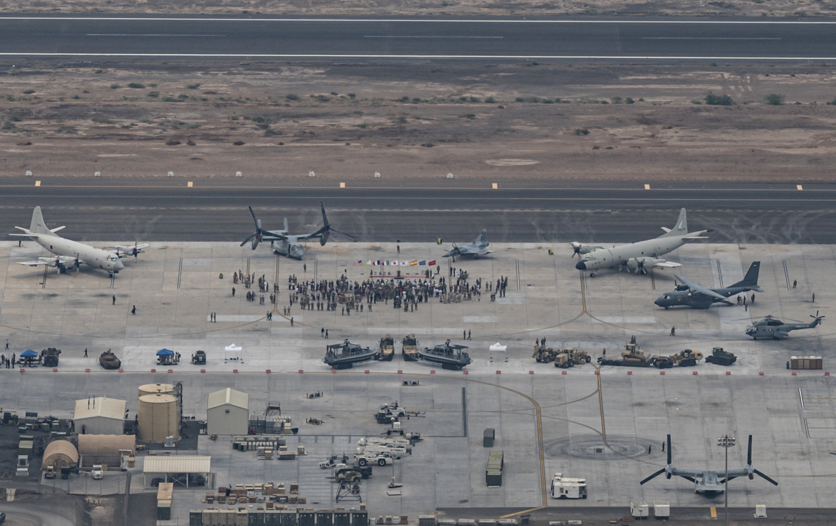 U.S. and coalition service members participate in the Combined Joint Task Force - Horn of Africa Partner Appreciation Day 2022 event at Camp Lemonnier, Djibouti, Nov. 10, 2022. The event celebrated the 20th anniversary of the arrival of U.S. service members in Djibouti after the terrorist attacks of 9/11. (Department of Defense photo by U.S. Air Force Destani K. Matheny)