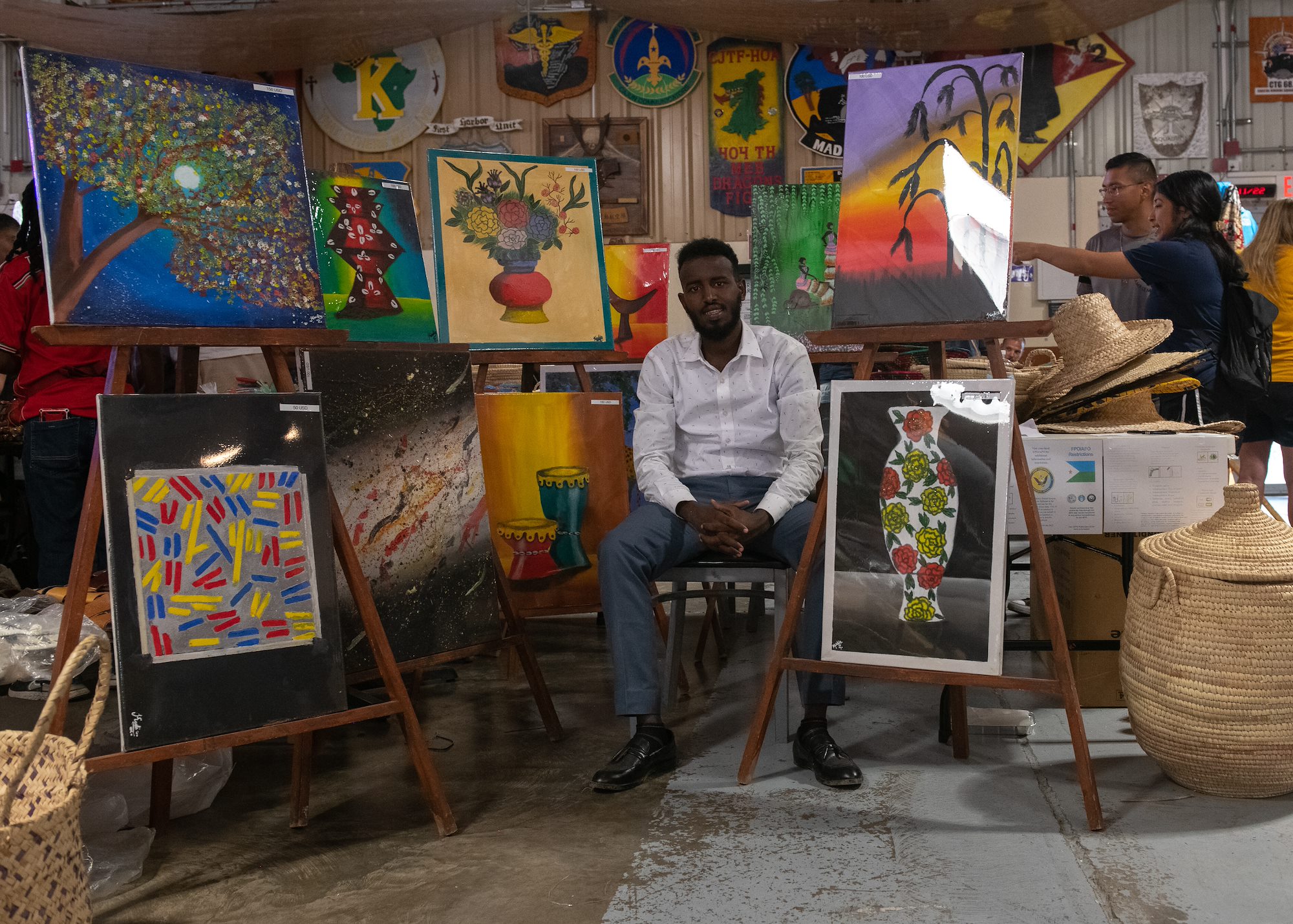 A local vendor poses by his hand-painted artwork at the Djiboutian crafts bazaar at Camp Lemonnier, Djibouti, Nov. 19, 2022. The U.S. Embassy in Djibouti, Djibouti Minister of Tourism and Crafts, Djibouti Chamber of Commerce and women’s artist guild have been working closely to emphasize equity and inclusion in event participation. This year’s bazaar included a diverse group of vendors and artisans from the different regions and ethnic groups of Djibouti, and 19 vendors with 10 assistants participated. (Department of Defense photo by U.S. Army Spc. Emily Held)