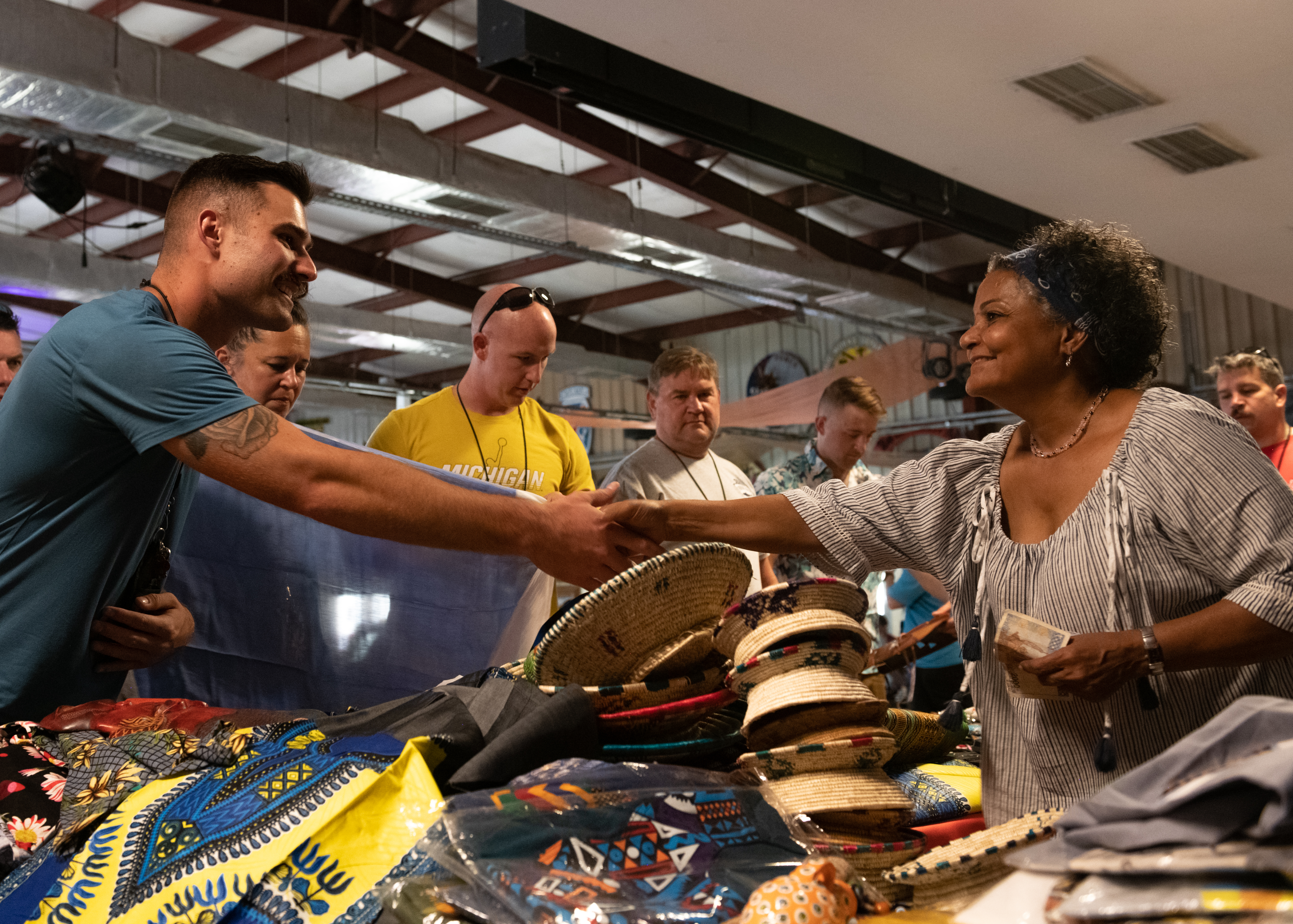 A U.S. service member shakes hands with a local vendor after purchasing from her booth at the Djiboutian crafts bazaar on Camp Lemonnier, Djibouti, Nov. 19, 2022. The bazaar supports the local economy and provides attendees the opportunity to purchase gifts for themselves, their friends or family members. (Department of Defense photo by U.S. Army Spc. Emily Held)