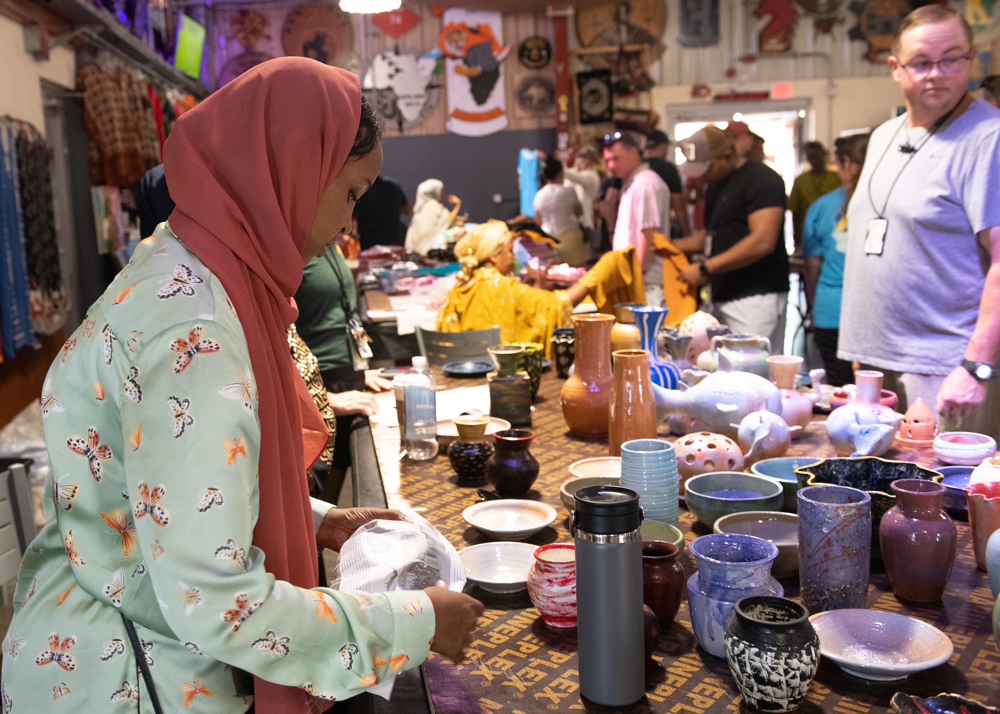 A Djiboutian vendor packages a vase for a customer at the Djiboutian crafts bazaar on Camp Lemonnier, Djibouti, Nov. 19, 2022. The U.S. Embassy in Djibouti, Djibouti Minister of Tourism and Crafts, Djibouti Chamber of Commerce and women’s artist guild have been working closely to emphasize equity and inclusion in event participation. This year’s Bazaar included a diverse group of vendors and artisans from the different regions and ethnic groups of Djibouti, and 19 vendors with 10 assistants participated. (Department of Defense photo by U.S. Army Spc. Emily Held)