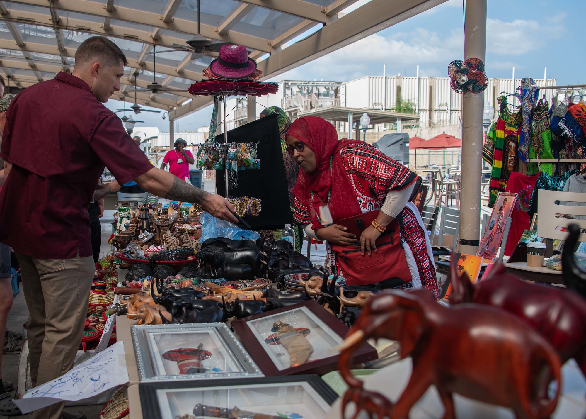 A U.S. service member interacts with a local vendor at the Djiboutian crafts bazaar on Camp Lemonnier, Djibouti, Nov. 19, 2022. The bazaar supports the local economy and provides attendees the opportunity to purchase gifts for themselves, their friends or family members. (Department of Defense photo by U.S. Army Spc. Emily Held)