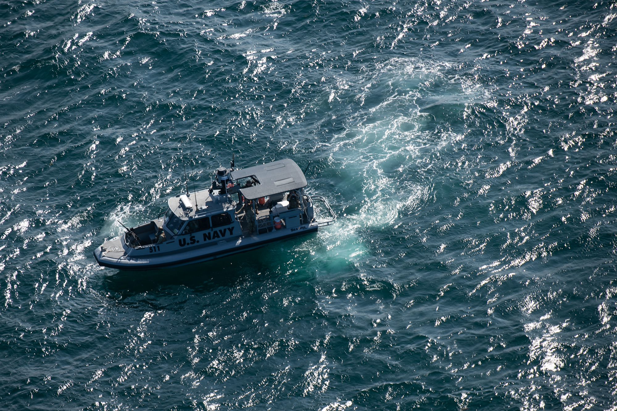 A 34-foot Dauntless-class patrol boat assigned to Maritime Expeditionary Security Squadron Eleven (MSRON-1), secures the area during exercise Bull Shark, near Arta Range, Djibouti, Dec. 3, 2022. MSRON-1 provides port and harbor security, high-value asset protection, and maritime security operations in coastal waterways of the Gulf of Tadjoura. (Department of Defense photo by Staff Sgt. Dallin Wrye)