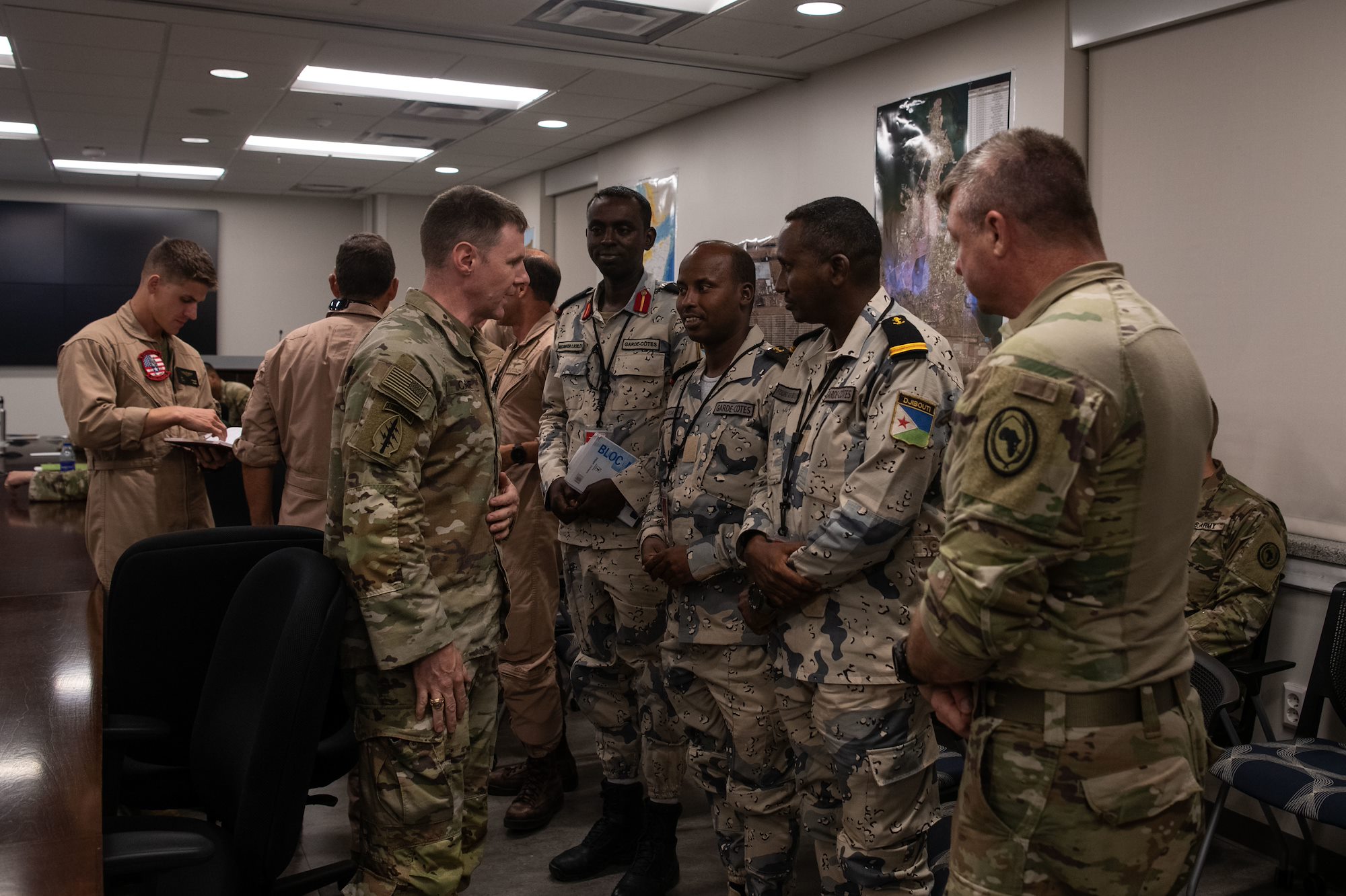U.S. Army Brig. Gen. Stephen Case, Combined Joint Task Force - Horn of Africa deputy commanding general, presents coins to Djiboutian coast guard members at Camp Lemonnier, Djibouti, Dec. 3, 2022. The Djiboutian coast guard is the first line of defense and the first responders for personnel recovery missions in and around Djibouti. (Department of Defense photo by Staff Sgt. Dallin Wrye)