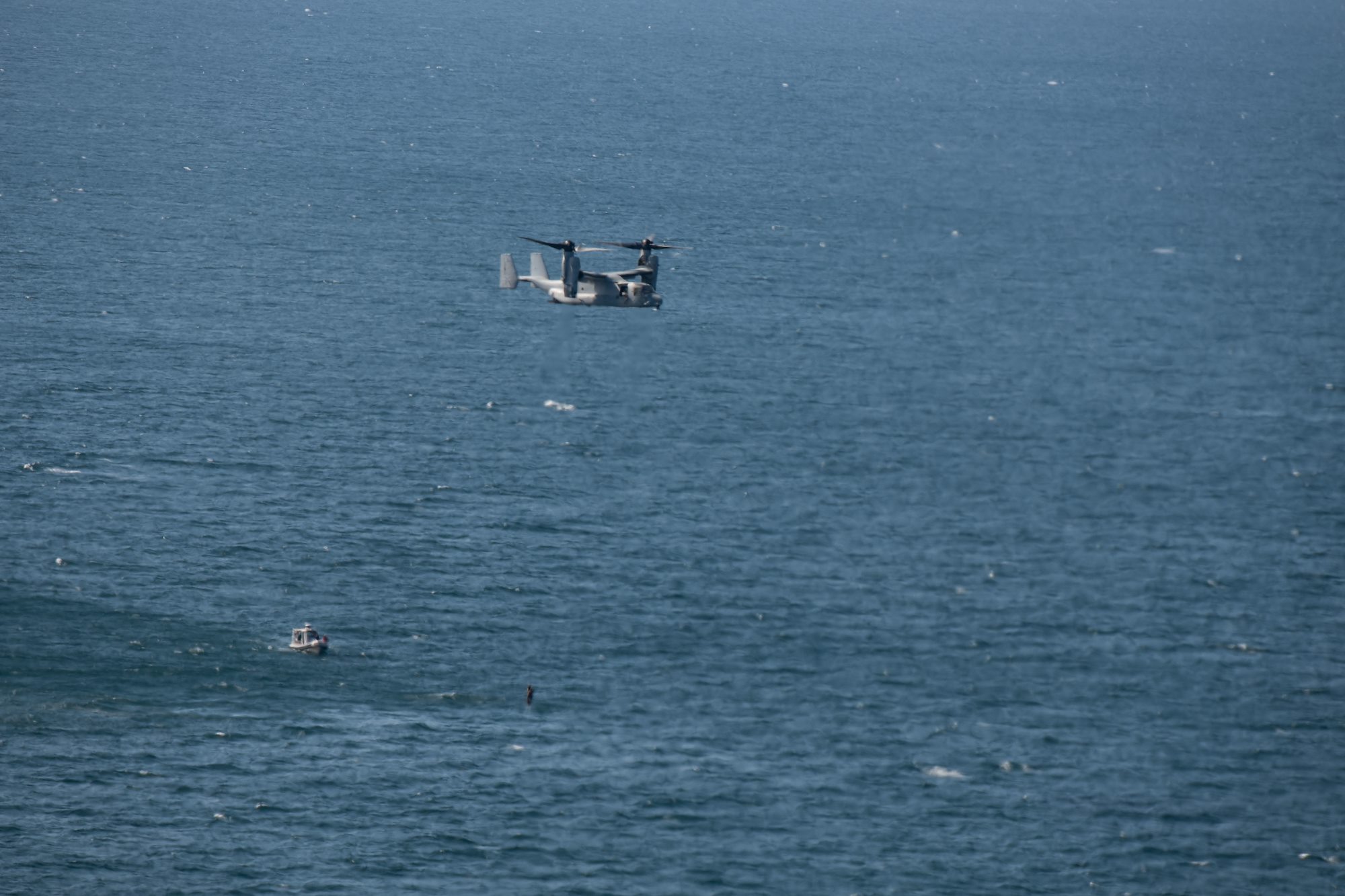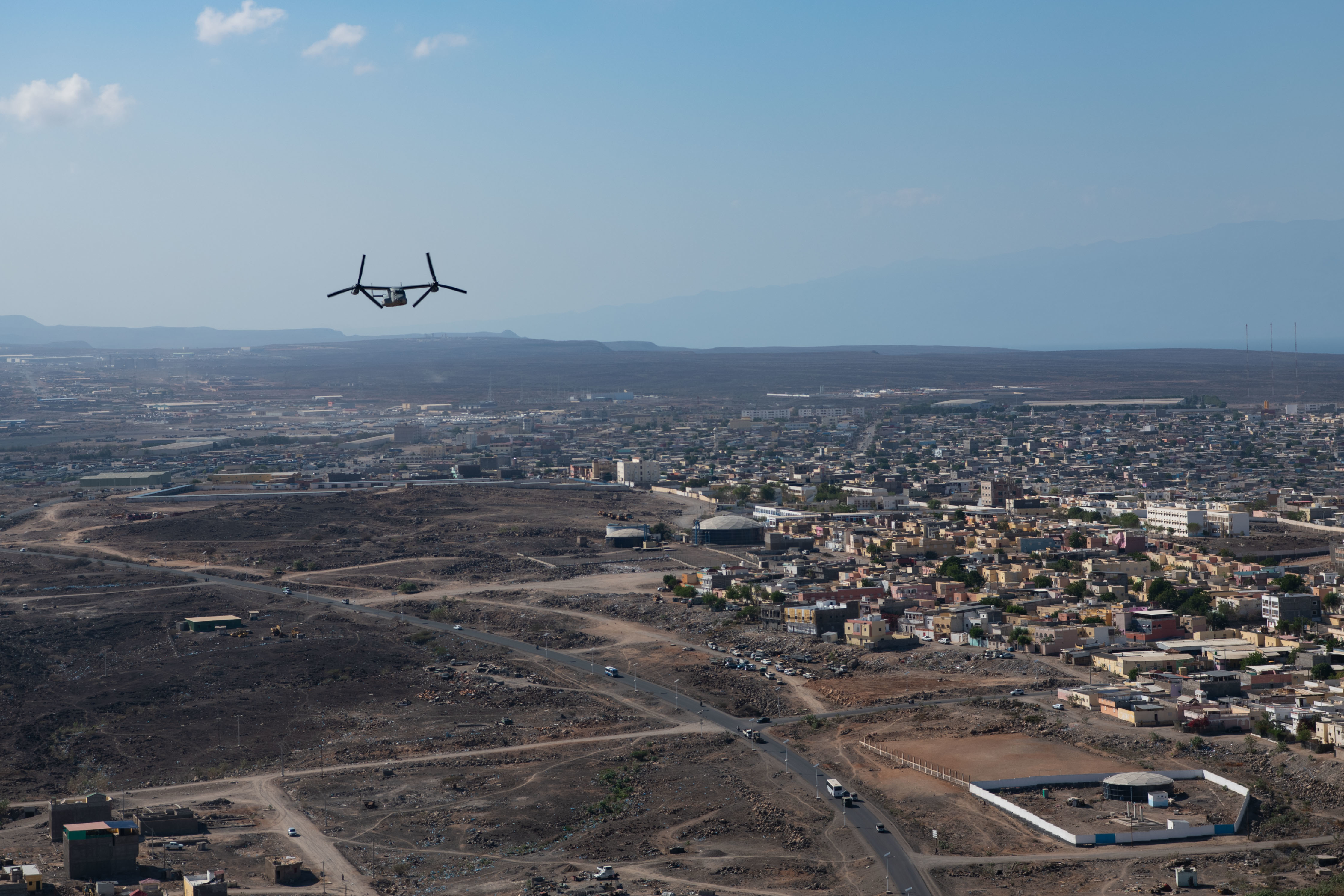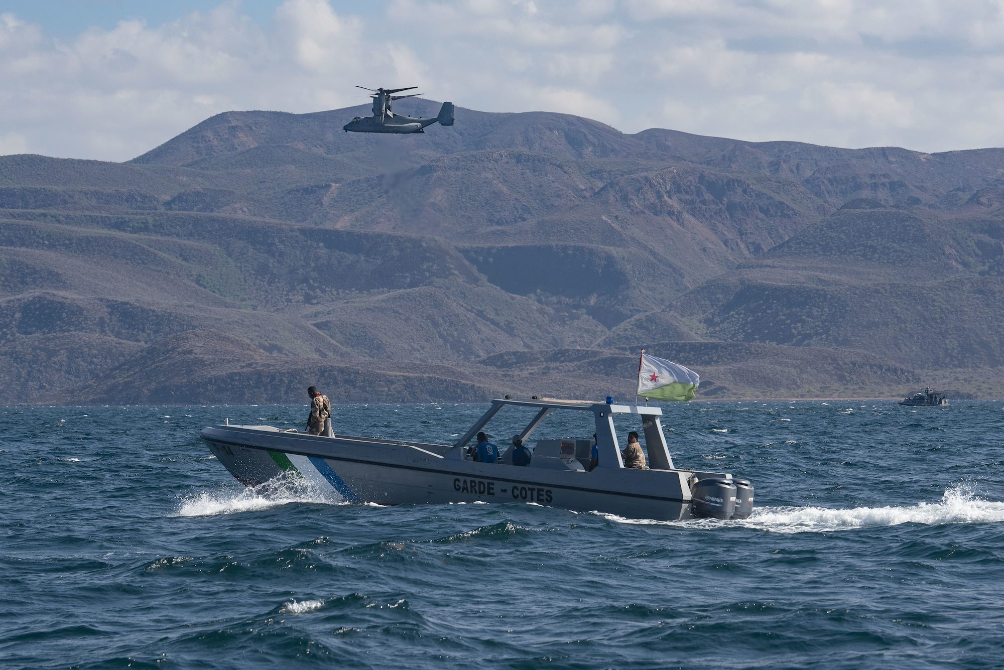 A Djiboutian coast guard vessel protects a U.S. Marine Corps MV-22 Osprey during the combined joint interoperability exercise Bull Shark near Arta Range, Djibouti, Dec. 3, 2022. The exercise included the Djiboutian coast guard, U.S. Marine Corps, U.S. Army, U.S. Air Force, U.S. Navy, and Spanish navy. (Department of Defense photo by U.S. Air Force Staff Sgt. Thomas Johns)