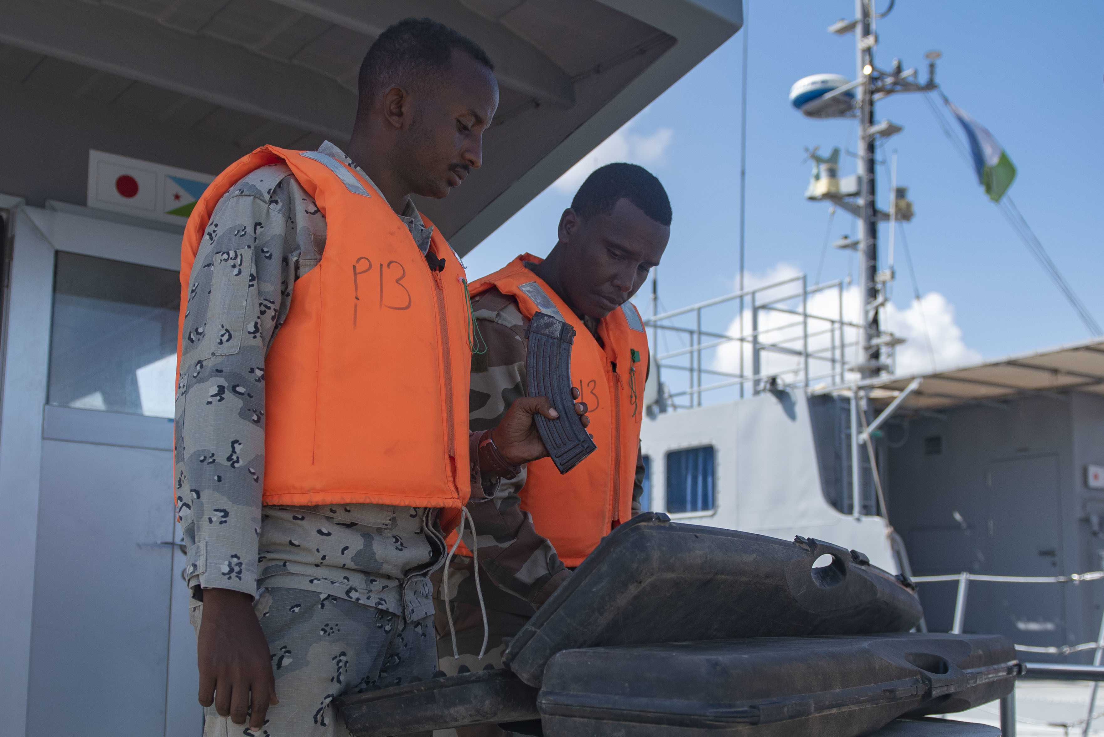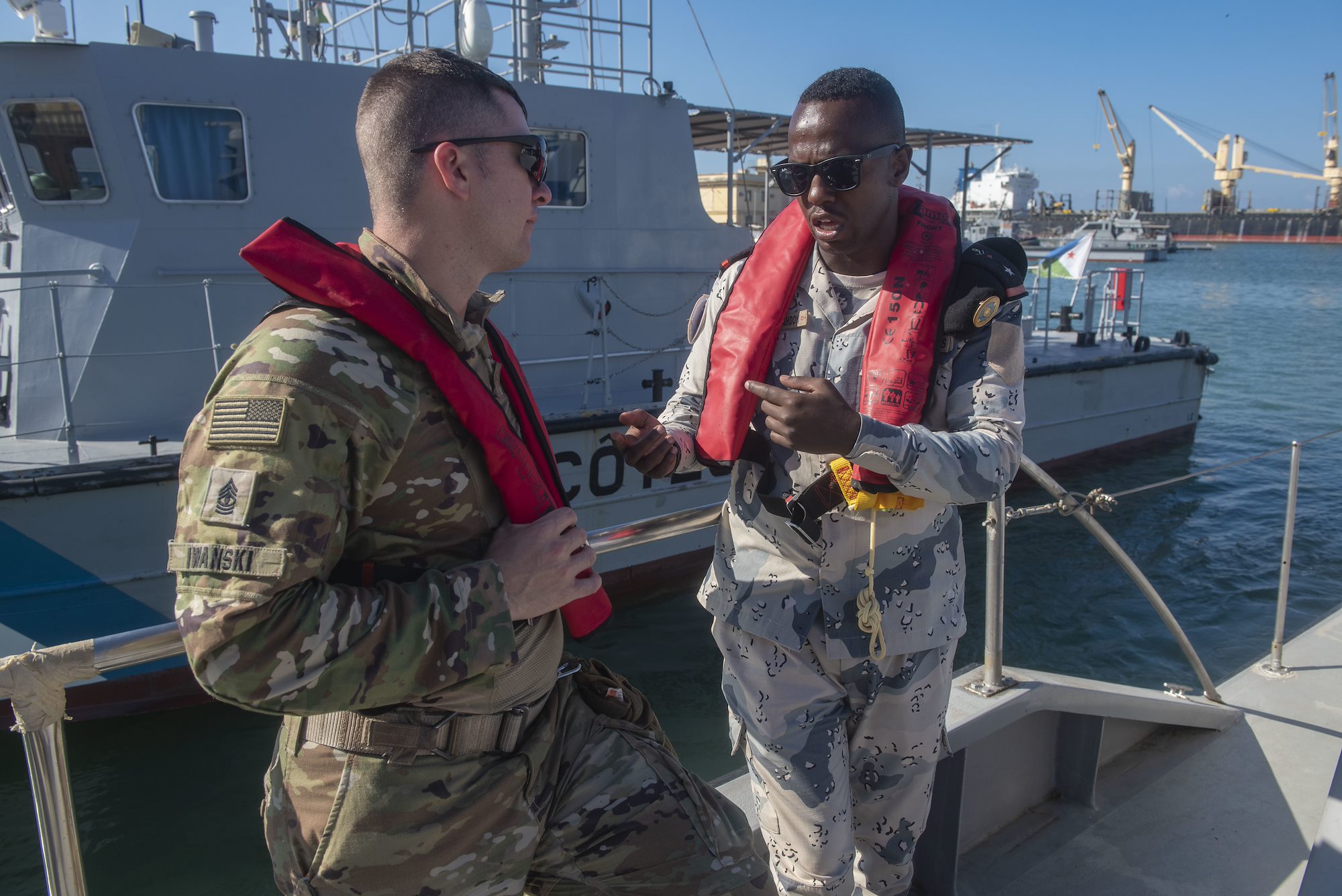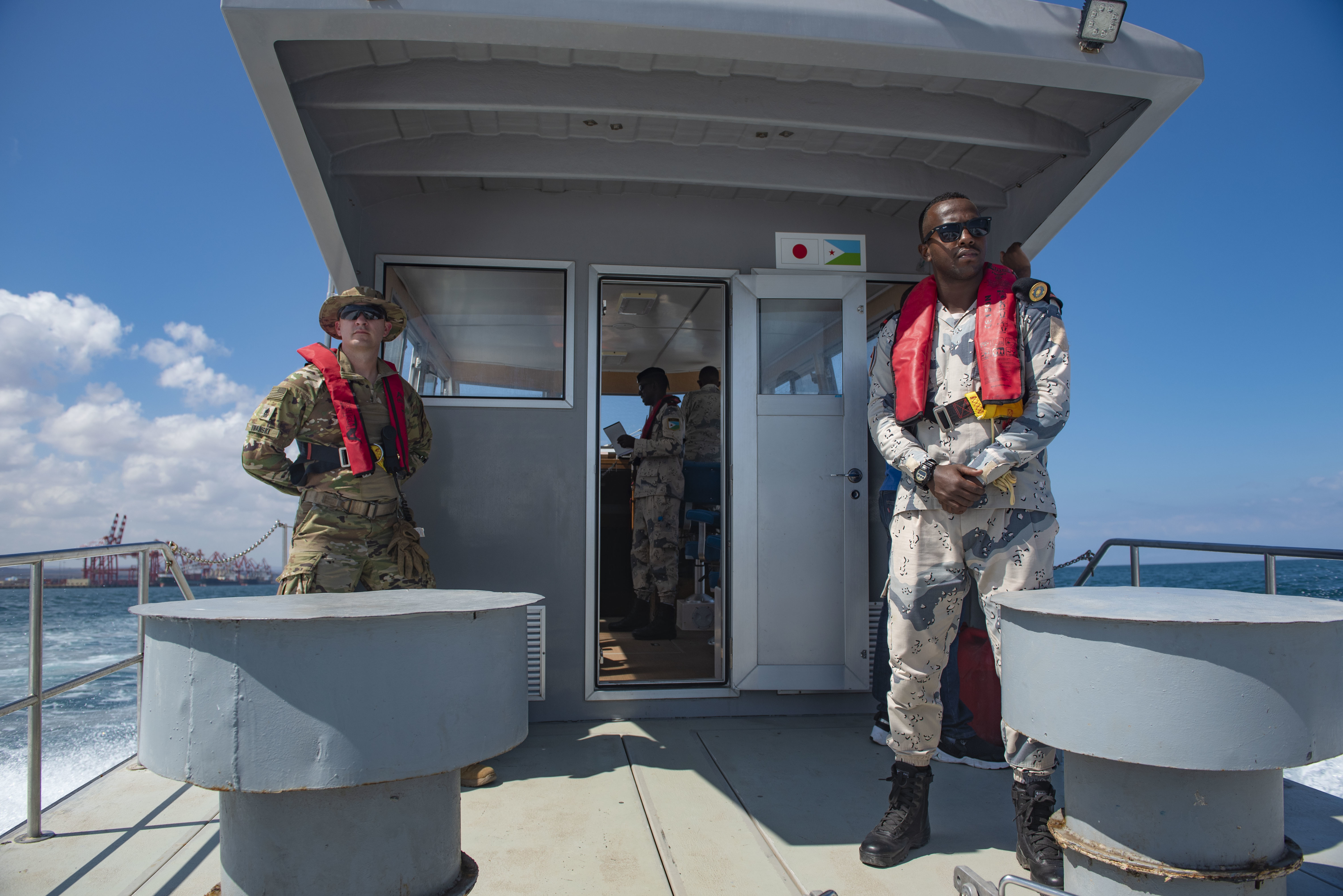 A U.S. Army National Guard Soldier stands with a Djiboutian coast guardsman aboard a Djiboutian coast guard vessel during the combined joint interoperability exercise Bull Shark near Arta Range, Dec. 3, 2022. The exercise unified a multinational joint force to conduct a simulated personnel recovery mission. (Department of Defense photo by U.S. Air Force Staff Sgt. Thomas Johns)