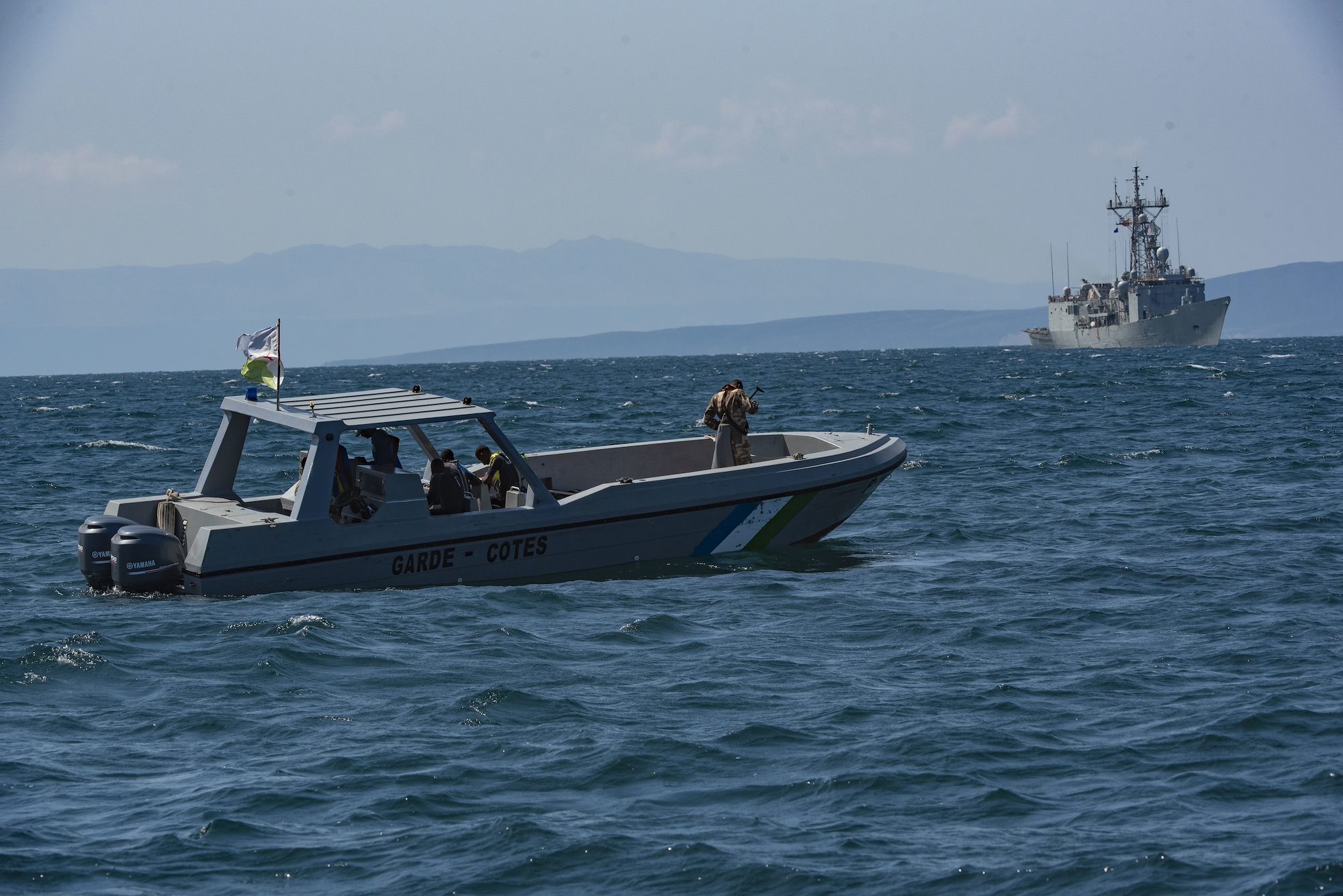 A Djiboutian coast guard vessel conducts overwatch operations ahead of the Spanish navy frigate Santa Maria during the combined joint interoperability exercise Bull Shark near Arta Range, Djibouti, Dec. 3, 2022. During the exercise, the Djiboutian coast guard worked directly with multinational partners. (Department of Defense photo by U.S. Air Force Staff Sgt. Thomas Johns)