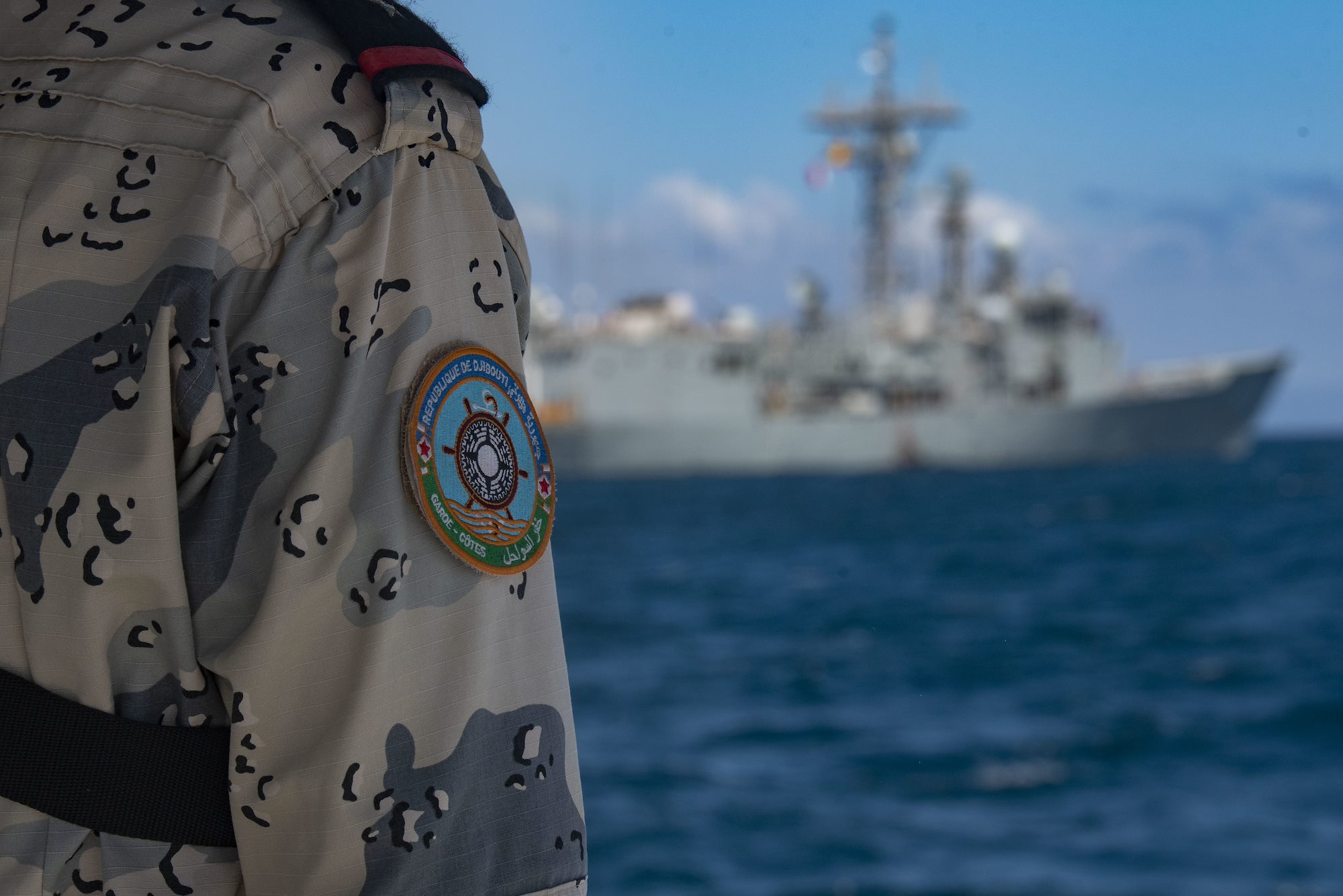 A Djiboutian coast guardsman stands watch as the Spanish navy frigate Santa Maria passes by during the combined joint interoperability exercise Bull Shark near Arta Range, Djibouti, Dec. 3, 2022. During the exercise, the Djiboutian coast guard synchronized and coordinated with joint and partner forces to conduct crisis response and personnel recovery training. (Department of Defense photo by U.S. Air Force Staff Sgt. Thomas Johns)