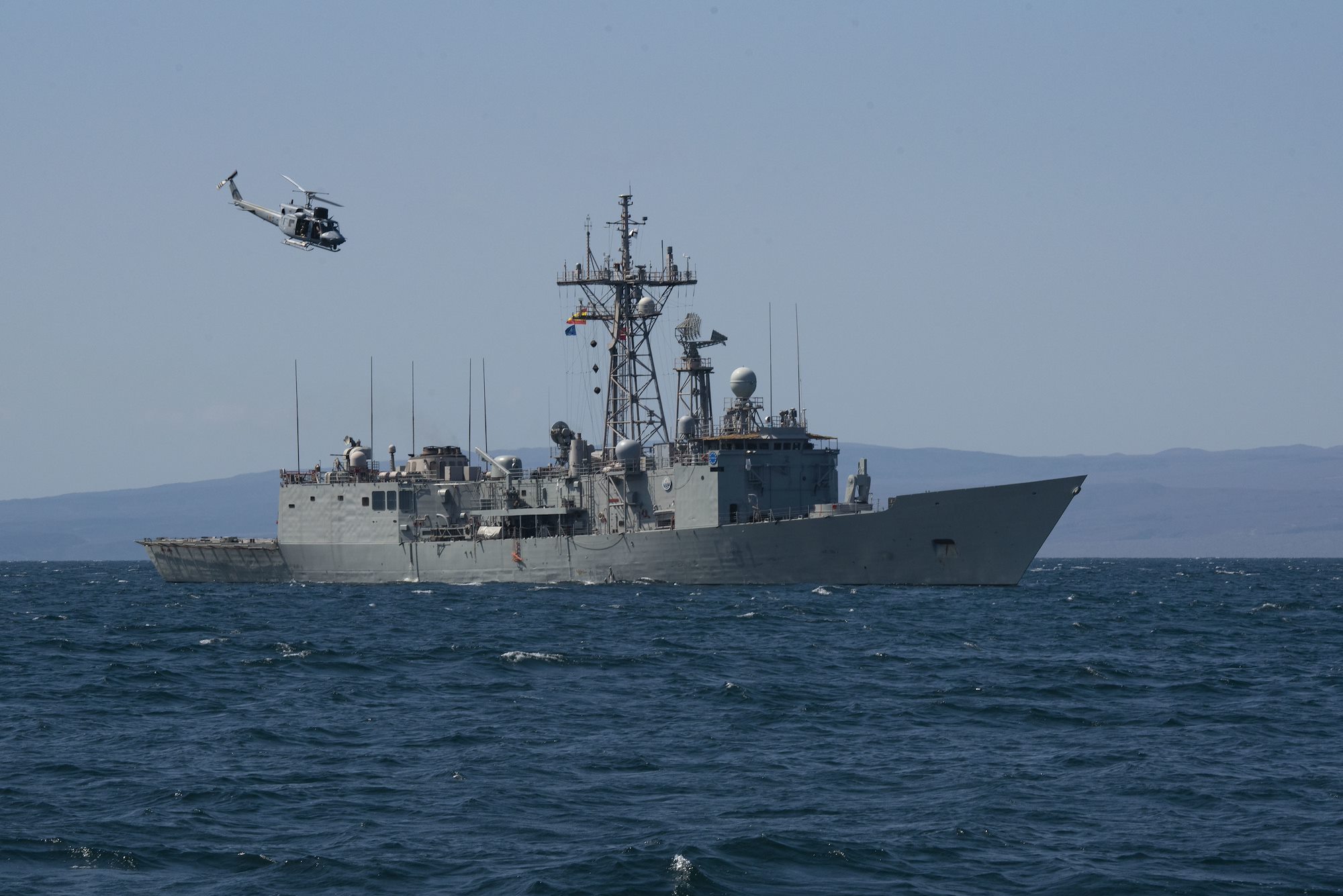 A UH-1N Huey flies above the Spanish frigate Santa Maria during the combined joint interoperability exercise Bull Shark, near Arta Range, Djibouti, Dec. 3, 2022. The exercise involved joint and partner military components to conduct crisis response and personnel recovery training. (Department of Defense photo by U.S. Air Force Staff Sgt. Thomas Johns)