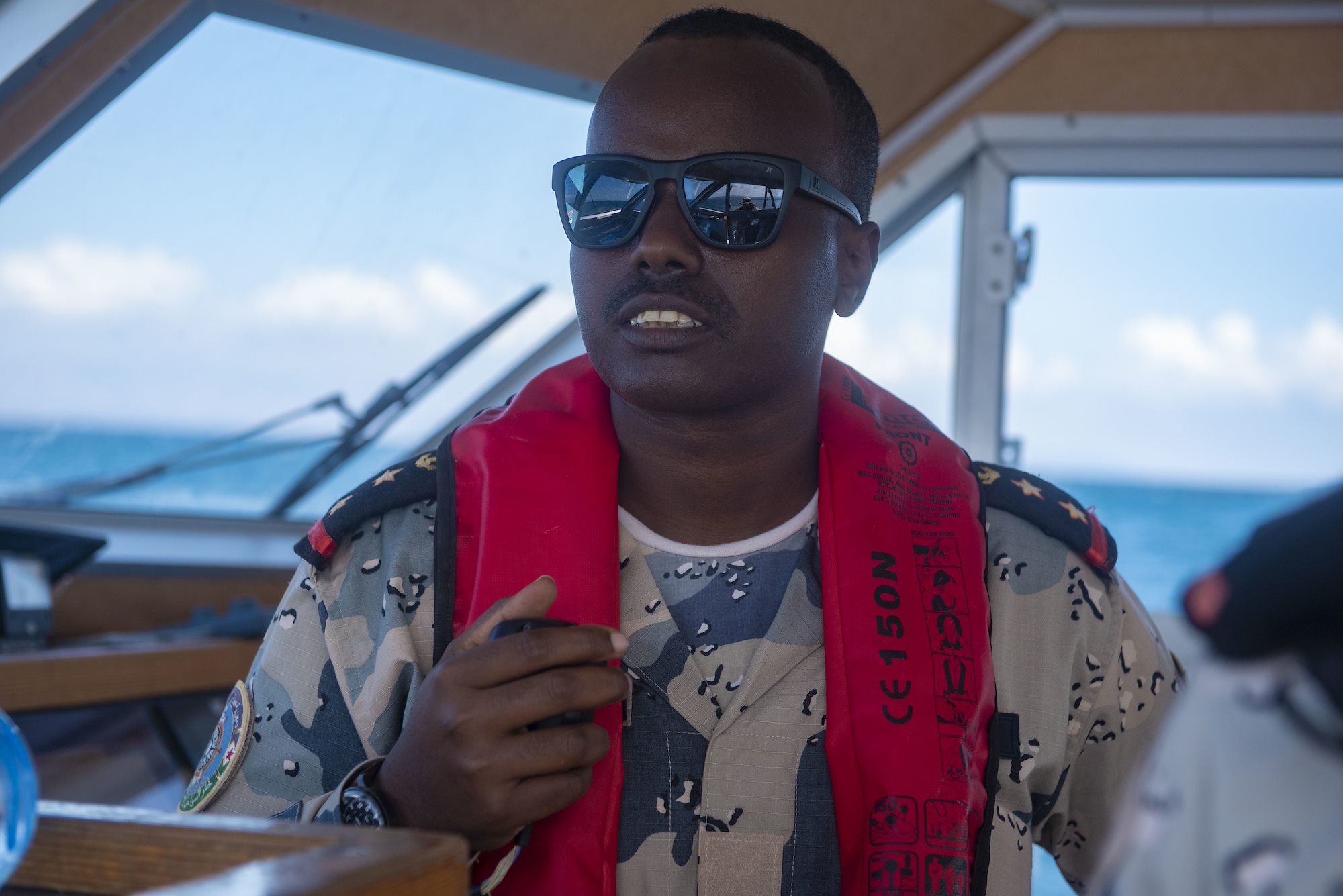 A Djiboutian coast guardsman coordinates a simulated water rescue mission from the bridge of a Djiboutian coast guard vessel as part of the combined joint interoperability exercise Bull Shark near Arta Range, Djibouti, Dec.3, 2022. During the exercise, the Djiboutian coast guard played a direct role with multinational partners to conduct a simulated personnel recovery mission. (Department of Defense photo by U.S. Air Force Staff Sgt. Thomas Johns)