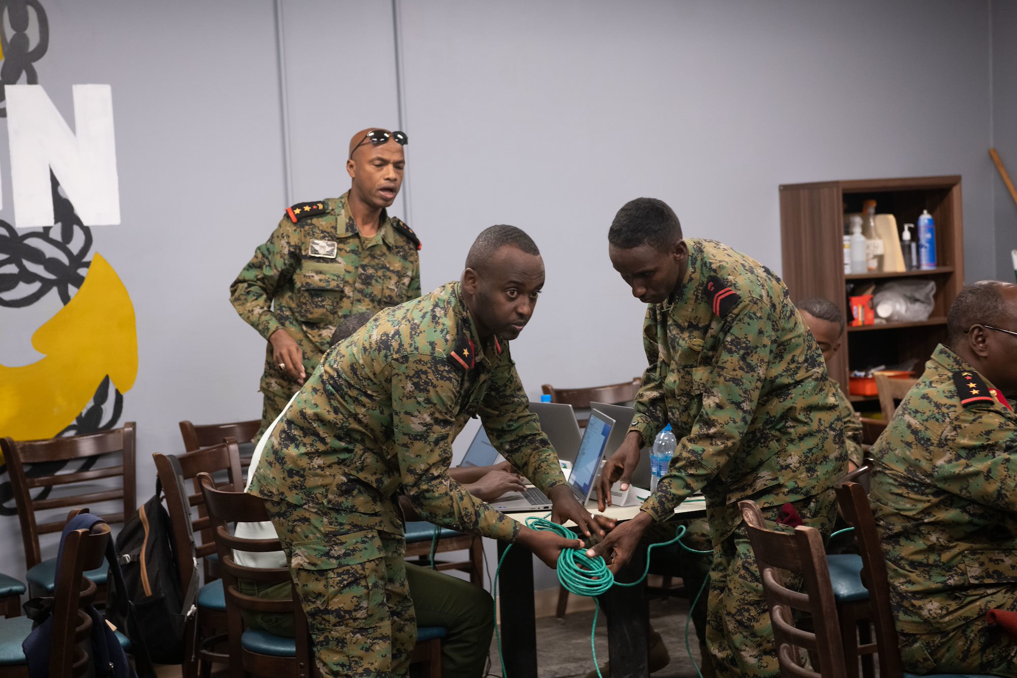 Members of the Djiboutian Armed Forces unravel a cable during the Cyber Defense Engagement at Camp Lemonnier, Djibouti, Dec. 14, 2022. Participants were provided with step-by-step instructions on network creation before being tested on their new skills. (Department of Defense photo by U.S. Air Force Staff Sgt. Dallin Wrye)