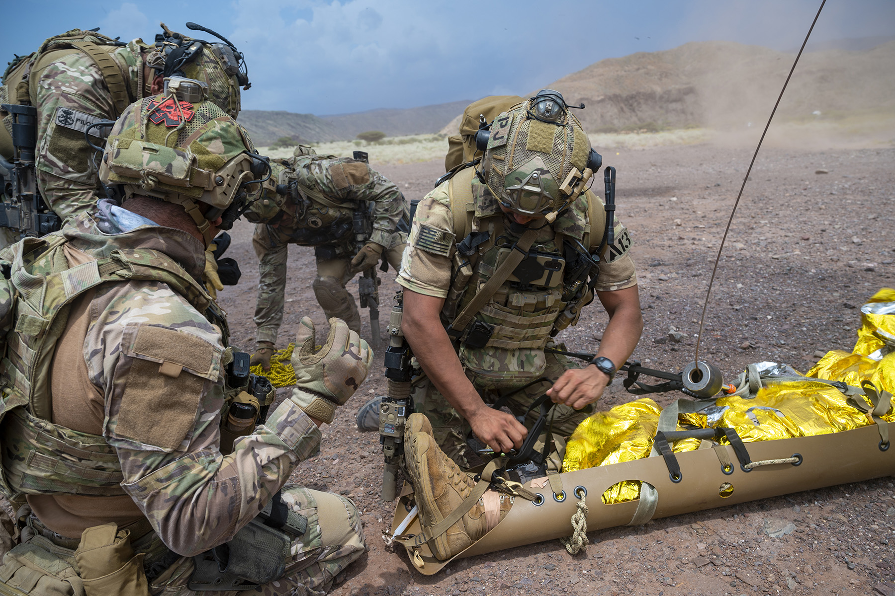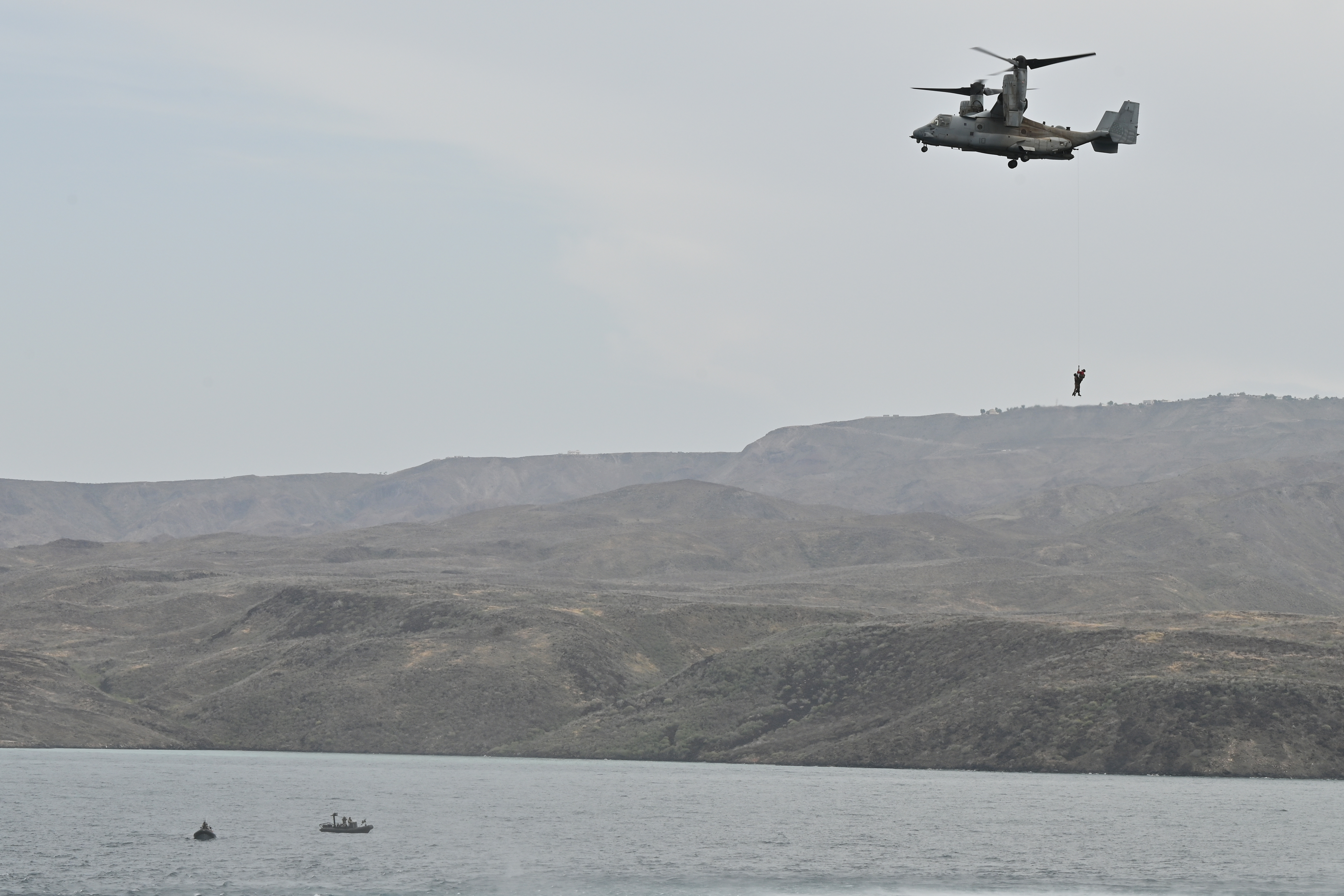 While providing close air support to the land portion, the Spanish naval helicopter was notionally shot down prompting a sea rescue mission of two pilots stranded in the water. The Spanish naval forces then sent a request to CJTF - HOA for rescue support as the Djiboutian coast guard secured the area. Then two Spanish naval members were put into the water and CJTF - HOA conducted an aerial hoist to pick them both up, Arndt continued.