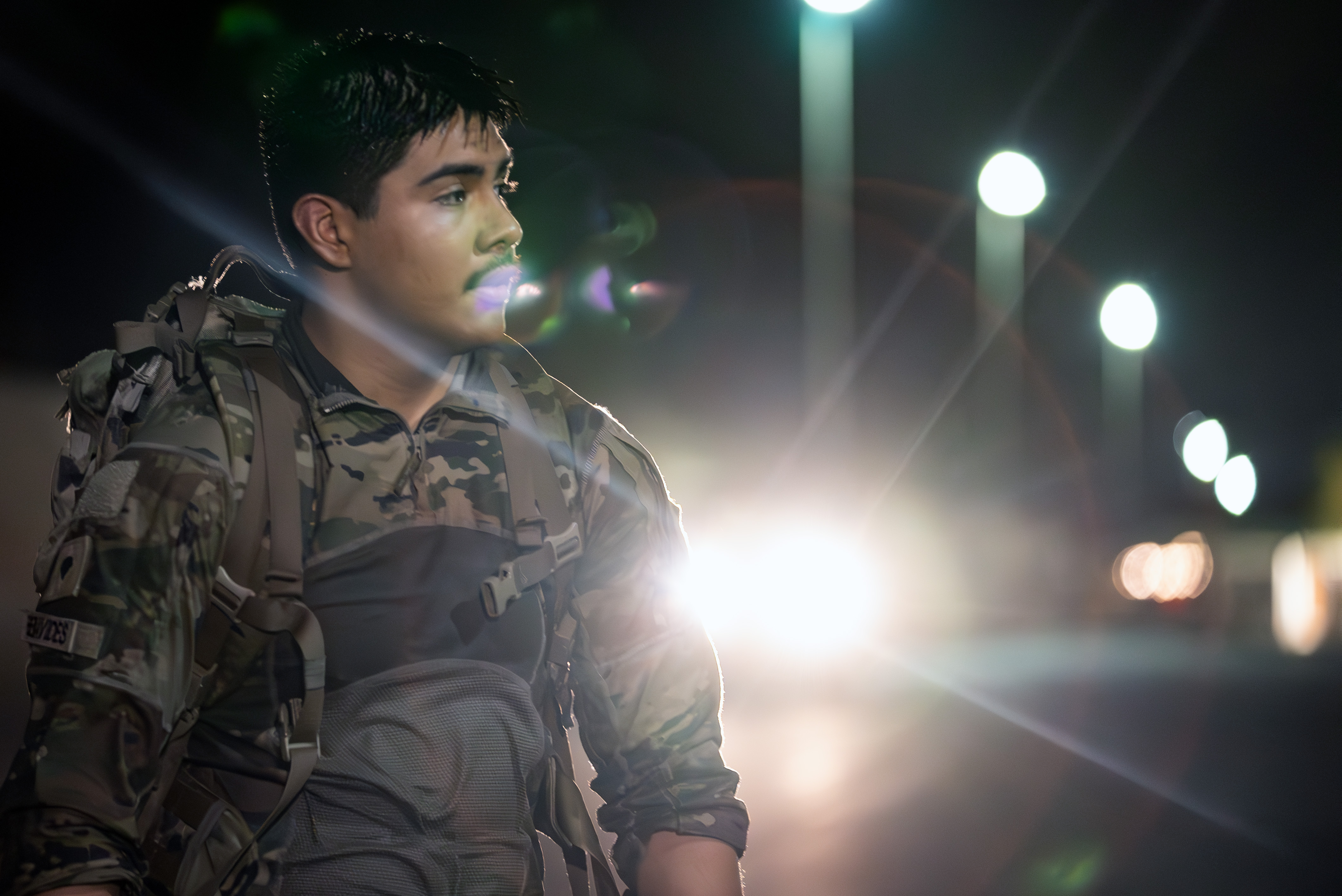 A U.S. Army Soldier with Combined Joint Task Force-Horn of Africa rucks through a checkpoint during the Task Force Tomahawk “Halfway 15” ruck march at Camp Lemonnier, Djibouti, August 12, 2023. Participants of the ruck march have completed a series of ruck marches in preparation for the “Thunderbird 30” ruck march in January. (Department of Defense photo by U.S. Air Force Staff Sgt. Dylan Gentile)
