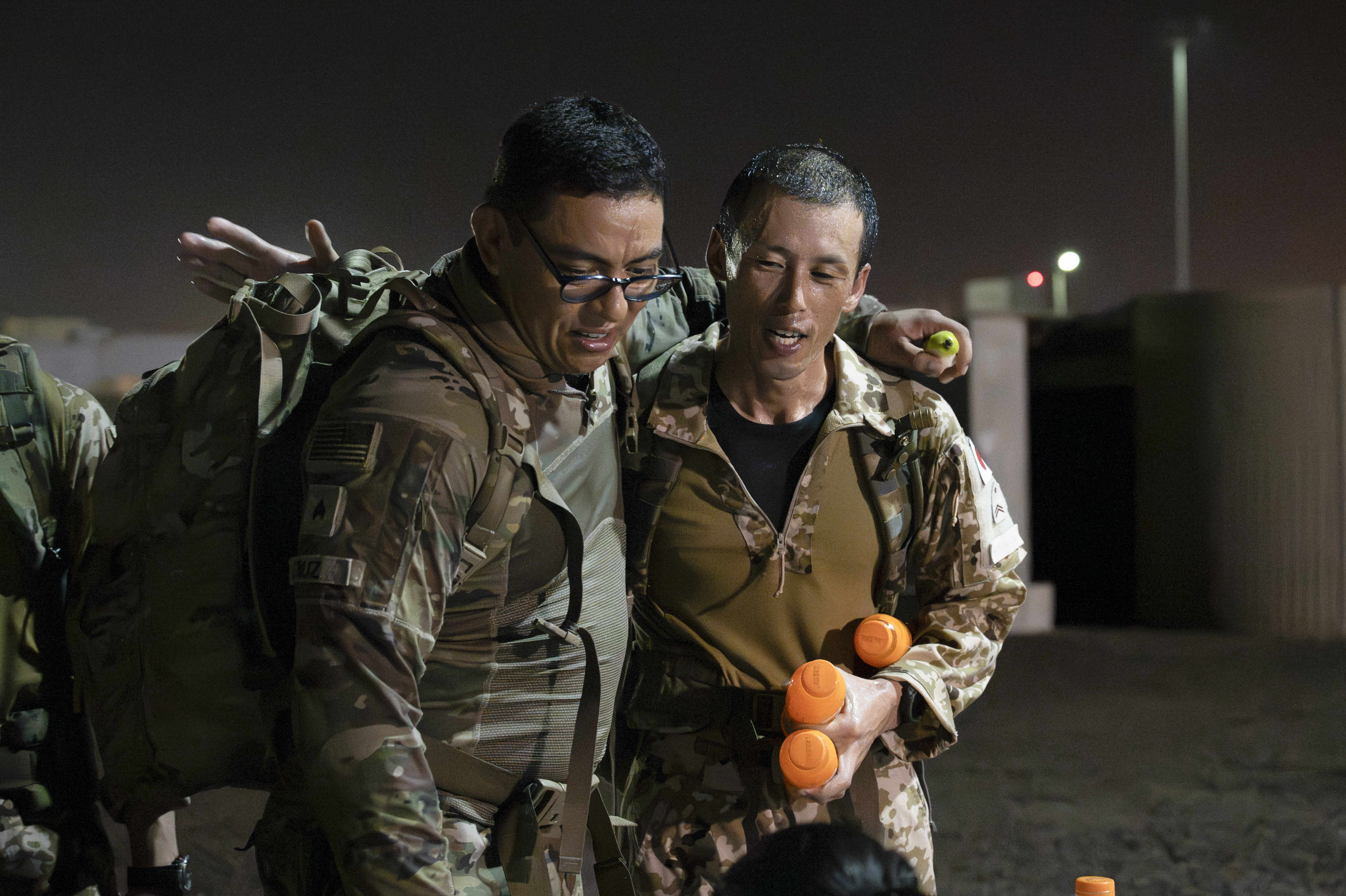 U.S. Army Sgt. Pedro Cruz, 489th Civil Affairs Battalion, reaches the signout desk with a group of Japanese soldiers following the Task Force Tomahawk “Halfway 15” ruck march at Camp Lemonnier, Djibouti, August 12, 2023. Cruz and members of the Southern European Task Force Africa invited members of the Japanese Self-Defense Force to take part in the late-night ruck march to promote foreign engagement on Camp Lemonnier. (U.S. Army National Guard photo by Sgt. Jalen Miller)
