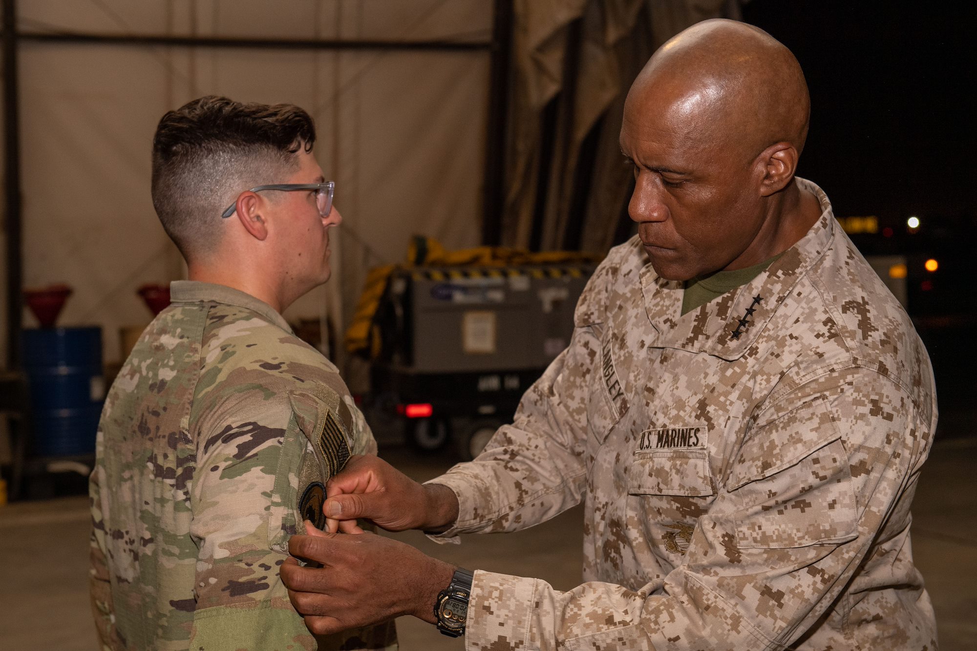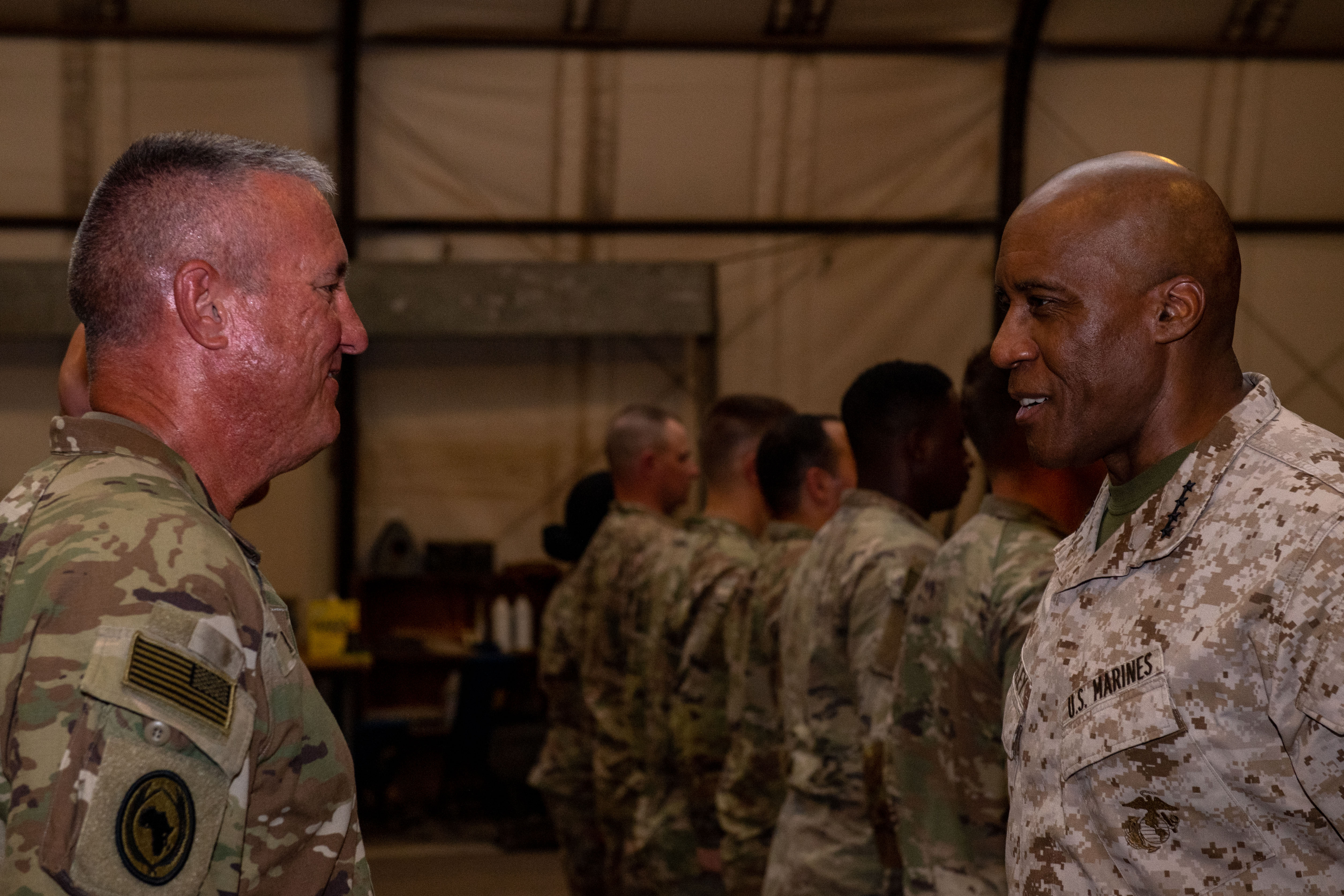 U.S. Marine Corps Gen. Michael E. Langley, U.S. Africa Command commander, addresses U.S. Army Sgt. 1st Class Marvin Miller, 218th Maneuver Enhancement Brigade joint operations center NCOIC, during a patching ceremony at Camp Lemonnier, Djibouti, Aug. 17, 2023. Langley presented combat patches to members of the 218th MEB before meeting with Djiboutian leaders to discuss common security and partnership goals. (Department of Defense photo by U.S. Air Force Staff Sgt. Douglas Lorance)