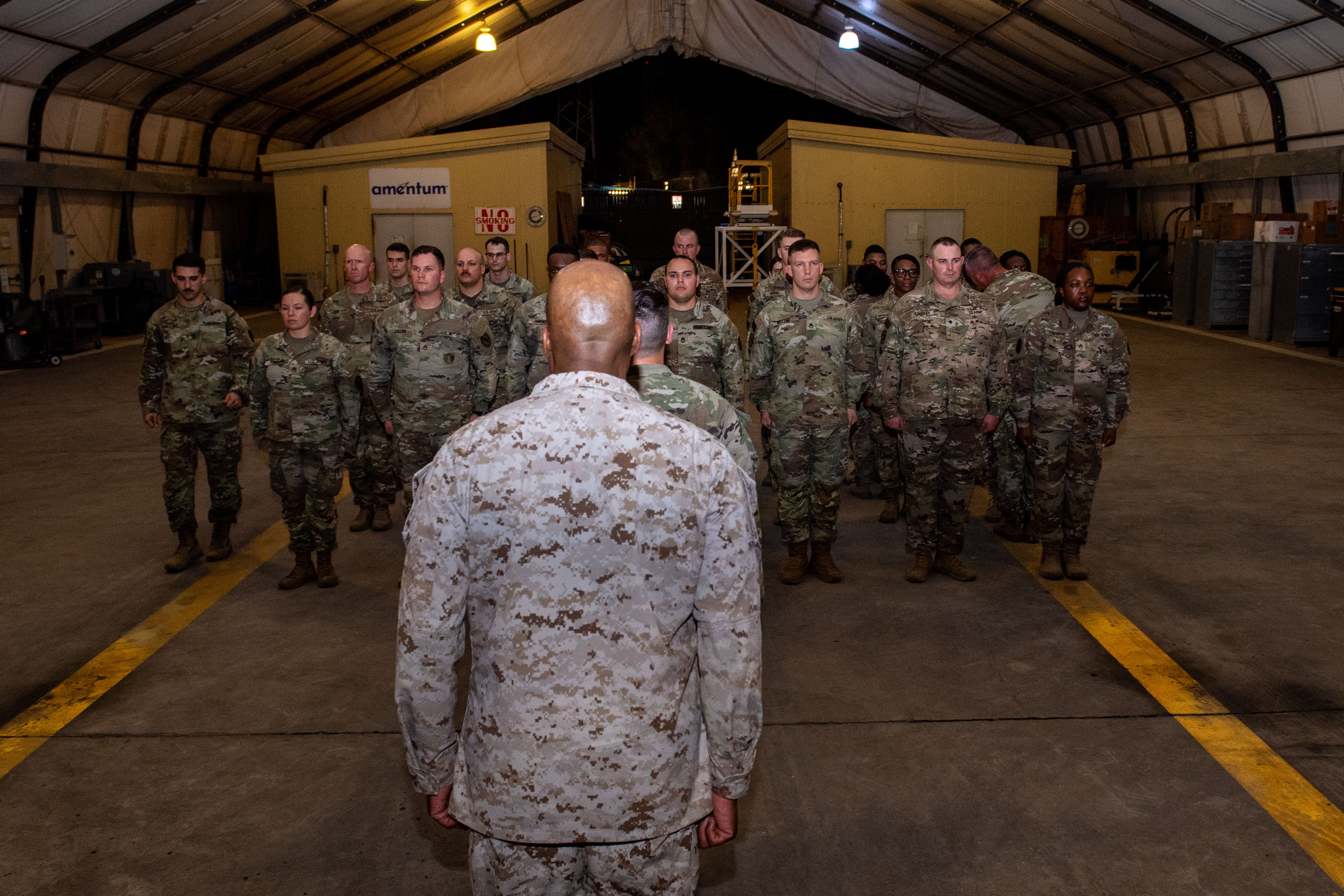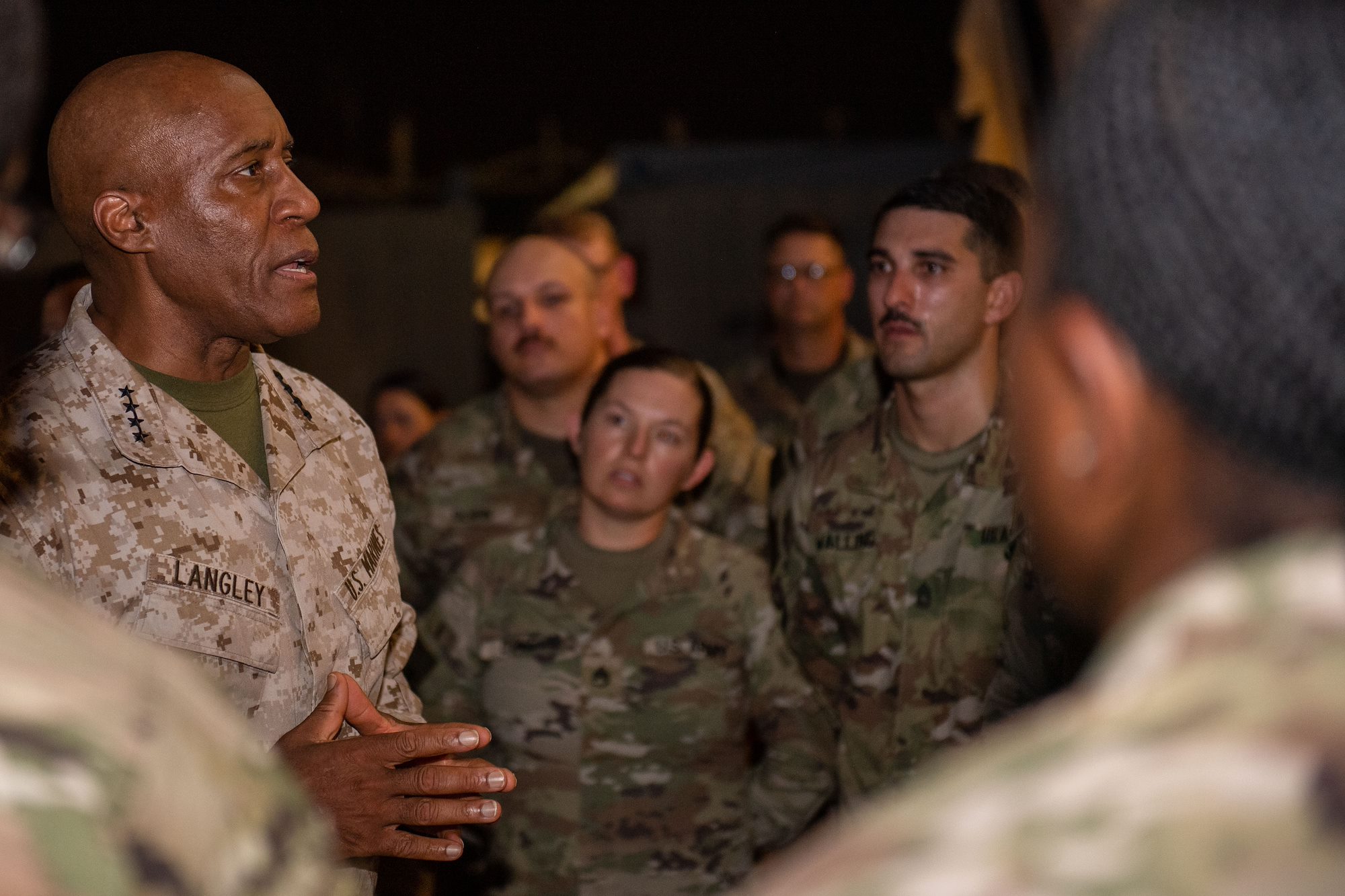U.S. Marine Corps Gen. Michael E. Langley, U.S. Africa Command commander, speaks to members of the 218th Maneuver Enhancement Brigade during a patching ceremony at Camp Lemonnier, Djibouti, Aug. 17, 2023. Langley patched members of the 218th MEB before meeting with Djiboutian leaders to discuss common security and partnership goals. (Department of Defense photo by U.S. Air Force Staff Sgt. Douglas Lorance)