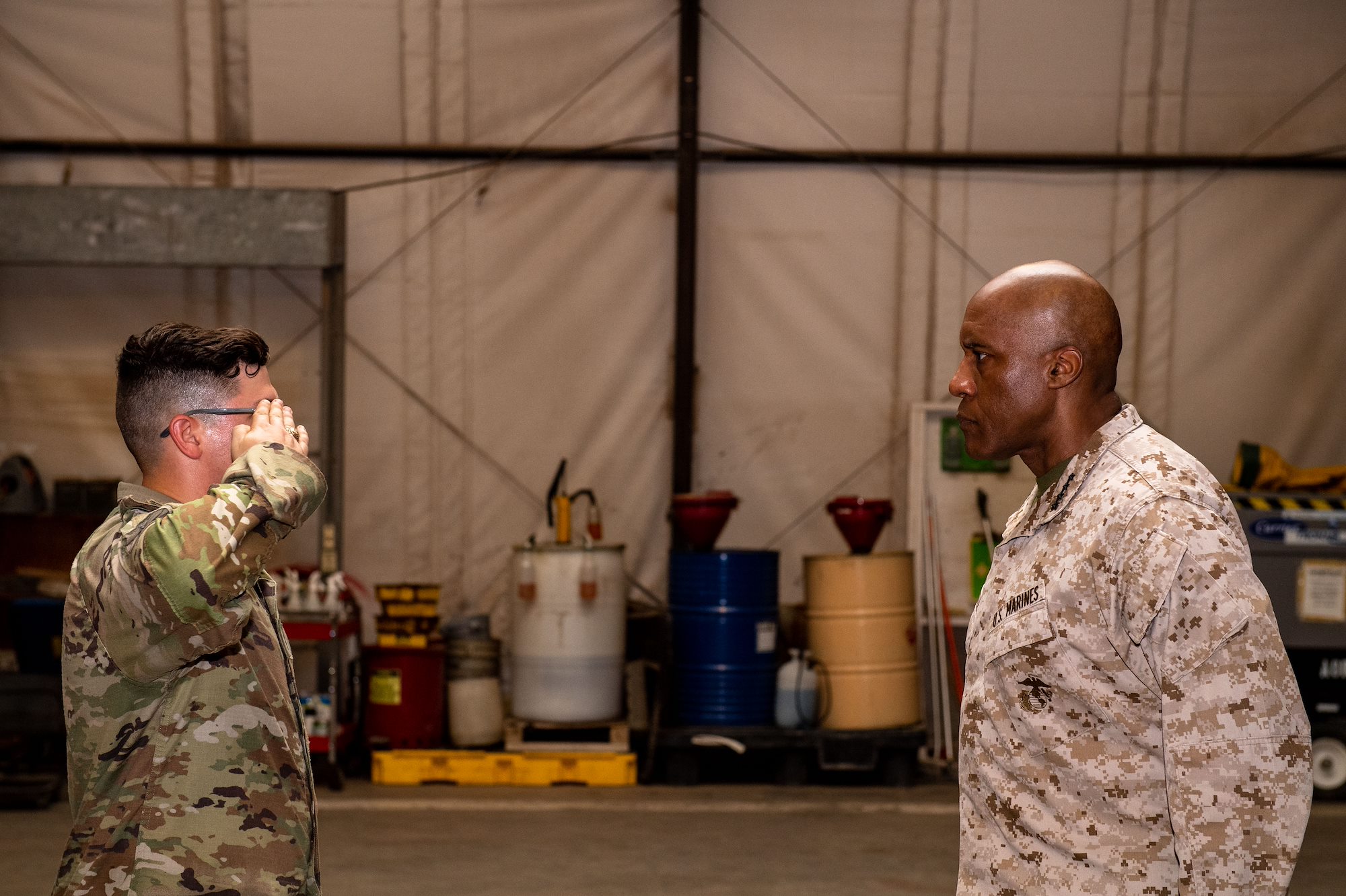U.S. Army Capt. Richard Capps, 218th Maneuver Enhancement Brigade joint operations center team chief, salutes U.S. Marine Corps Gen. Michael E. Langley, U.S. Africa Command commander, during a patching ceremony at Camp Lemonnier, Djibouti, Aug. 17, 2023. Langley patched members of the 218th MEB before meeting with Djiboutian leaders to discuss common security and partnership goals. (Department of Defense photo by U.S. Air Force Staff Sgt. Douglas Lorance)