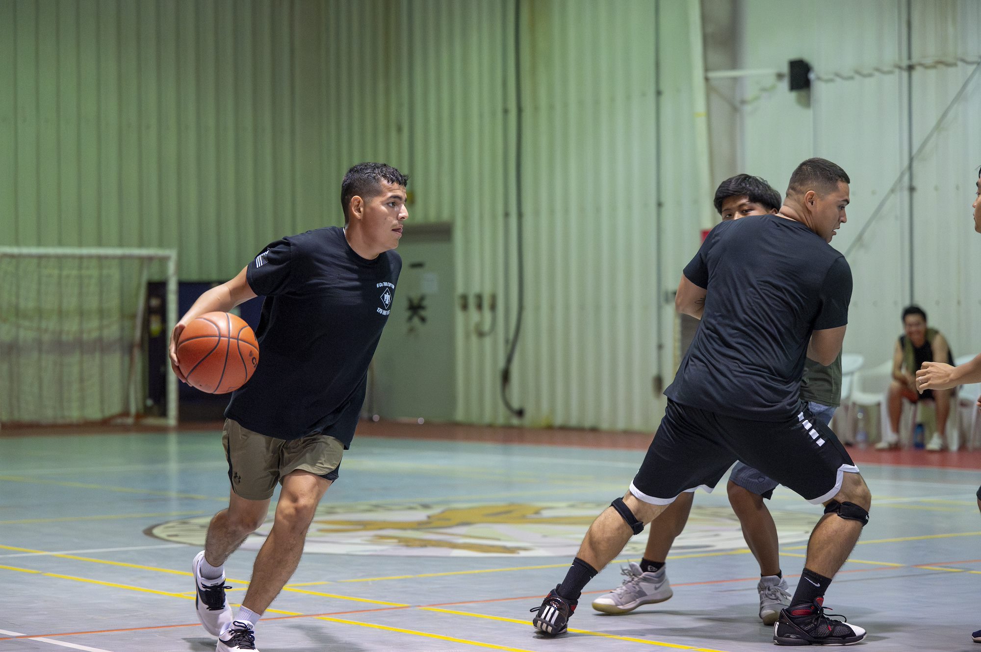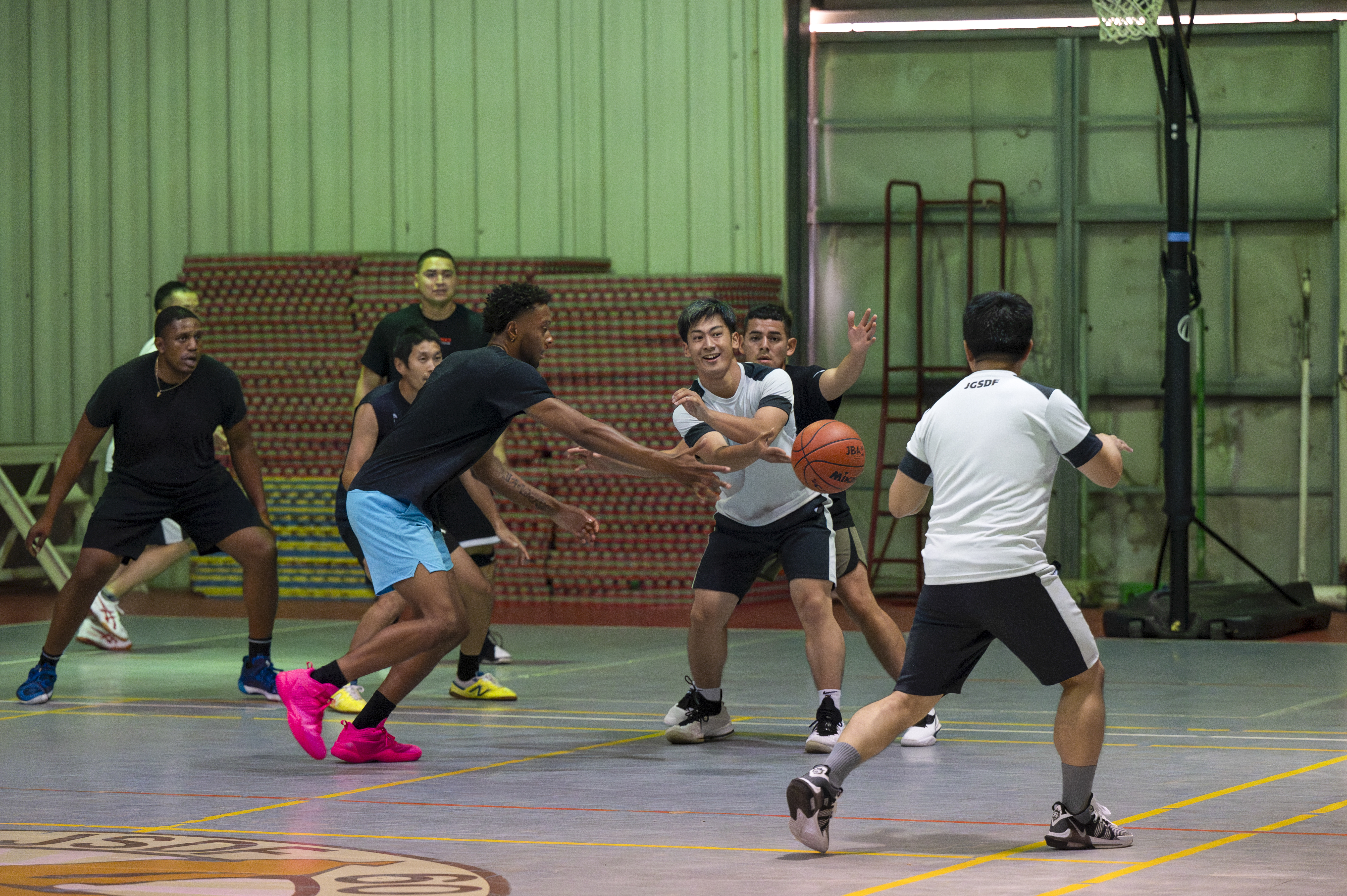 A Japan Self-Defense Forces service member passes the ball during a basketball game against U.S. service members assigned to Combined Joint Task Force - Horn of Africa, held at the Japan Self-Defense Forces base near Ambouli, Djibouti August 19, 2023. Service members from the U.S. and Japan came together for sports-centered foreign engagement. (U.S. Army National Guard photo by Sgt. Jalen Miller)