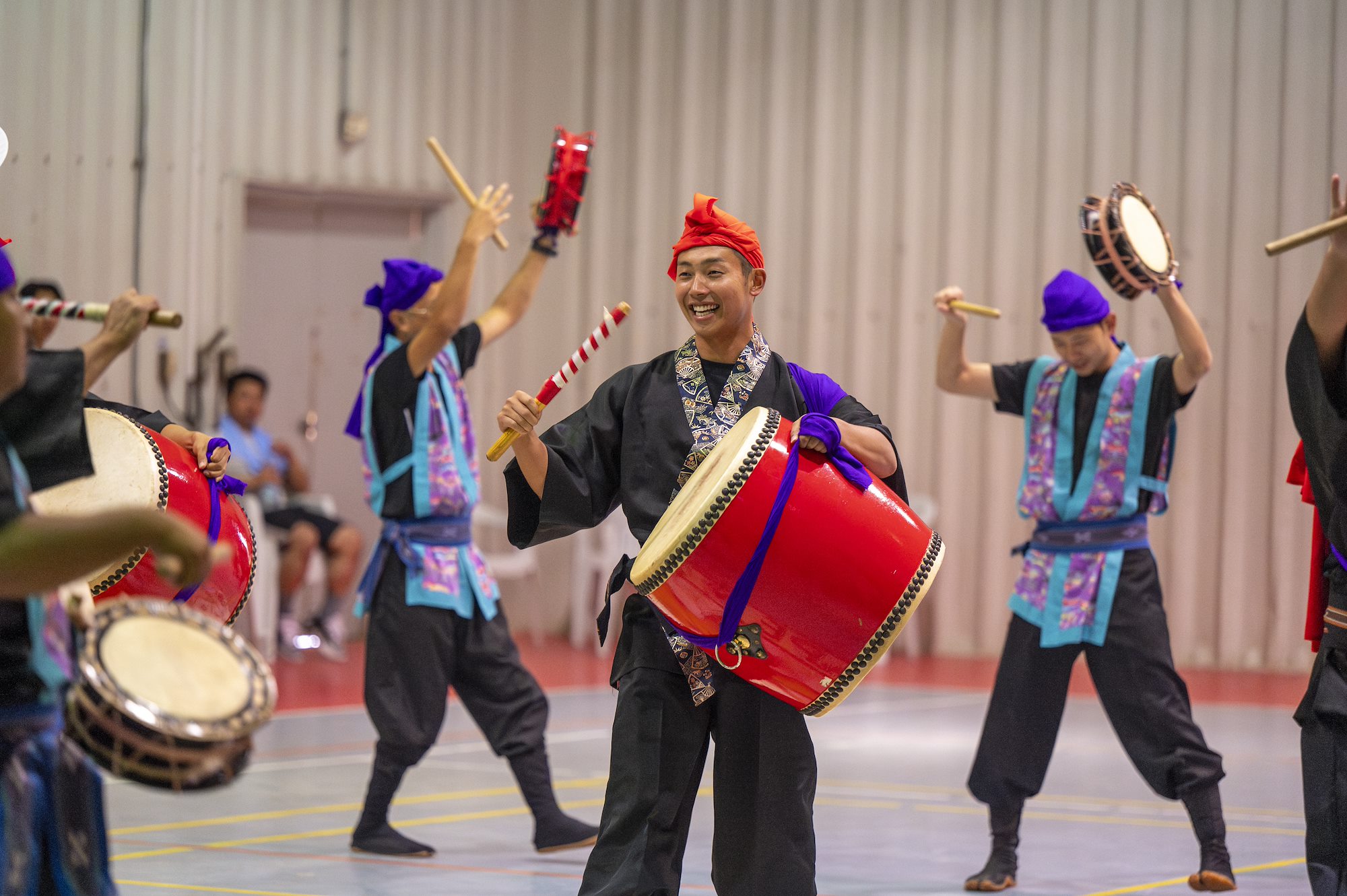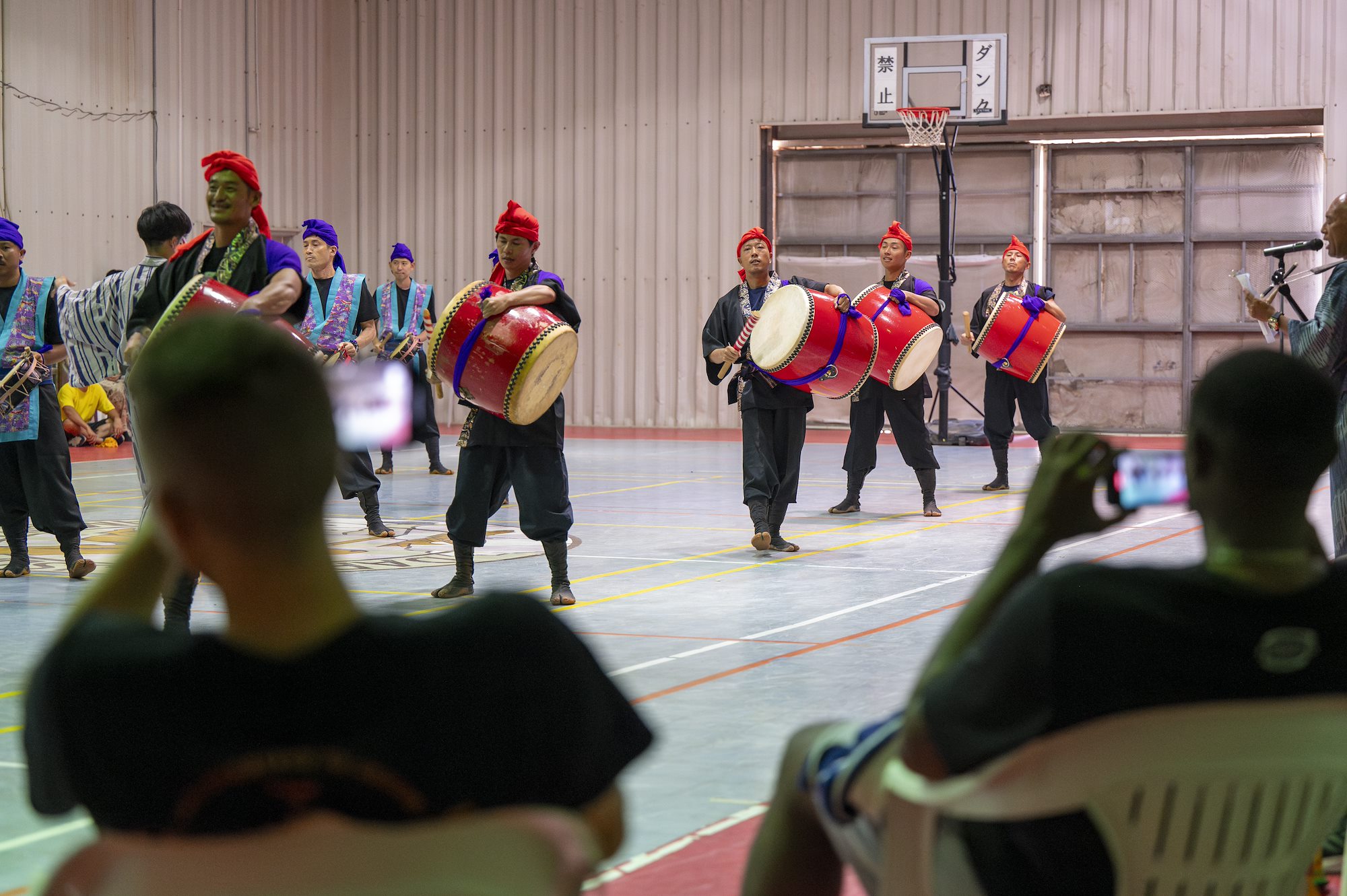 Taiko drum players from the Japan Self-Defense Forces base put on a cultural performance for U.S. service members at the Japanese base near Ambouli, Djibouti, August 19, 2023. Service members from the U.S. and Japan came together for sports-centered foreign engagement. (U.S. Army National Guard photo by Sgt. Jalen Miller)