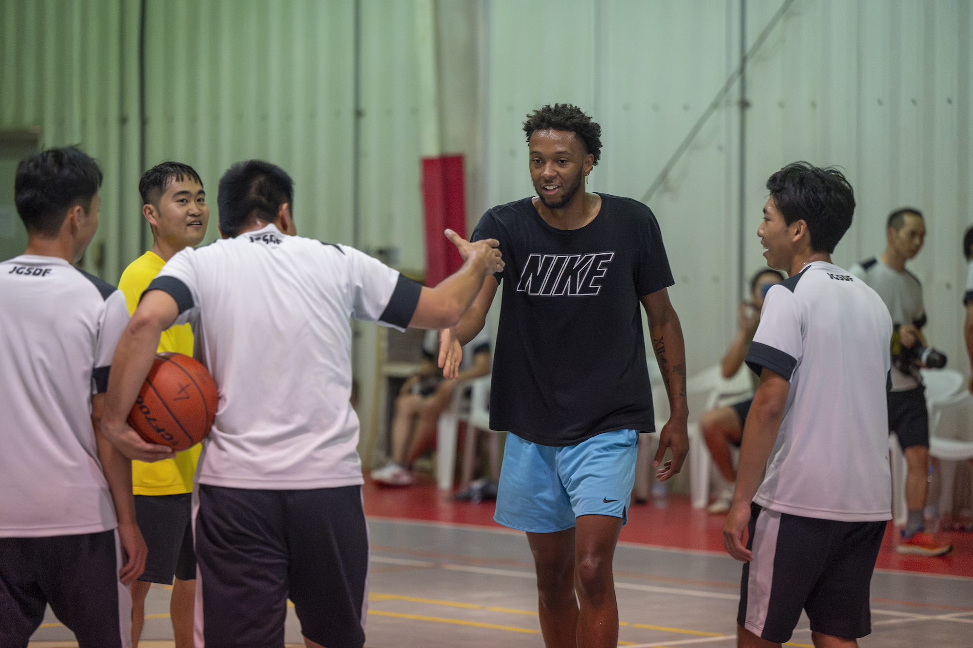 U.S. Army Sgt. James King, Combined Joint Task Force - Horn of Africa material management resource advisor, congratulates a Japanese service member for a basket he made during their game at the Japan Self-Defense Forces base near Ambouli, Djibouti, August 19, 2023. Service members from the U.S. and Japan came together for sports-centered foreign engagement. (U.S. Army National Guard photo by Sgt. Jalen Miller)