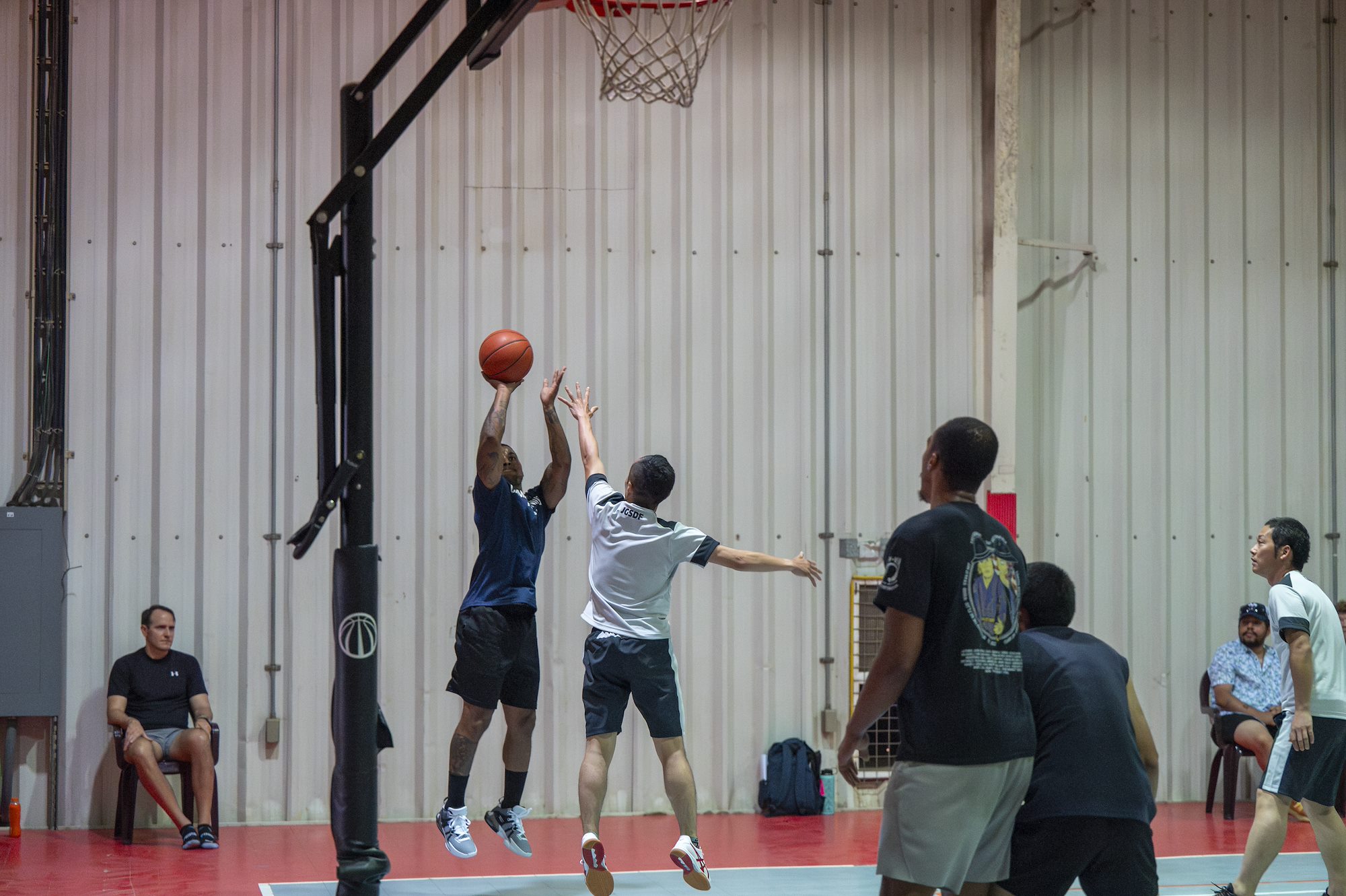 Combined Joint Task Force - Horn of Africa service members and Japan Self-Defense Forces play basketball together at the Japan Self-Defense Forces base near Ambouli, Djibouti, August 19, 2023. Service members from the U.S. and Japan came together for a sports-centered foreign engagement. (U.S. Army National Guard photo by Sgt. Jalen Miller)