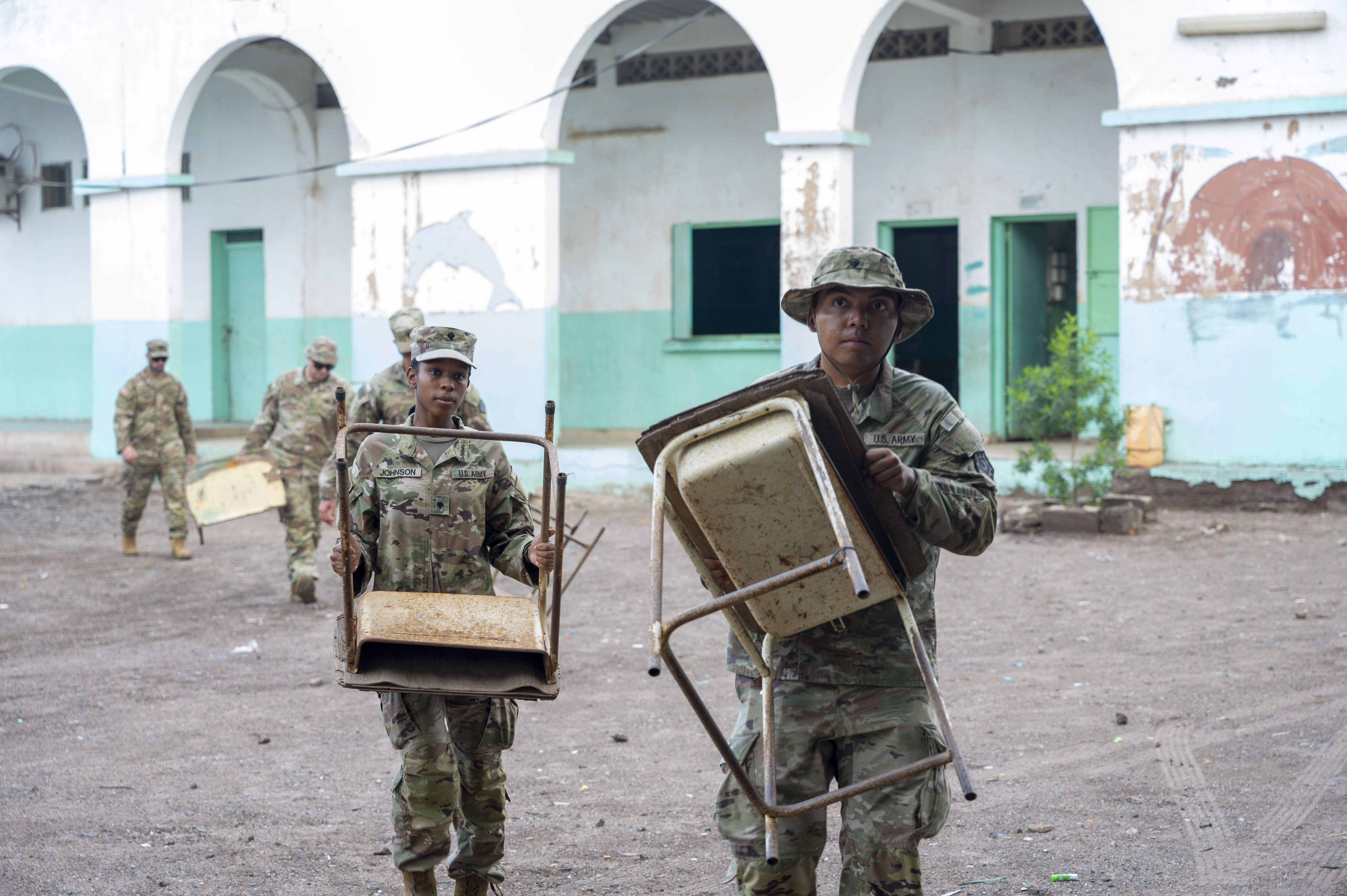 Combined Joint Task Force - Horn of Africa service members remove damaged desks from the Annex 3 School in Balbala, Djibouti on Oct. 29, 2023. The Civil Affairs East Africa Team and 1782nd Engineer Support Company lead CJTF-HOA’s desk rejuvenation effort for schools around Djibouti. (U.S. National Guard photo by Sgt. Jalen Miller)
