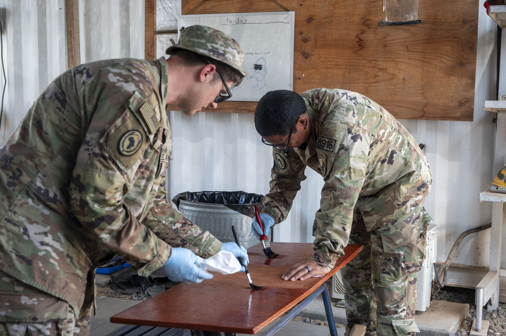 U.S. Army Sgt. Trey Jefferies and U.S. Army Sgt. Pedro Cruz, Combined Joint Task Force - Horn of Africa Civil Affairs East Africa team members, sand and paint refurbished desks at Camp Lemonnier, Djibouti Oct. 10, 2023. The desks were repaired by the 294th Engineer Support Company as a part of the CJTF-HOA led Desk Rejuvenation Project. (U.S. Army National Guard photo by Sgt. Jalen Miller)