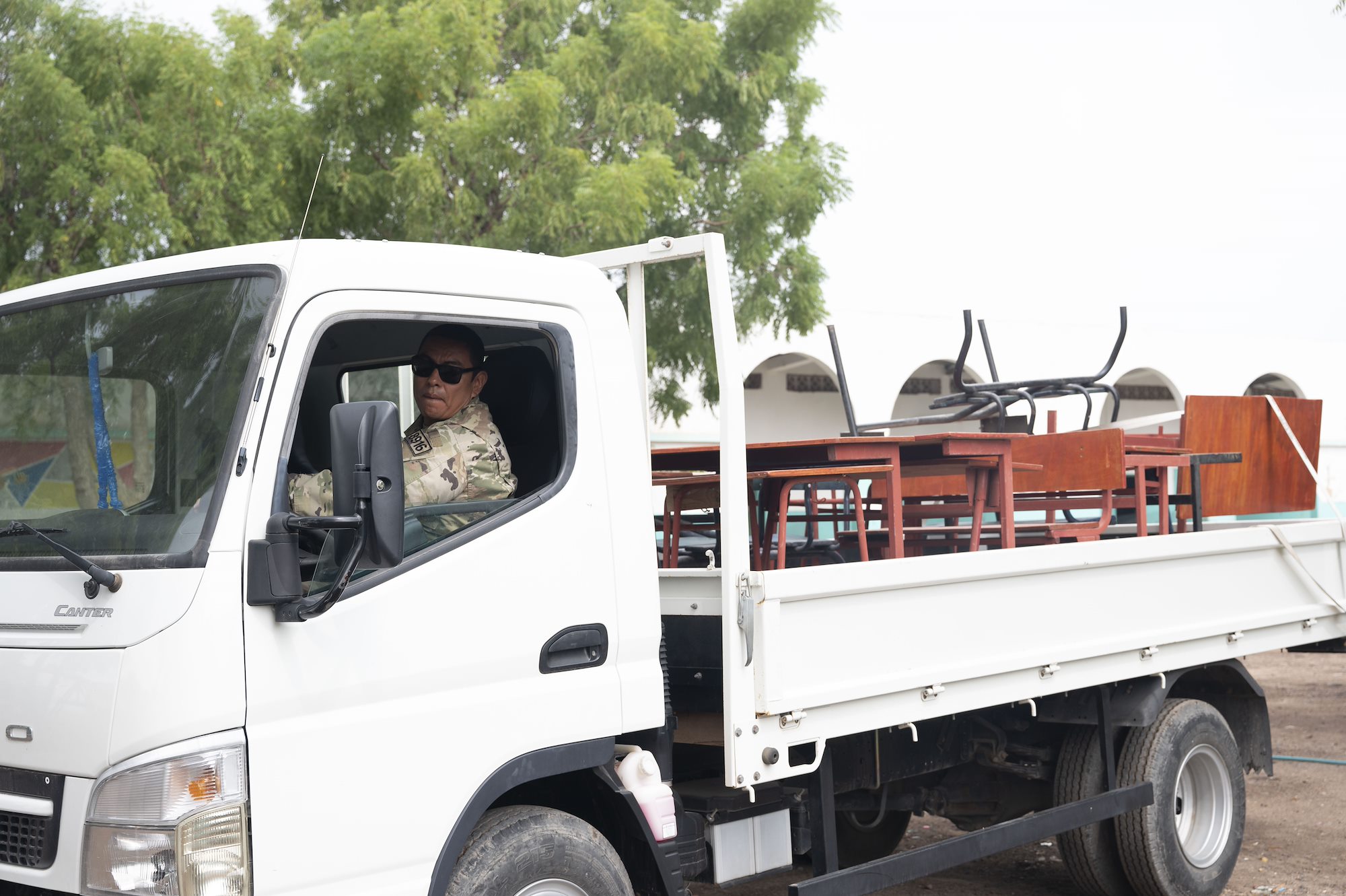 U.S. Army Sgt. Pedro Cruz, a CJTF-HOA Civil Affairs East Africa team member, delivers refurbished desks at the Annex 3 School in Balbala, Djibouti Oct. 29. 2023. The Civil Affairs East Africa Team and 1782nd Engineer Support Company refurbishes desks and chairs as part of an ongoing project with local Djiboutian schools. (U.S. National Guard photo by Sgt. Jalen Miller)