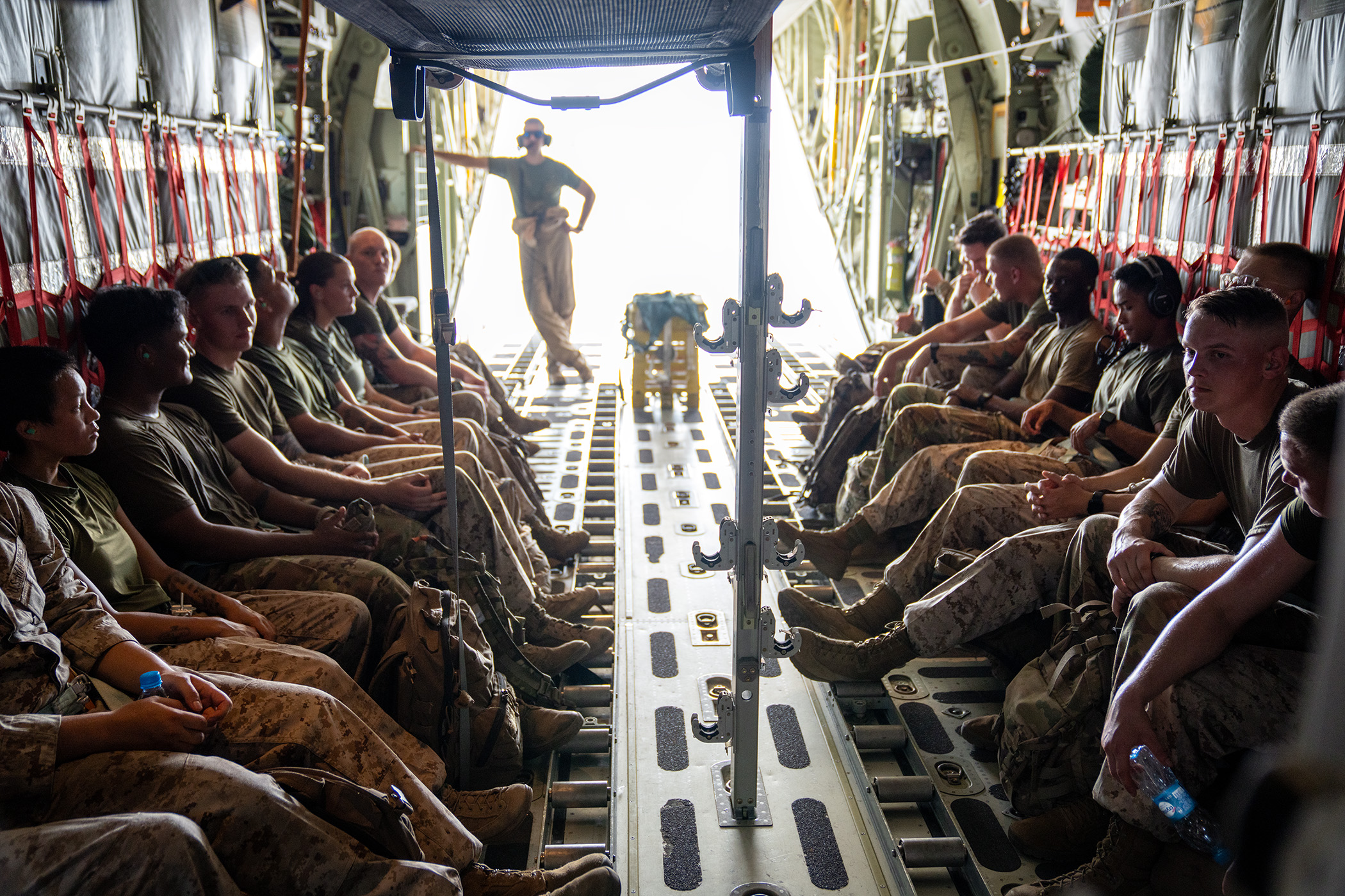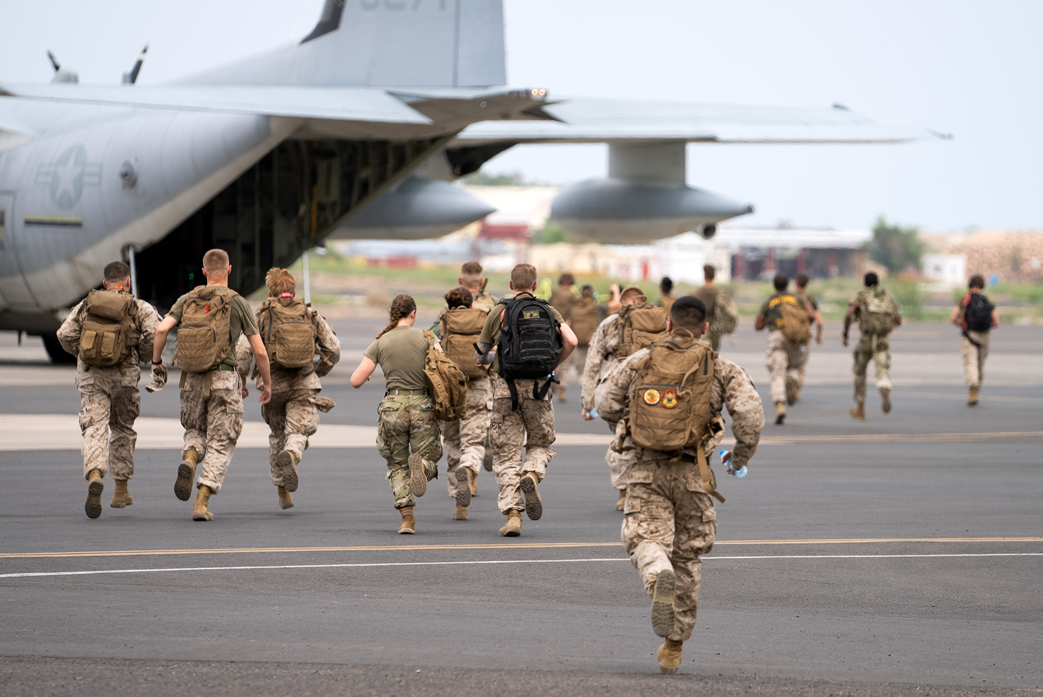 Marines hike across Camp Lemonnier while carrying their brothers and sisters in arms on their backs. They move between locations, setting up radios and providing simulated aid to their counterparts. They run across the tarmac to board a military aircraft for a simulated evacuation. These practical exercises test the skills and fortitude of service members going through the latest Corporals Course, which began Oct. 22, 2023.