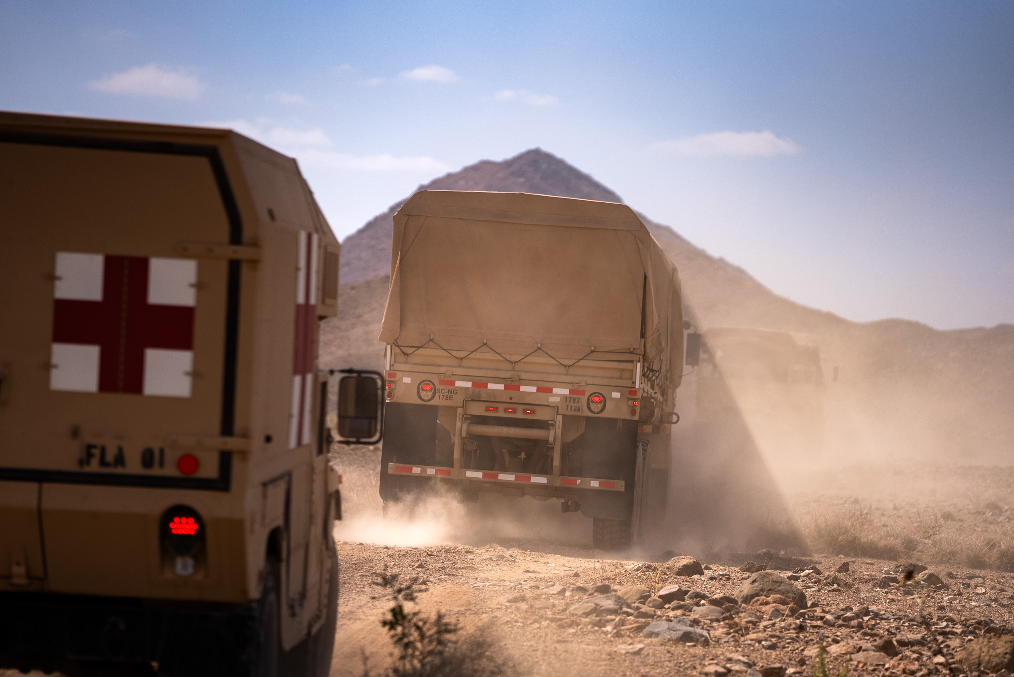 A convoy of American troop carriers drives through the dusty terrain during Exercise Wakri near Ali Sabieh, Djibouti, Dec. 5, 2023. The convoy went between locations in rural Djibouti to set up temporary camps for members in the exercise. (Department of Defense photo by U.S. Air Force Staff Sgt. Dylan Gentile)