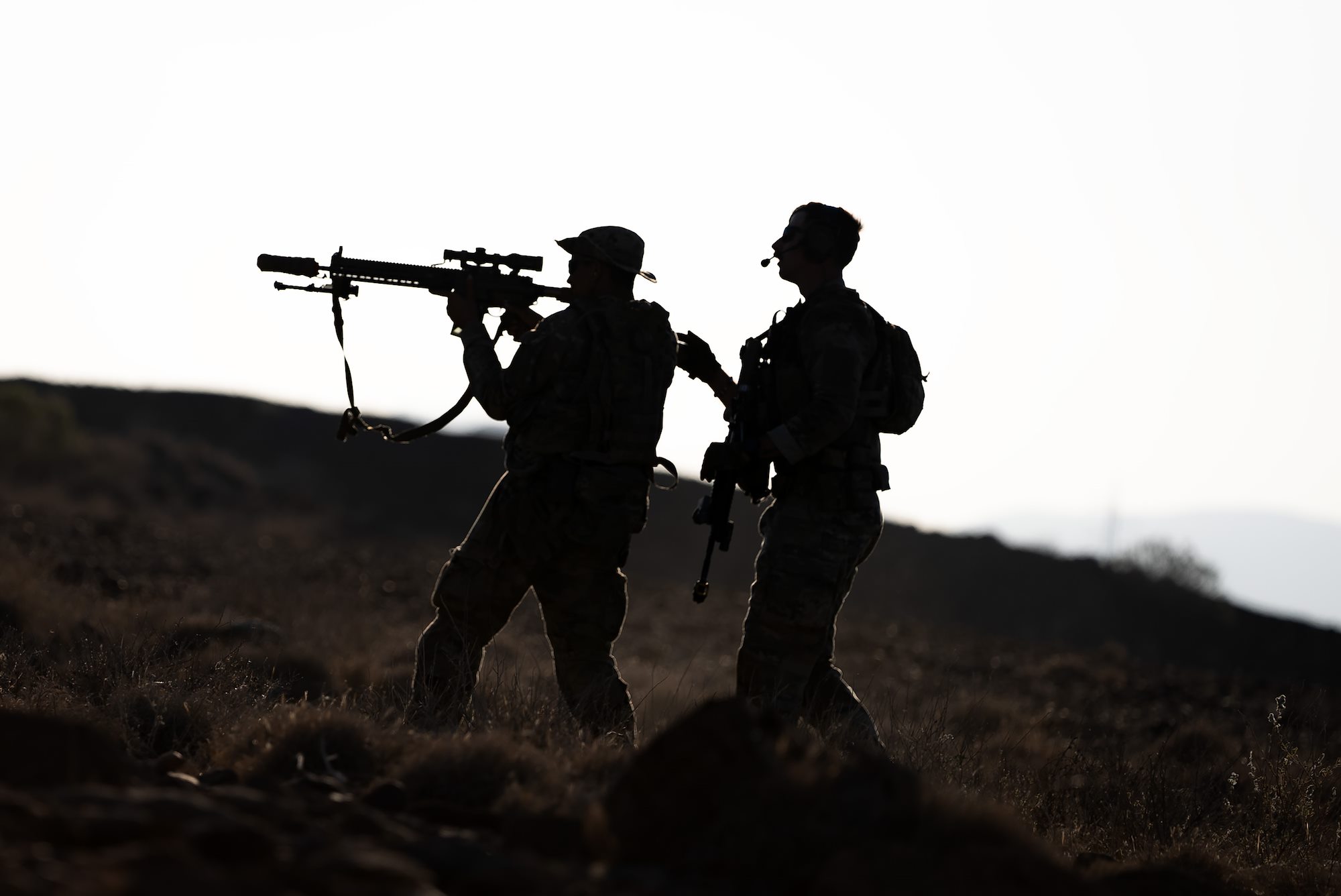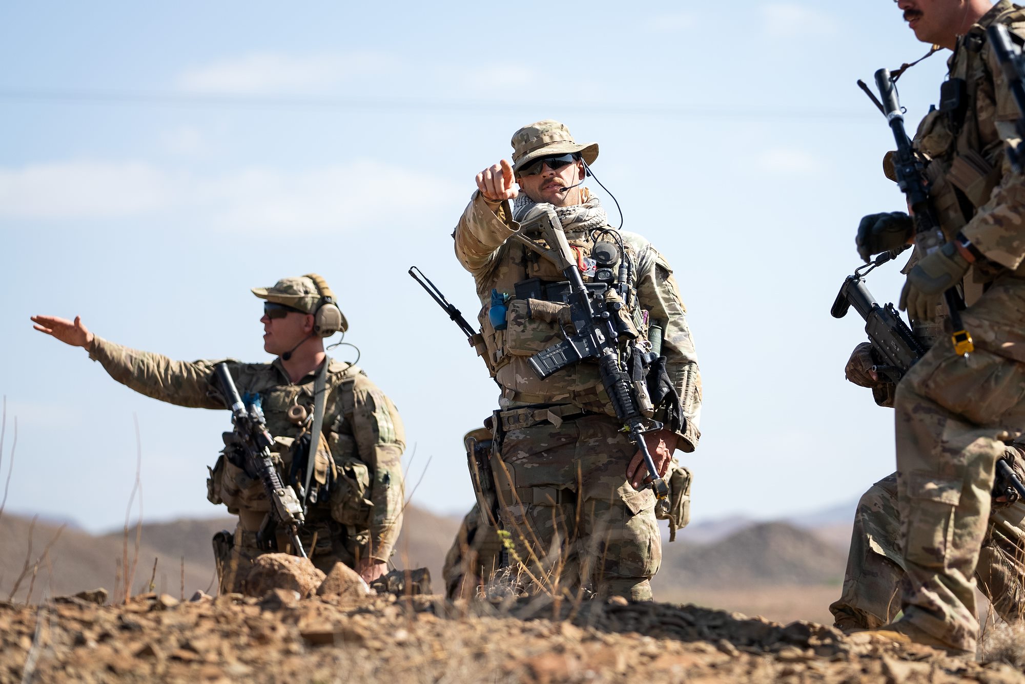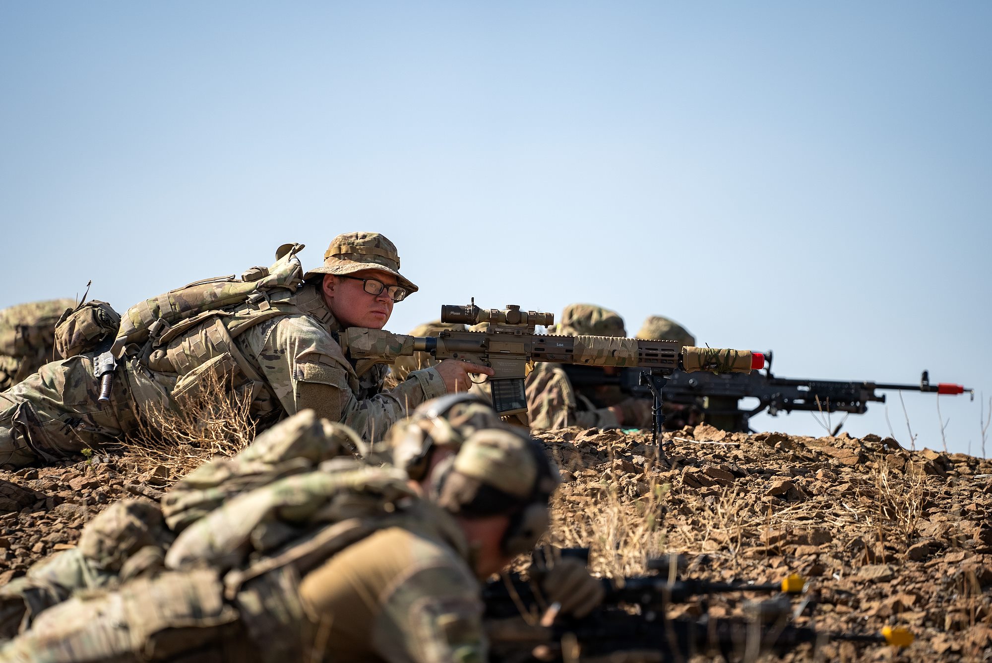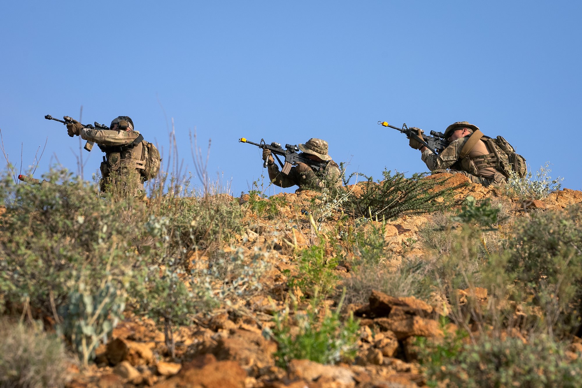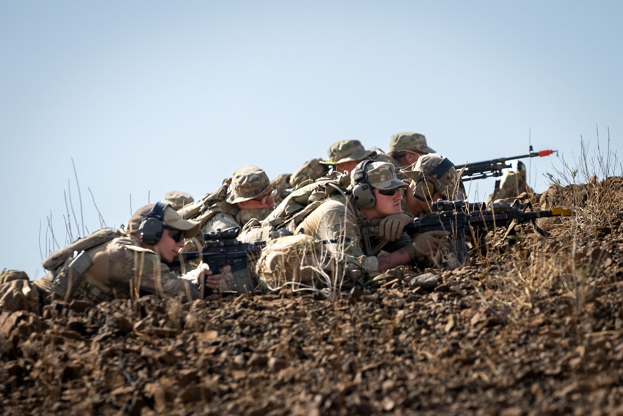 Task Force Tomahawk soldiers perch on a hilltop and hold a defensive position during Exercise Wakri near Dikhill, Djibouti, Dec. 4, 2023. (Department of Defense photo by U.S. Air Force Staff Sgt. Dylan Gentile)